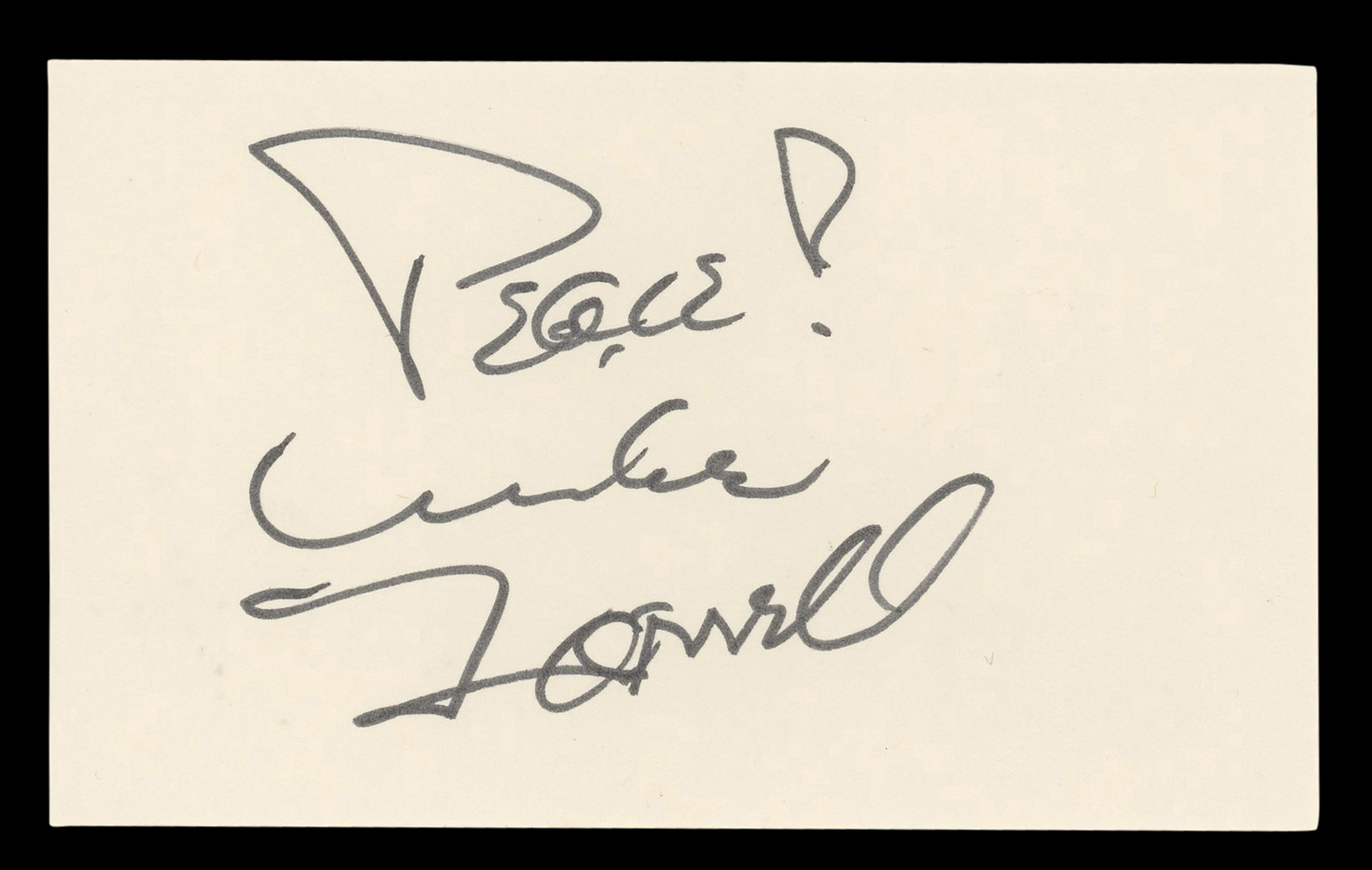 This Autographed 3x5 Index Card with the inscription of "Peace!" has been Personally Signed by Mike Farrell of MASH. This item is 100% Authentic to include a hologram by Beckett Authentication Services. This item will come with an affixed Beckett Authentication Services (BAS) authentication sticker, which includes a scannable QR code to verify authenticity. Please note that Beckett no longer provides serial-numbered COA cards, and the attached BAS sticker will serve as the complete authentication for this item. The authenticity can be verified on Beckett Authentication Services website.