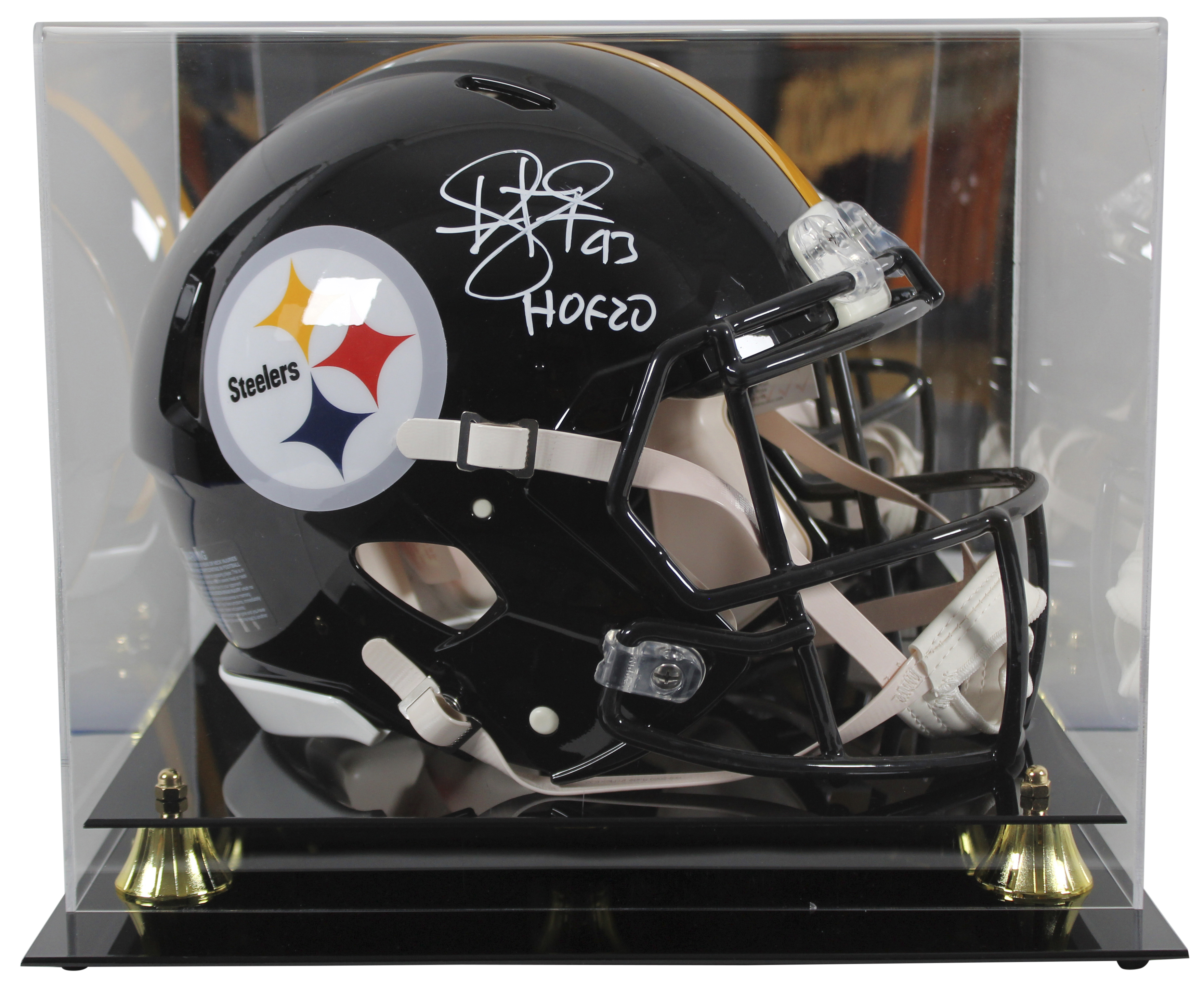 This Autographed Full Size Speed Proline Helmet W/ Uv Mirrored Back Acrylic Display Case with the inscription of "HOF 20" has been Personally Signed by Troy Polamalu of the Pittsburgh Steelers. This item is 100% Authentic to include a Certificate of Authenticity (COA) / hologram by Beckett Authentication Services. This is a BAS Witnessed Protection Program item which means a Beckett Authentication Service representative was present when this item was being signed. We conducted an autograph signing with Troy Polamalu where multiples of the same item were signed. While the photographs are representative of this item, the size, placement and strength of the signature may vary. Each item is hand signed, therefore, each autograph is unique. This item can be verified through BAS Witnessed.