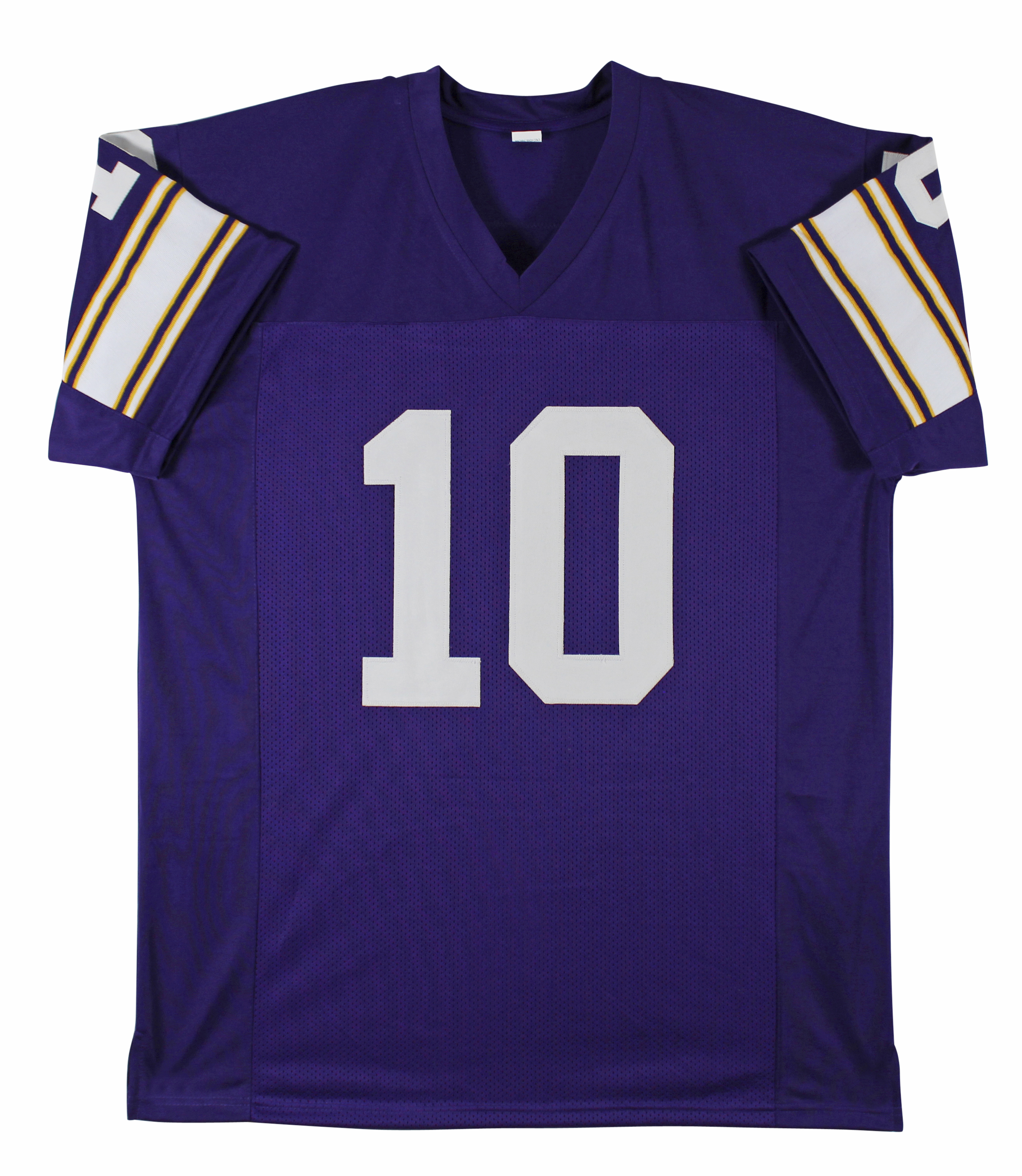 This Autographed Purple Pro Style Jersey with the inscription of "HOF 86" has been Personally Signed by Fran Tarkenton of the Minnesota Vikings. This item is 100% Authentic to include a hologram by Beckett Authentication Services. This item will come with an affixed Beckett Authentication Services (BAS) authentication sticker, which includes a scannable QR code to verify authenticity. Please note that Beckett no longer provides serial-numbered COA cards, and the attached BAS sticker will serve as the complete authentication for this item. This is a BAS Witnessed Protection Program item which means a Beckett Authentication Service representative was present when this item was being signed. We have multiples of this same item. While the photographs are representative of this item, the size, placement and strength of the signature may vary. Each item is hand signed, therefore, each autograph is unique. This is a X-Large sized, non-branded, custom-stitched Jersey.