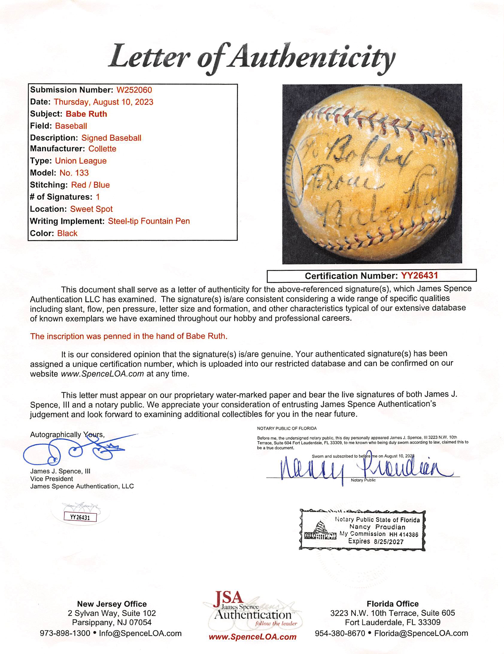 This Autographed Union League Baseball with the inscription of "To Bobby, From" has been Personally Signed by Babe Ruth of the New York Yankees. This item is 100% Authentic to include a Certificate of Authenticity (COA) / hologram by JSA. The authenticity can be verified on JSA website.