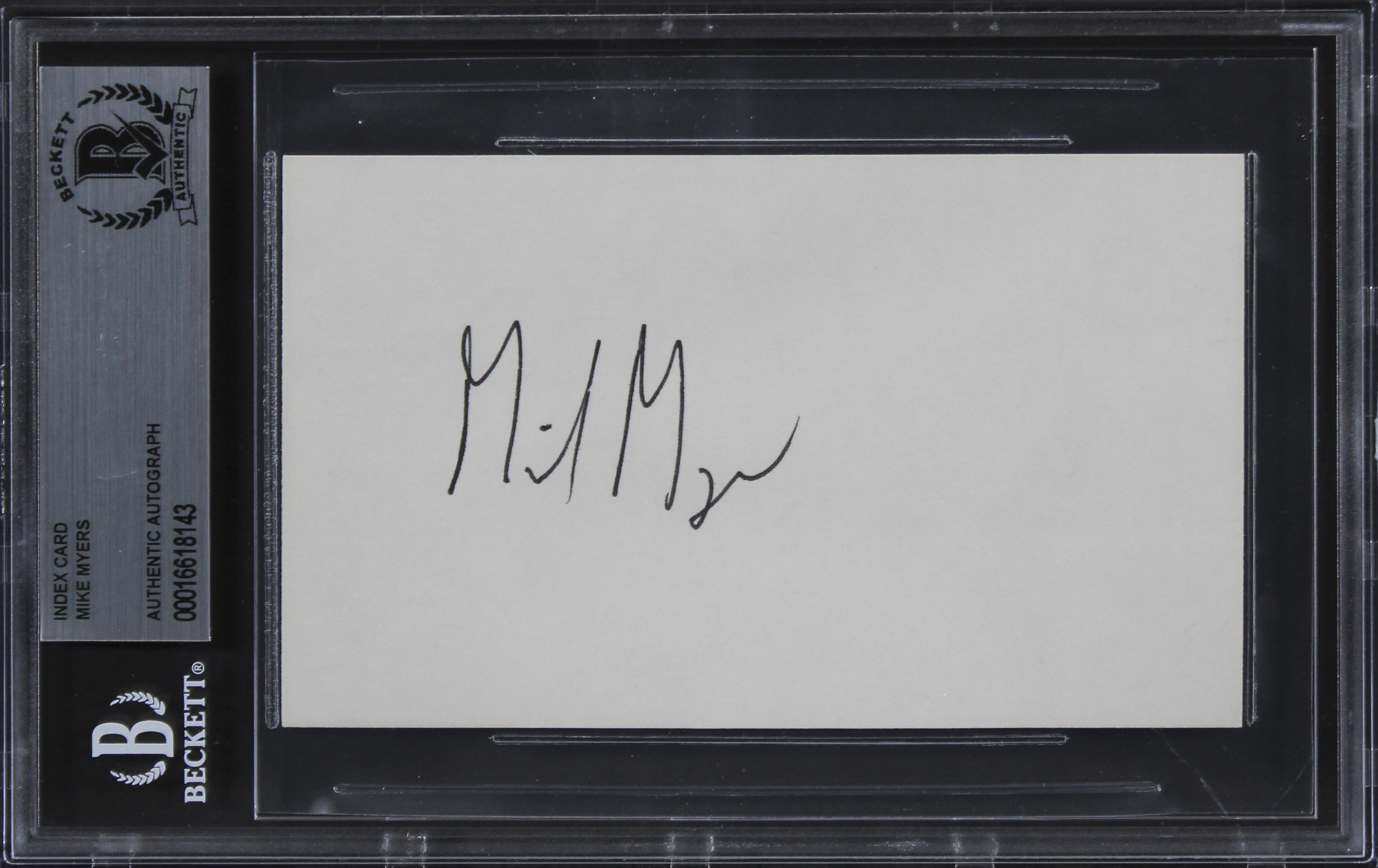 This Autographed 3x5 Index Card has been Personally Signed by Mike Myers of Austin Powers. This item is 100% Authentic, it comes slabbed and authenticated by Beckett Authentication Services. We have multiples of this same item. While the photographs are representative of this item, the size, placement and strength of the signature may vary. Each item is hand signed, therefore, each autograph is unique.