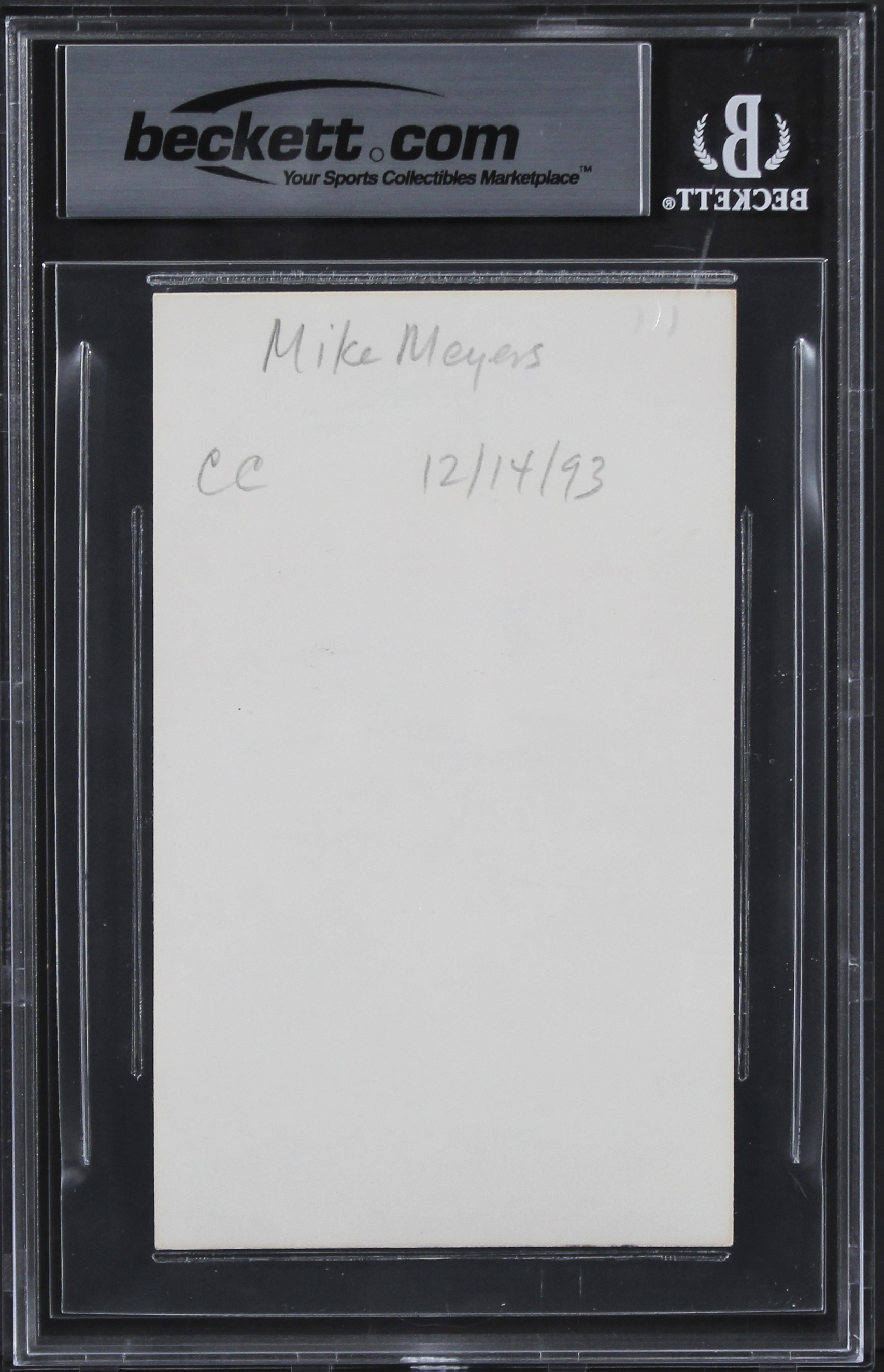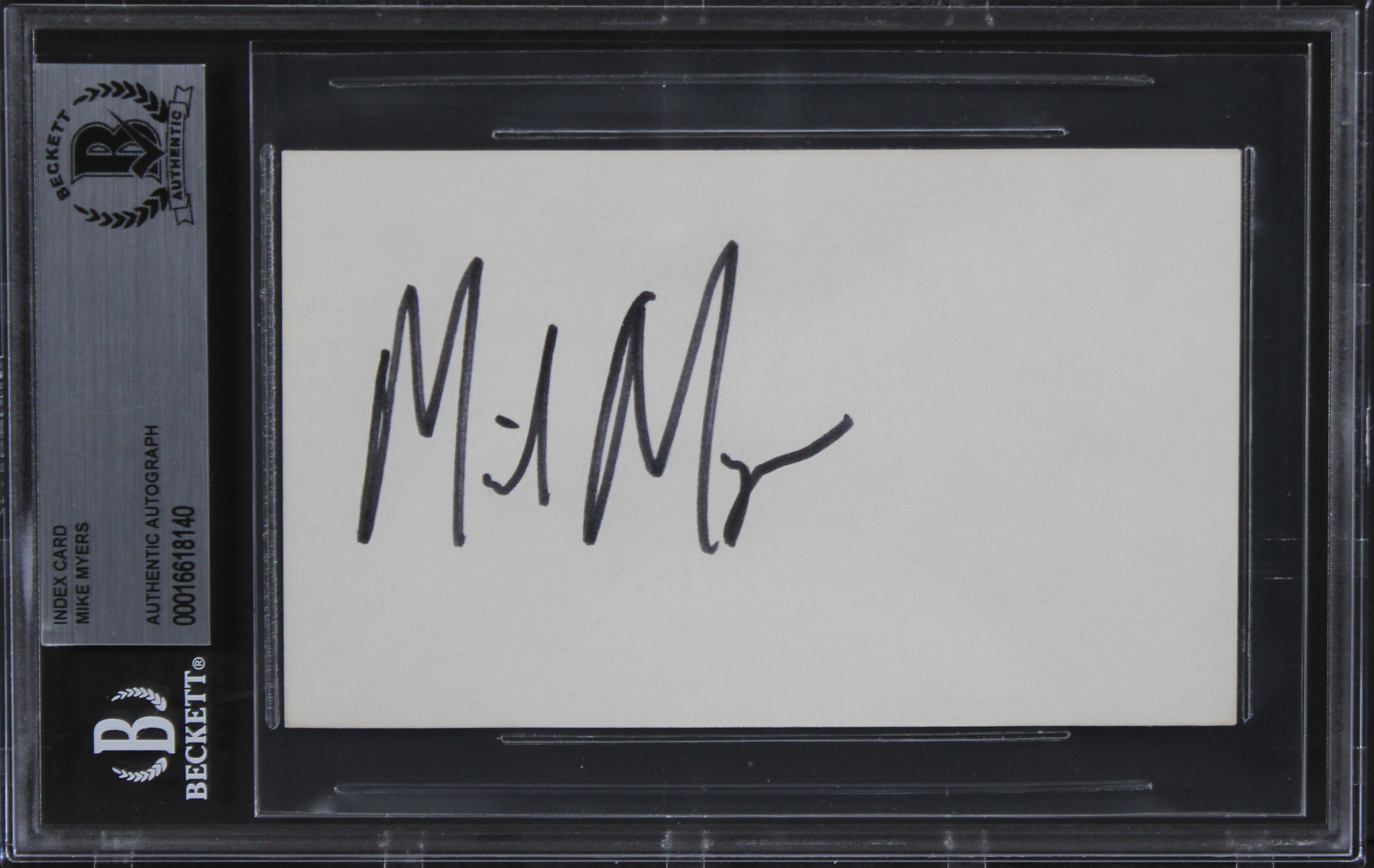 This Autographed 3x5 Index Card has been Personally Signed by Mike Myers of Austin Powers. This item is 100% Authentic, it comes slabbed and authenticated by Beckett Authentication Services. We have multiples of this same item. While the photographs are representative of this item, the size, placement and strength of the signature may vary. Each item is hand signed, therefore, each autograph is unique.