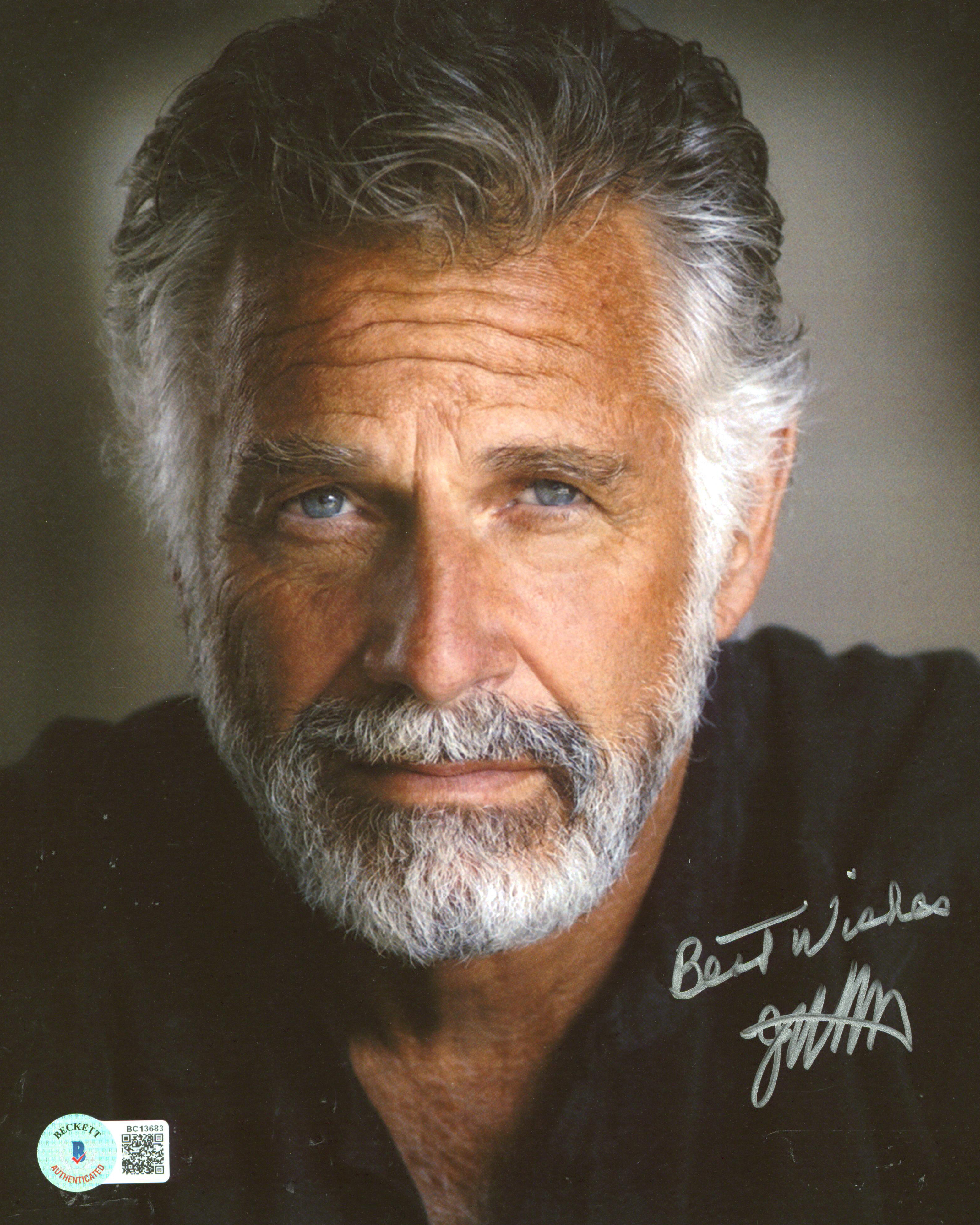 This Autographed 8x10 Photo with the inscription of "Best Wishes" has been Personally Signed by Jonathan Goldsmith of The Most Interesting Man in the World. This item is 100% Authentic to include a Certificate of Authenticity (COA) / hologram by Beckett Authentication Services. The authenticity can be verified on Beckett Authentication Services website. There is evidence of inscription removal. Please refer to the high resolution scan for photo condition.