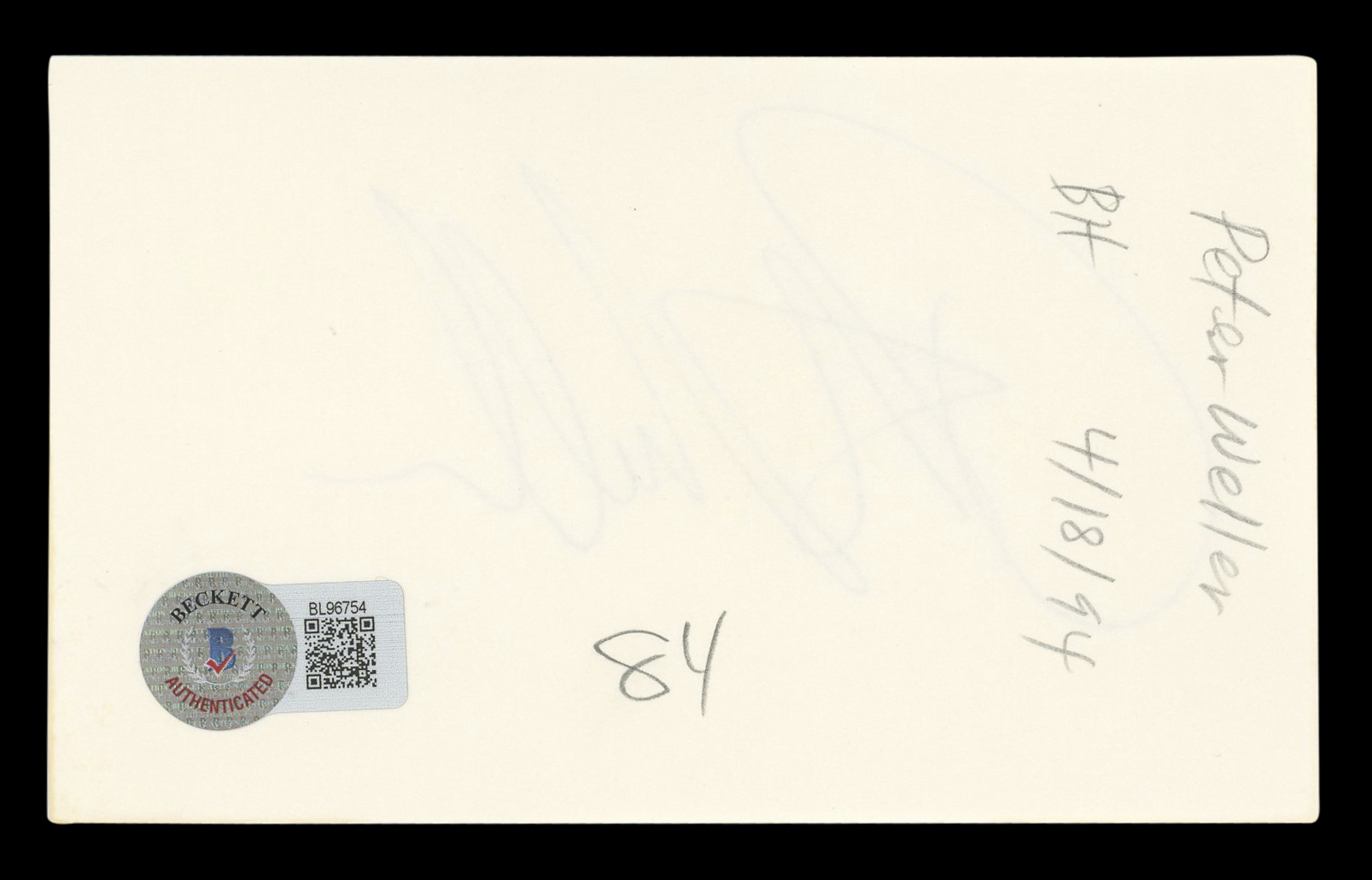This Autographed 3x5 Index Card has been Personally Signed by Peter Weller of RoboCop. This item is 100% Authentic to include a hologram by Beckett Authentication Services. This item will come with an affixed Beckett Authentication Services (BAS) authentication sticker, which includes a scannable QR code to verify authenticity. Please note that Beckett no longer provides serial-numbered COA cards, and the attached BAS sticker will serve as the complete authentication for this item. The authenticity can be verified on Beckett Authentication Services website.