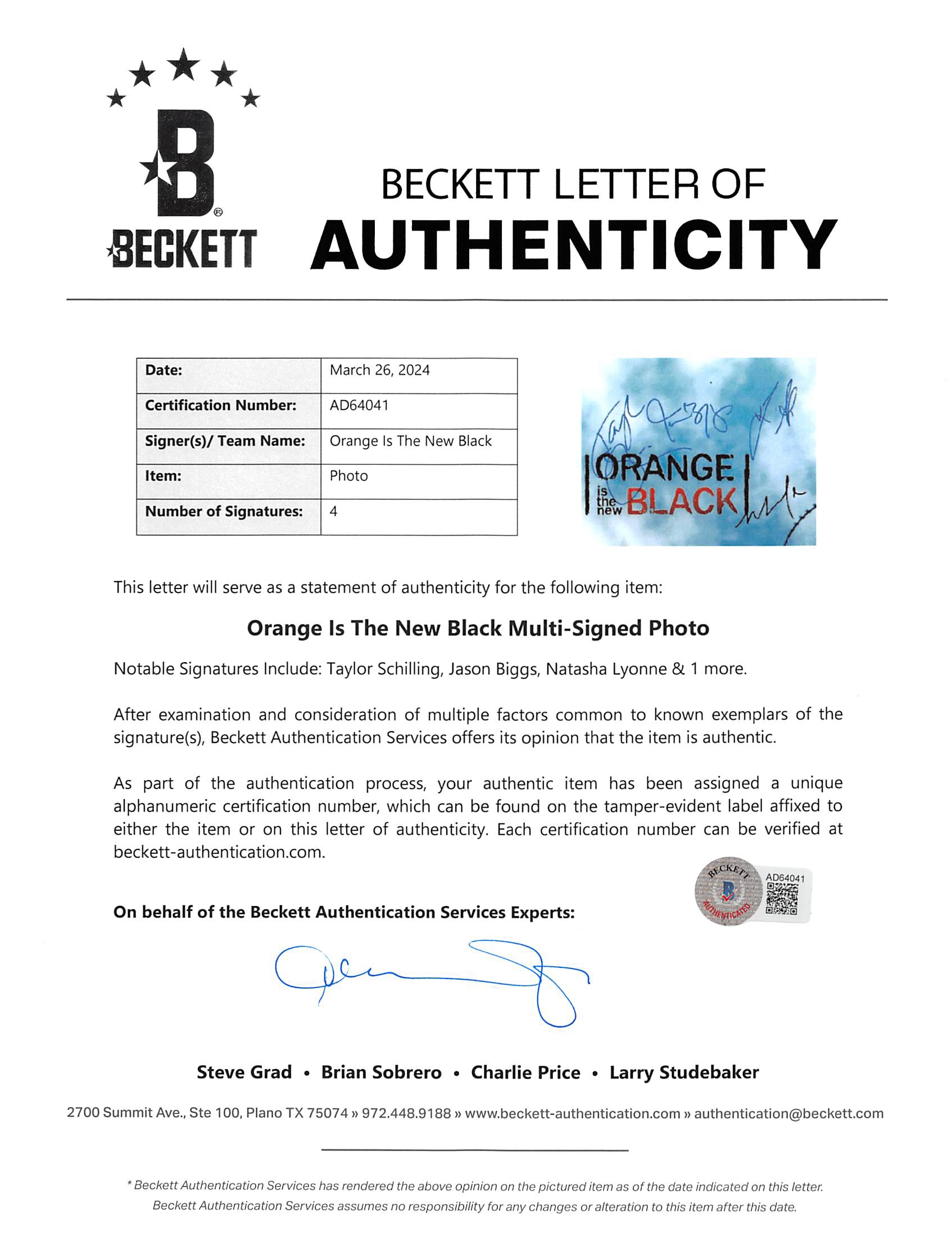 This Autographed 8x10 Photo has been Personally Signed by Taylor Schilling, Jason Biggs, Natasha Lyonne & 1 More of Orange is the New Black. This item is 100% Authentic to include a hologram by Beckett Authentication Services. This item will come with an affixed Beckett Authentication Services (BAS) authentication sticker, which includes a scannable QR code to verify authenticity. Please note that Beckett no longer provides serial-numbered COA cards, and the attached BAS sticker will serve as the complete authentication for this item. The authenticity can be verified on Beckett Authentication Services website.