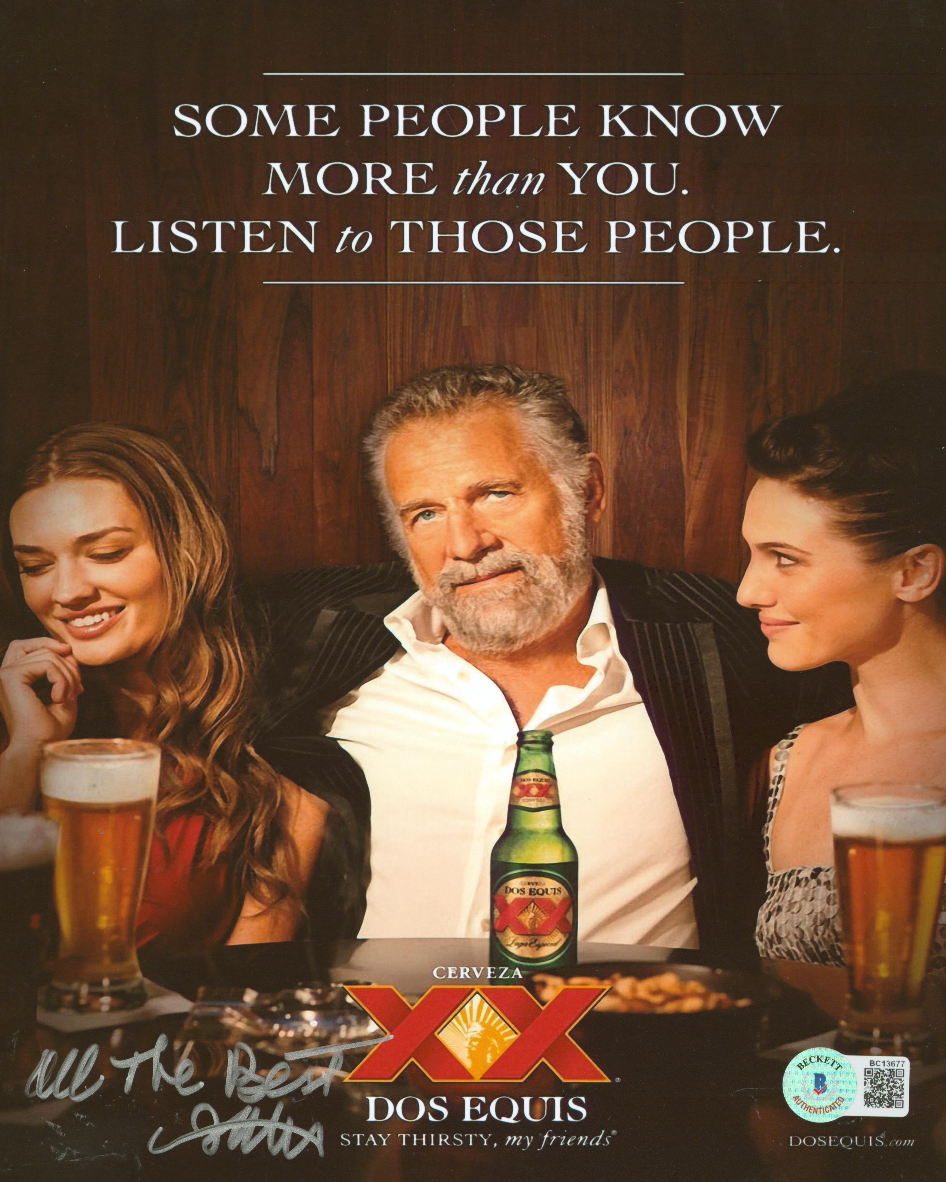 This Autographed 8x10 Photo with the inscription of "All The Best" has been Personally Signed by Jonathan Goldsmith of The Most Interesting Man in the World. This item is 100% Authentic to include a Certificate of Authenticity (COA) / hologram by Beckett Authentication Services. The authenticity can be verified on Beckett Authentication Services website. There is evidence of inscription removal. Please refer to the high resolution scan for photo condition.