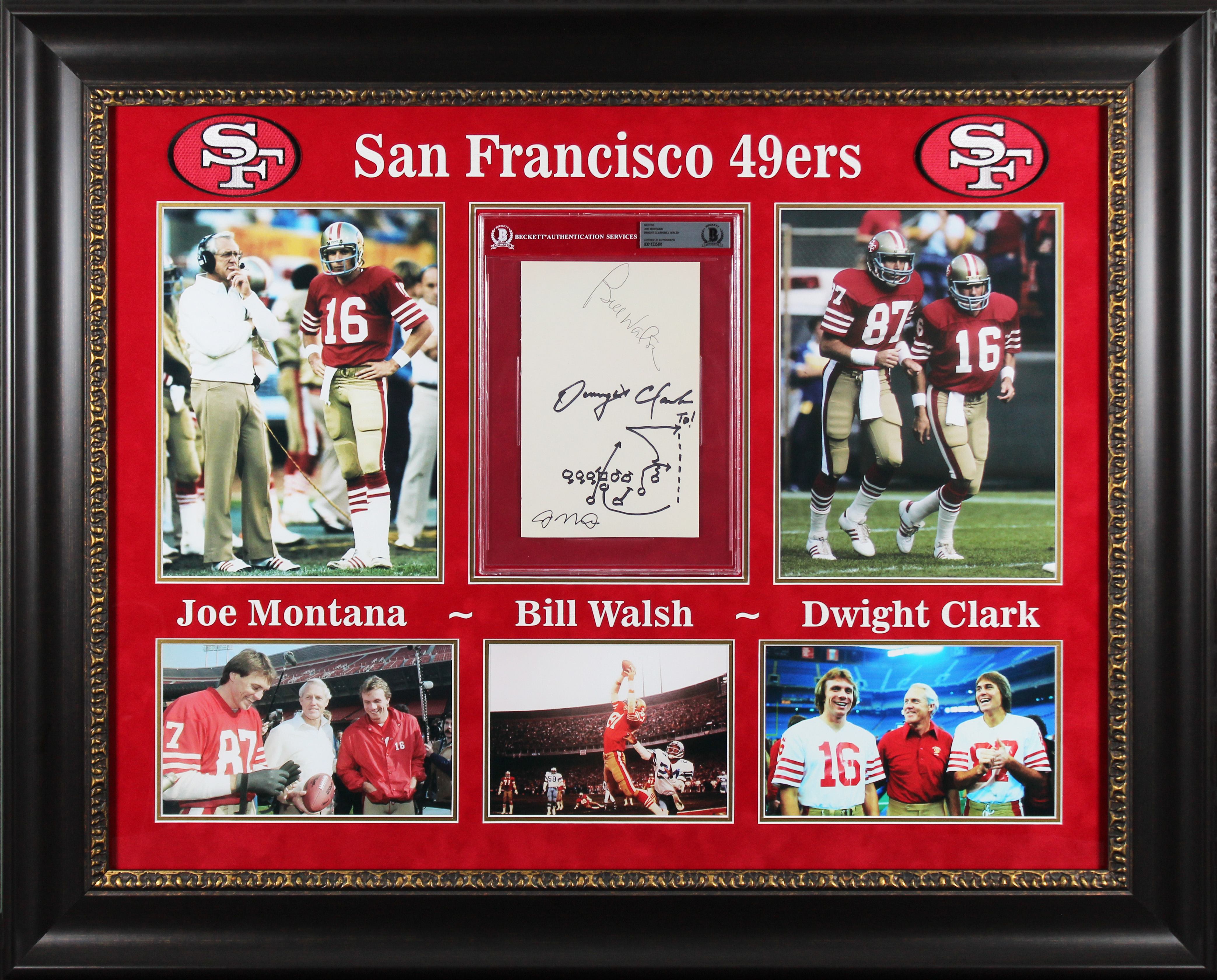 This Autographed w/ Hand Drawn Play (Clark) & Framed 6x9.75 Cut Signature has been Personally Signed by Joe Montana, Bill Walsh & Dwight Clark of the San Francisco 49ers. This item is 100% Authentic, it comes slabbed and authenticated by Beckett Authentication Services. The authenticity can be verified on Beckett Authentication Services website. This item has been professionally framed to overall dimensions of approximately 32.5 x 40.5 inches.