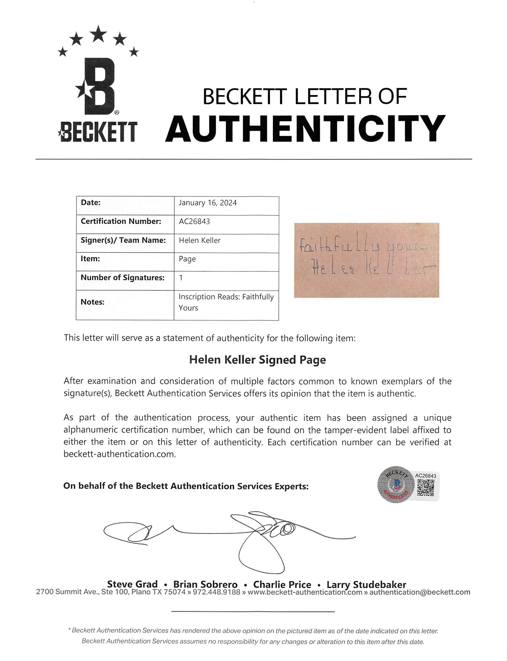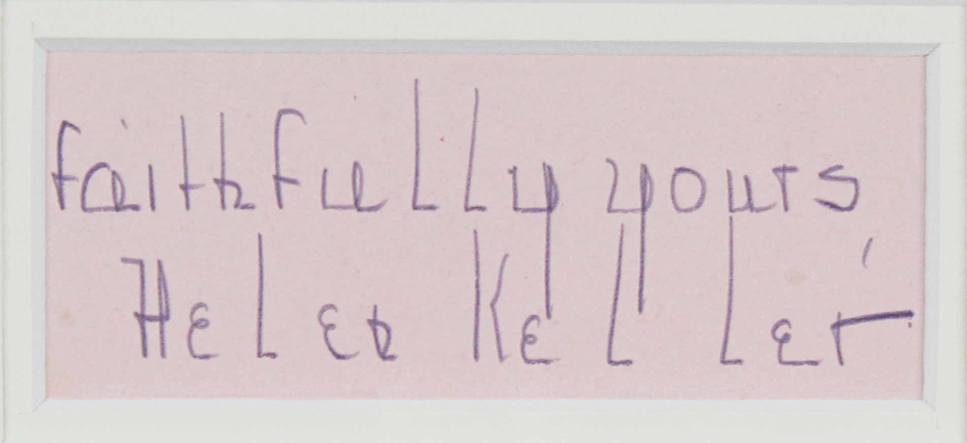 This Autographed & Framed 1.5x3.5 Cut Signature with the inscription of "Faithfully Yours" has been Personally Signed by Helen Keller. This item is 100% Authentic to include a Certificate of Authenticity (COA) / hologram by Beckett Authentication Services. The authenticity can be verified on Beckett Authentication Services website. This item has been professionally framed to overall dimensions of approximately 28.5 x 33.5 inches.