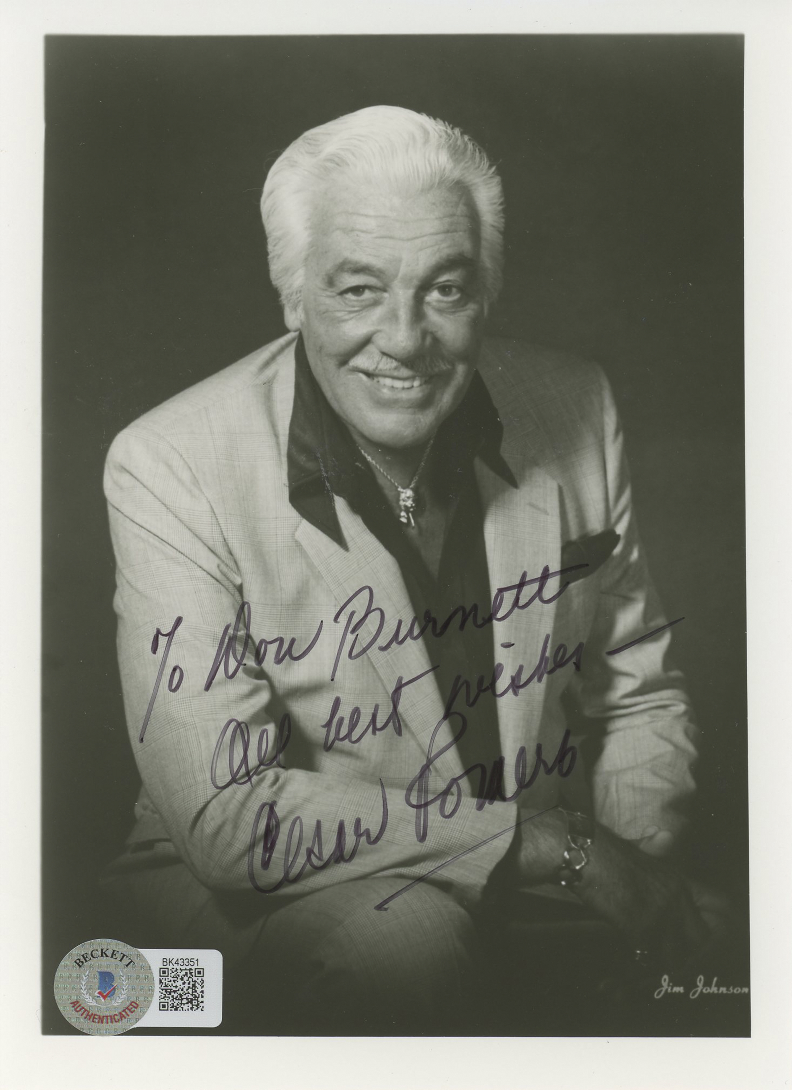 This Autographed 5x7 Photo with the inscription of "To Don Burnett All Best Wishes" has been Personally Signed by Cesar Romero of Batman. This item is 100% Authentic to include a hologram by Beckett Authentication Services. This item will come with an affixed Beckett Authentication Services (BAS) authentication sticker, which includes a scannable QR code to verify authenticity. Please note that Beckett no longer provides serial-numbered COA cards, and the attached BAS sticker will serve as the complete authentication for this item. The authenticity can be verified on Beckett Authentication Services website.