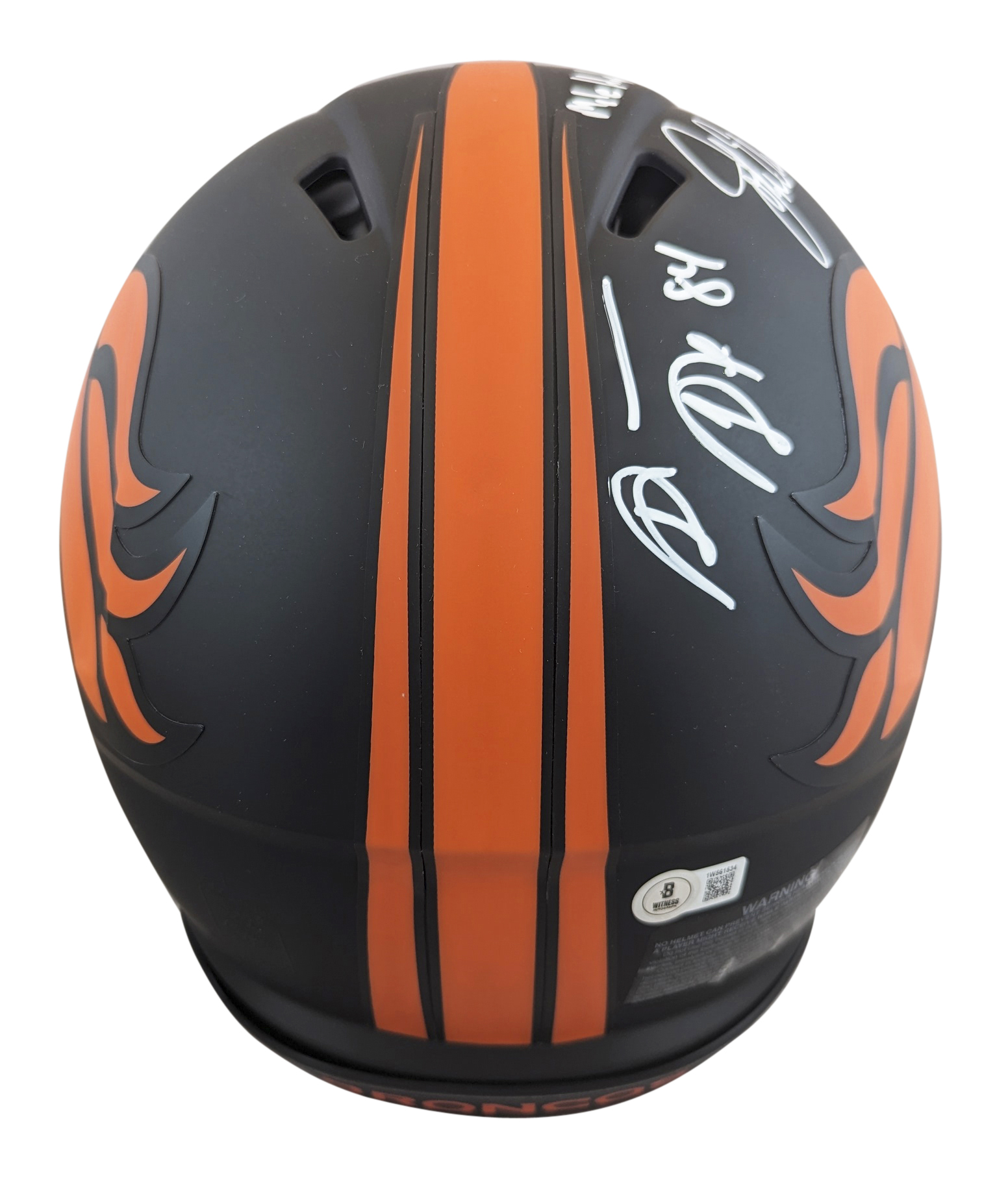 This Autographed Alternate Eclipse Riddell Authentic Full Size Speed Proline Helmet with the inscription of "Back 2 Back Champs (Smith), Mile High Salute (McCaffrey)" has been Personally Signed by John Elway, Shannon Sharpe Ed McCaffrey & Rod Smith of the Denver Broncos. This item is 100% Authentic to include a hologram by Beckett Authentication Services. This item will come with the new Beckett Authentication hologram that has a scannable QR code rather than the traditional COA. If you would like to have a COA, you are welcome to reach out to Beckett for a printed certification once you receive your item. This is a BAS Witnessed Protection Program item which means a Beckett Authentication Service representative was present when this item was being signed. We conducted an autograph signing with John Elway, Shannon Sharpe Ed McCaffrey & Rod Smith where multiples of the same item were signed. While the photographs are representative of this item, the size, placement and strength of the signature may vary. Each item is hand signed, therefore, each autograph is unique. This item can be verified through BAS Witnessed.