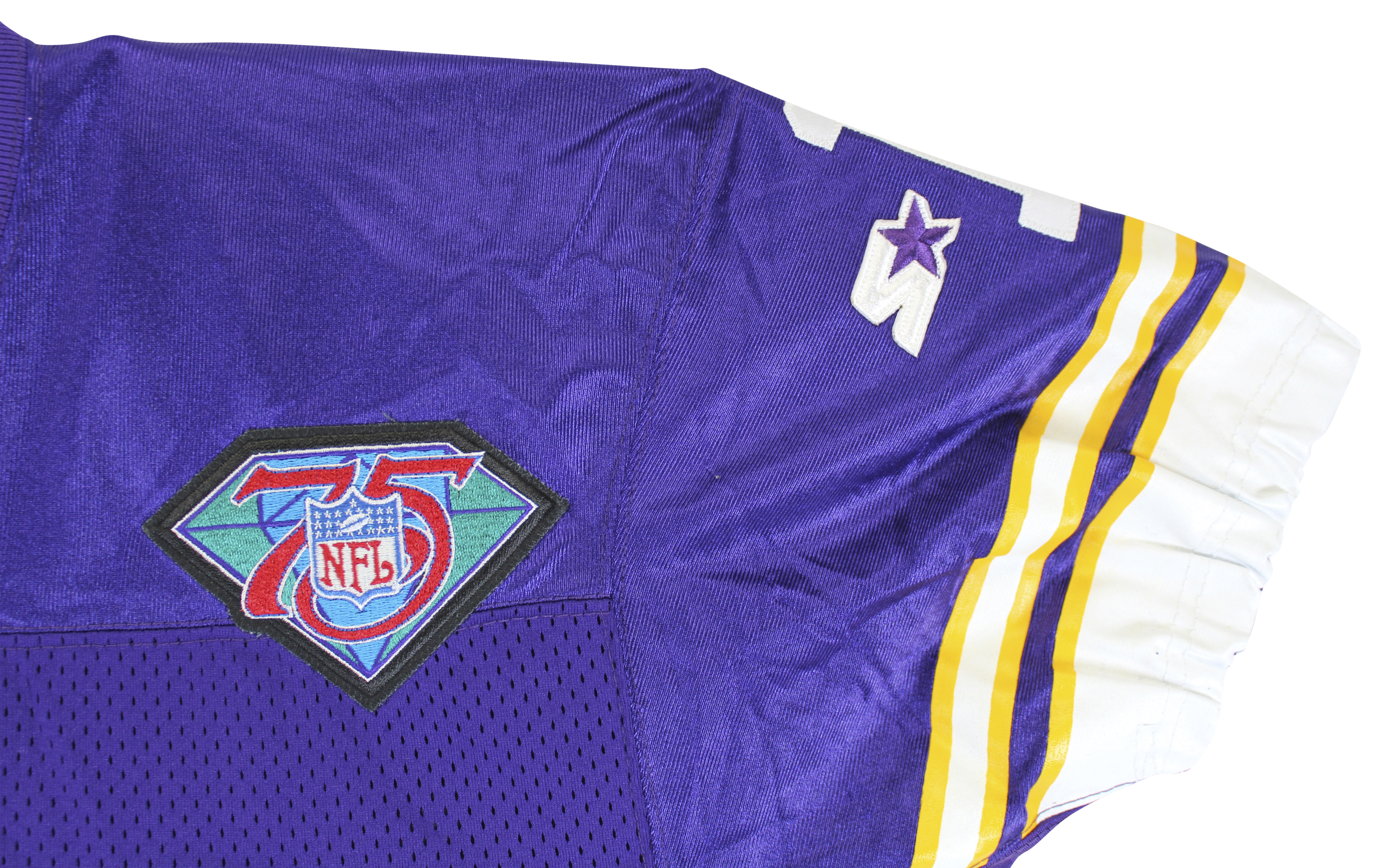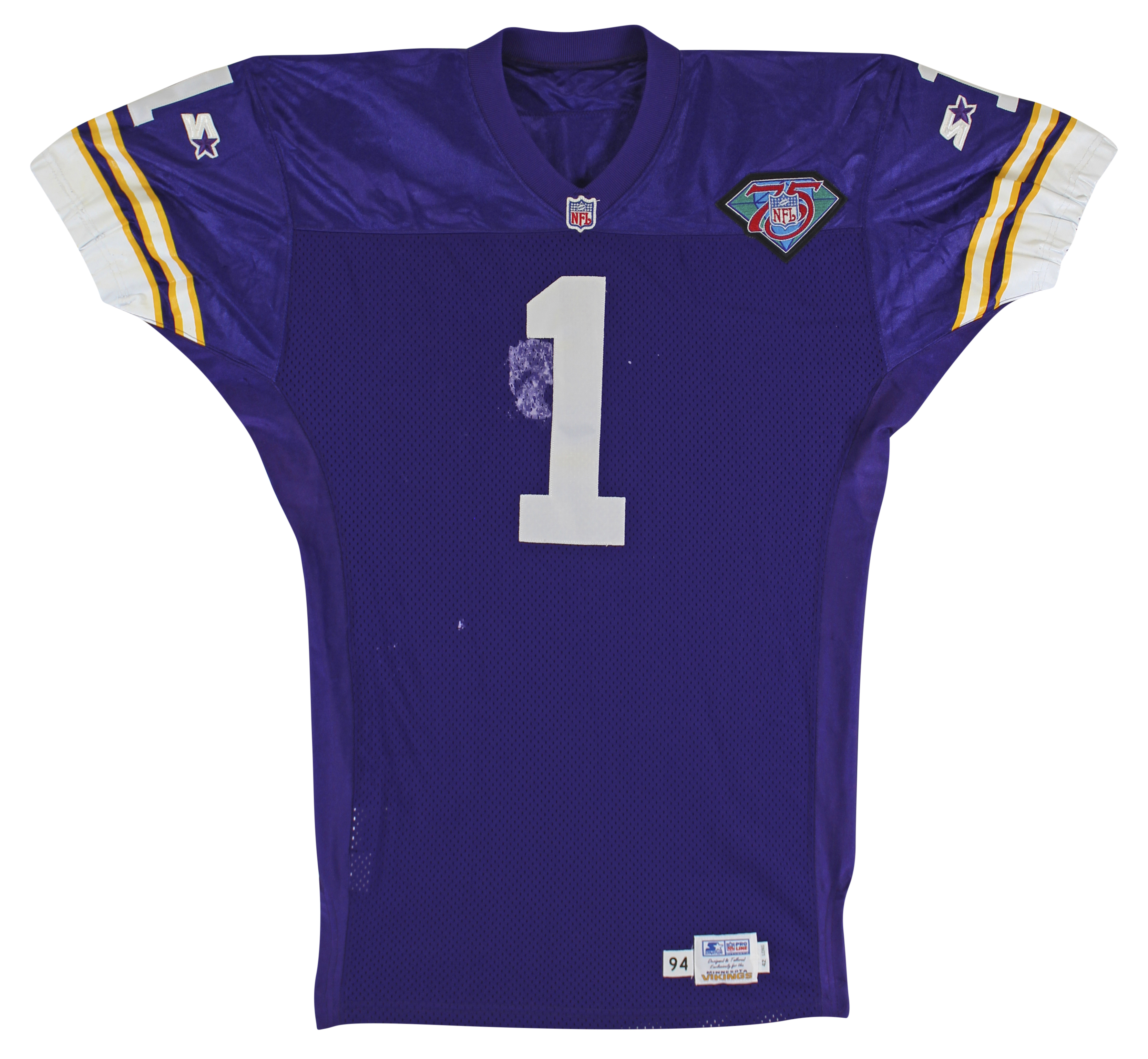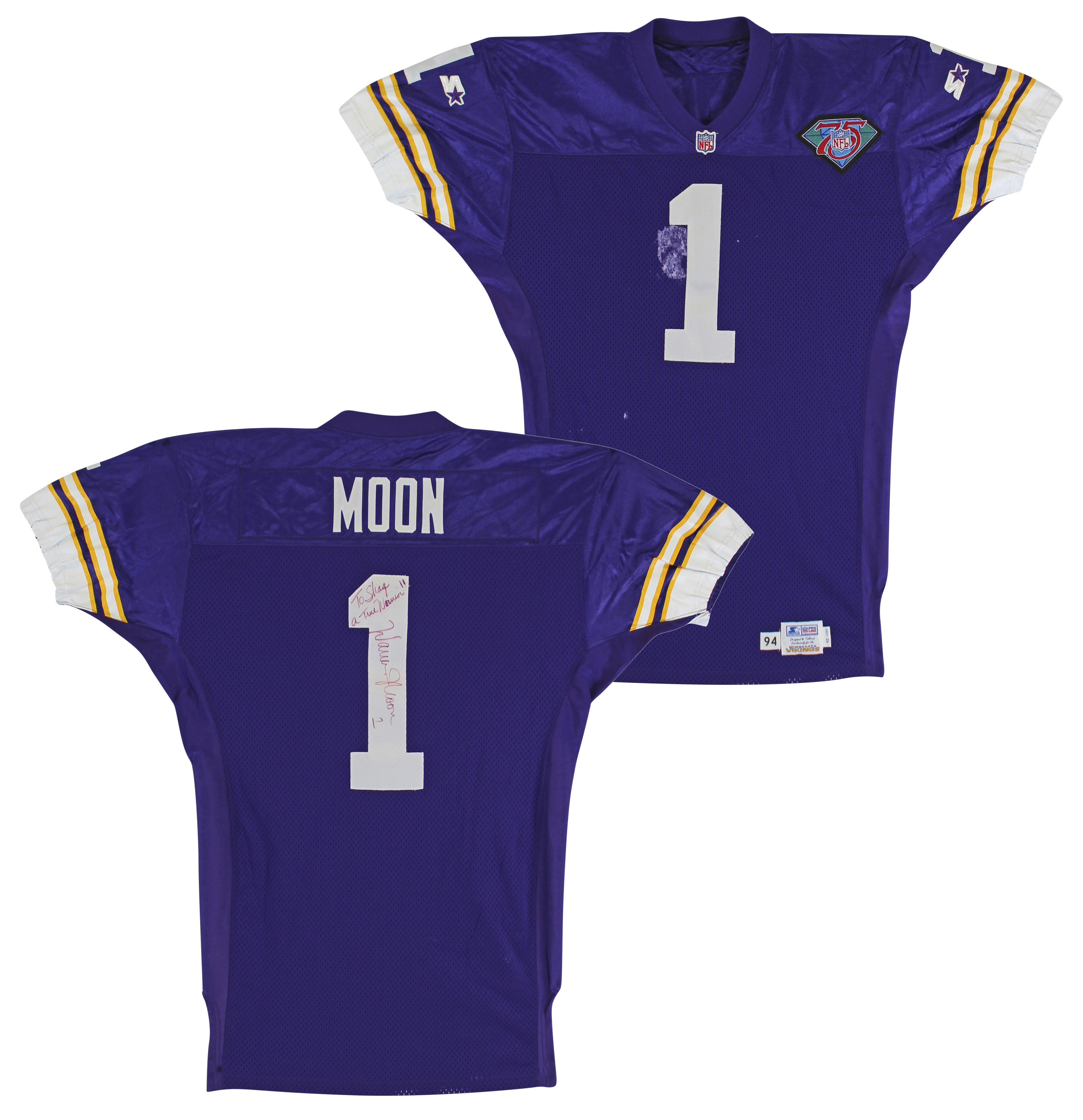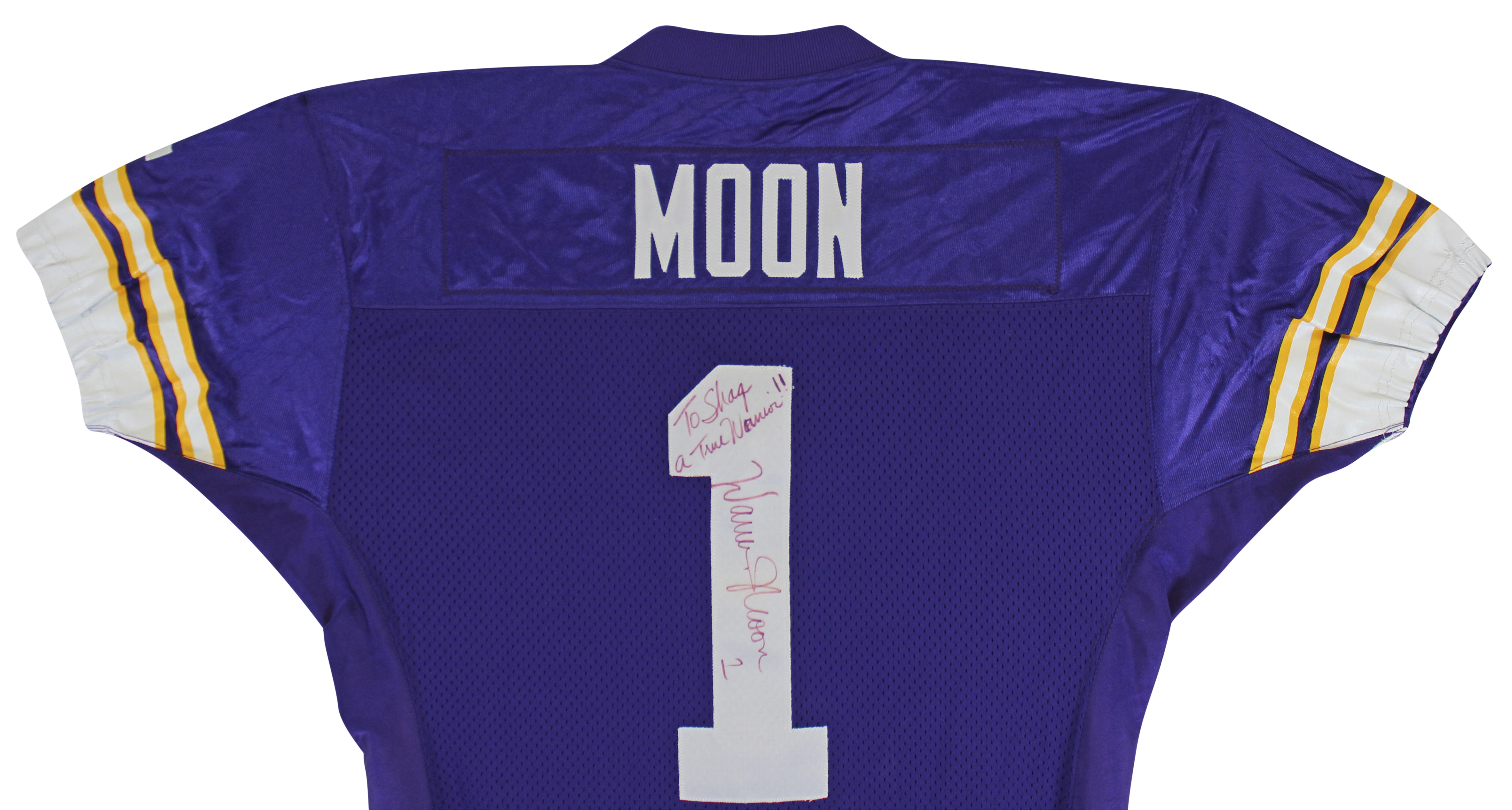 This Autographed Game Worn Purple Starter Proline Size 42 Long Jersey with the inscription of "To Shaq, A True Warrior!" has been Personally Signed by Warren Moon of the Minnesota Vikings. This item is 100% Authentic to include a Certificate of Authenticity (COA) / hologram by Beckett Authentication Services. The authenticity can be verified on Beckett Authentication Services website. The jersey also comes with a letter of authenticity from Sports Investors Authentication for the game use along with a letter of authenticity from Shaquille O'Neal for the provenance as well.