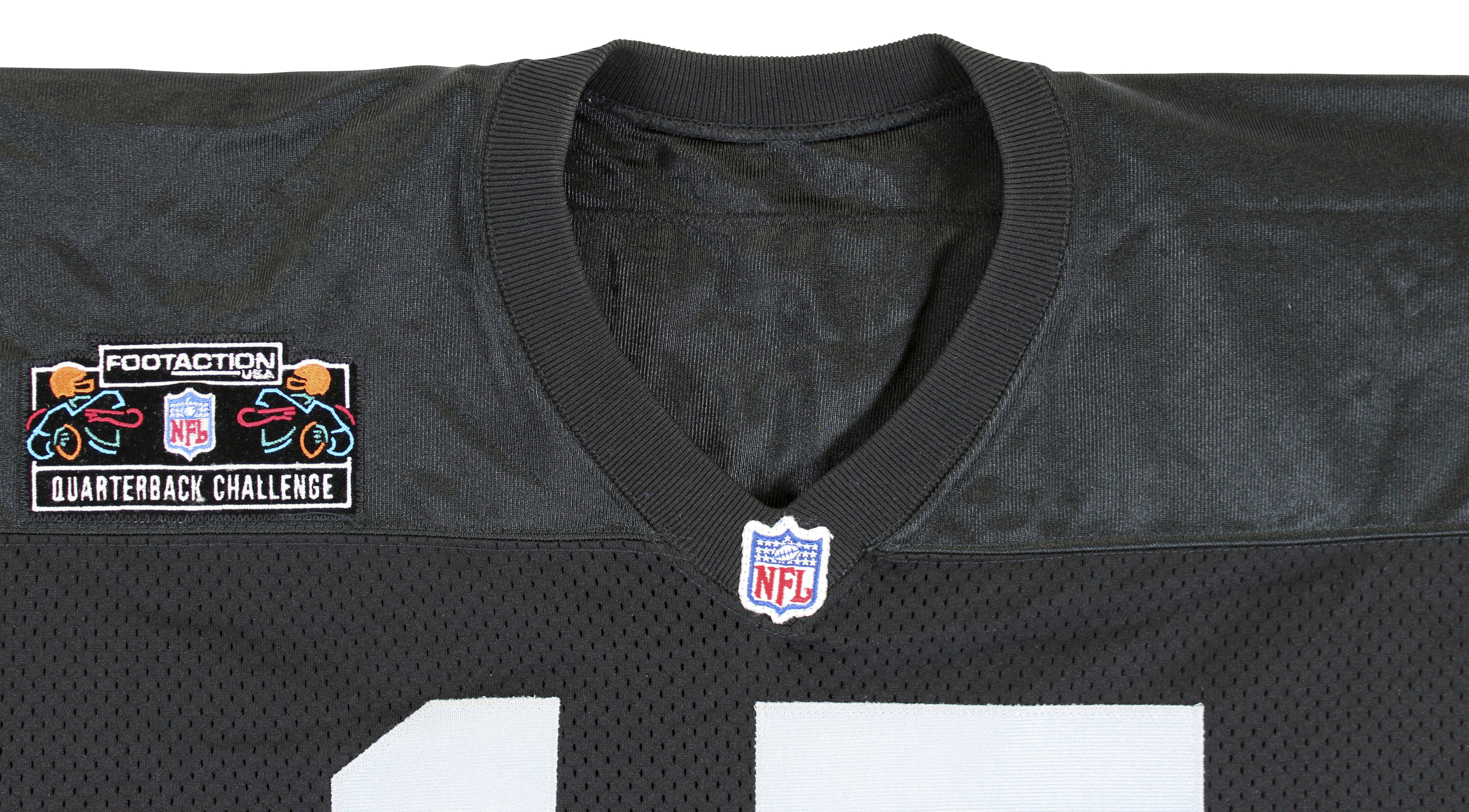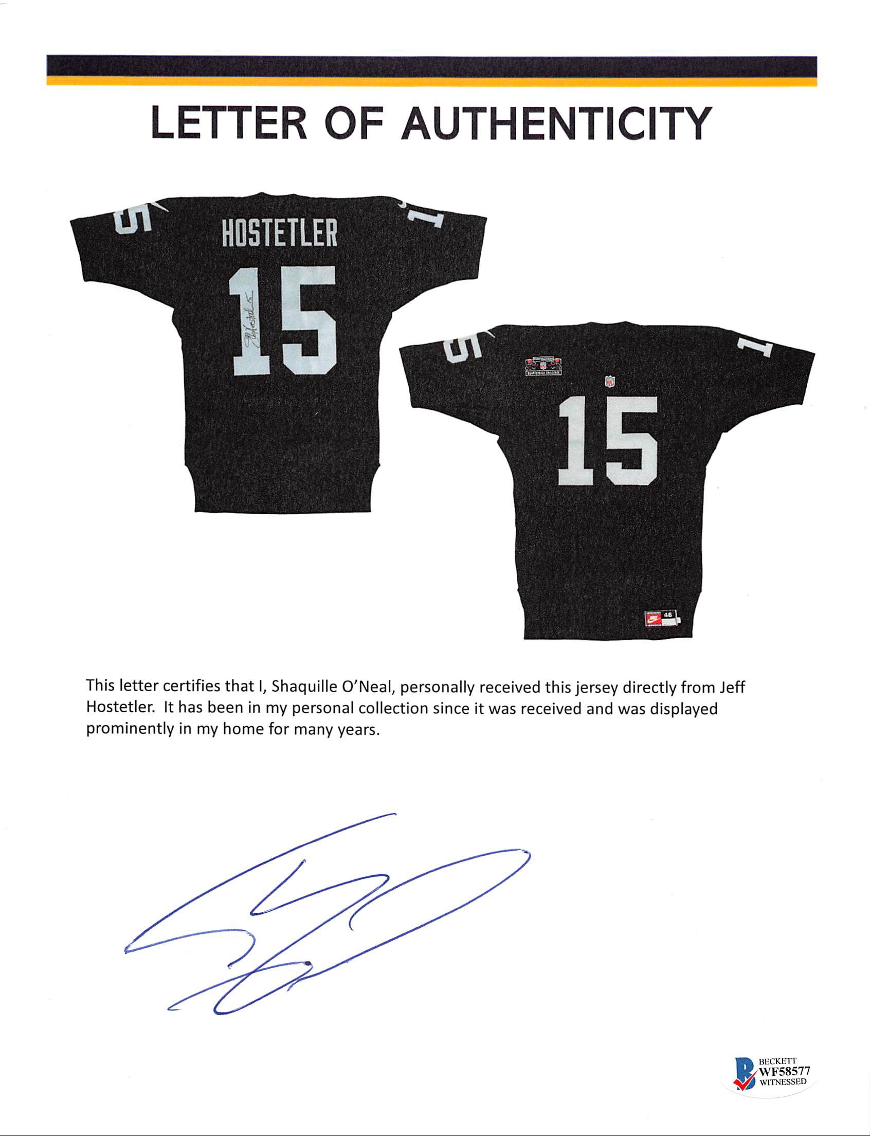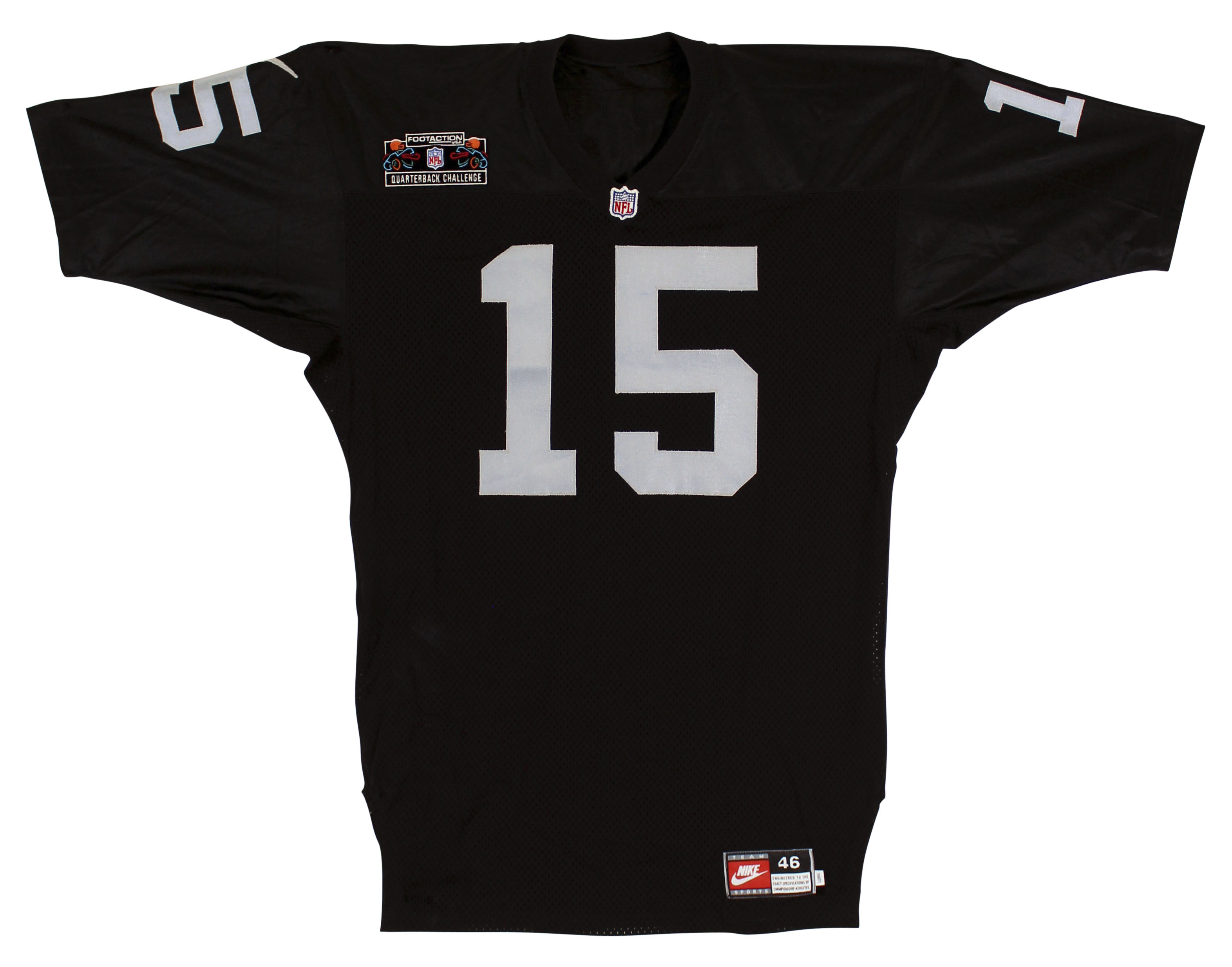 This Autographed 1993 Footaction Quarterback Challenge Game Worn Black Nike Size 46 Jersey has been Personally Signed by Jeff Hostetler of the Oakland Raiders. This item is 100% Authentic to include a Certificate of Authenticity (COA) / hologram by Beckett Authentication Services. The authenticity can be verified on Beckett Authentication Services website. The jersey comes with letter of authenticity from Shaquille O'Neal for the provenance as well. There is no paperwork on the game issue however the tagging matches known exemplars, due to that and the provenance of the item we do believe it is in fact game worn/issued.