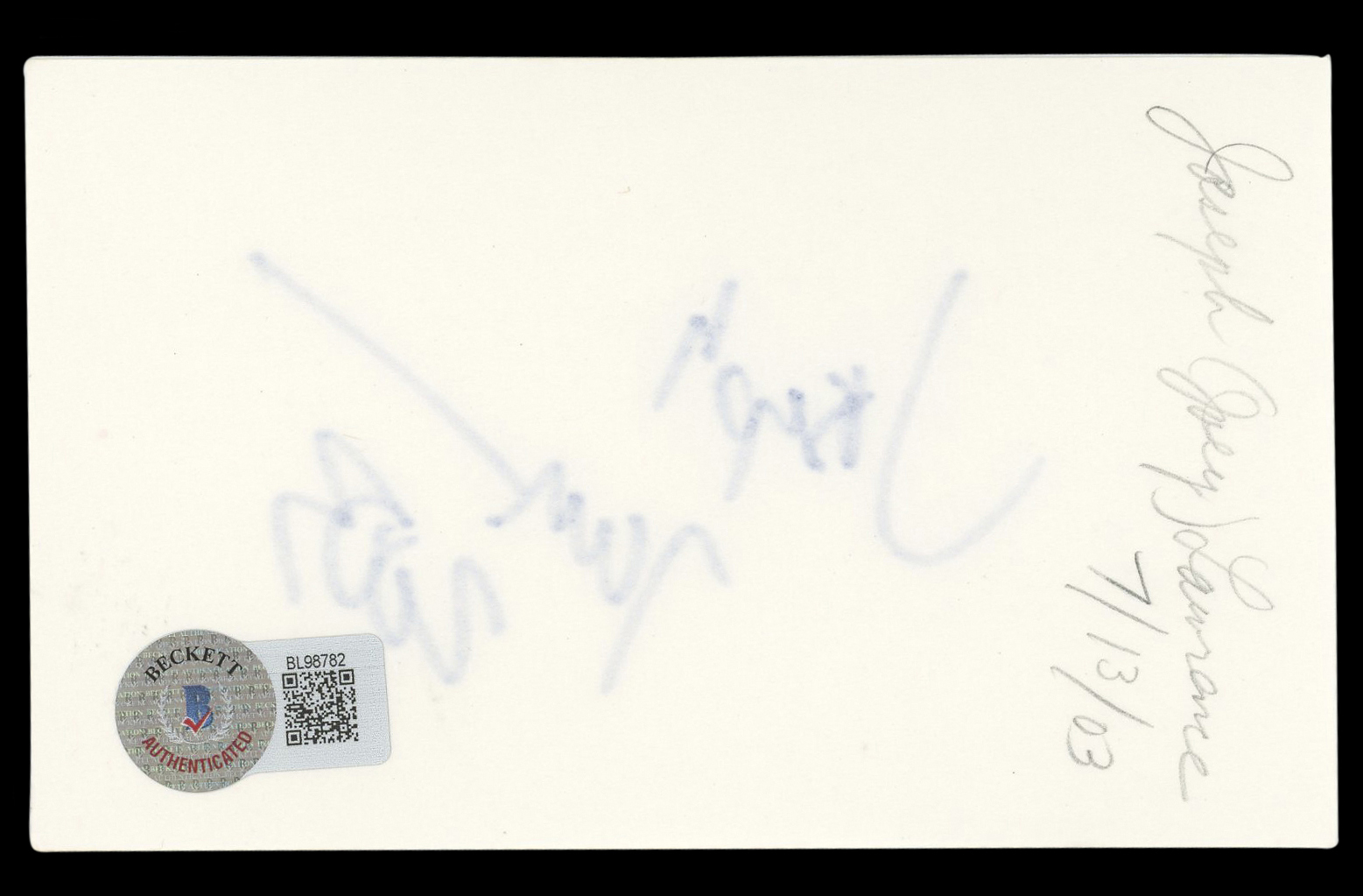 This Autographed 3x5 Index Card with the inscription of "2003" has been Personally Signed by Joey Lawrence of Blossom. This item is 100% Authentic to include a hologram by Beckett Authentication Services. This item will come with an affixed Beckett Authentication Services (BAS) authentication sticker, which includes a scannable QR code to verify authenticity. Please note that Beckett no longer provides serial-numbered COA cards, and the attached BAS sticker will serve as the complete authentication for this item. The authenticity can be verified on Beckett Authentication Services website.