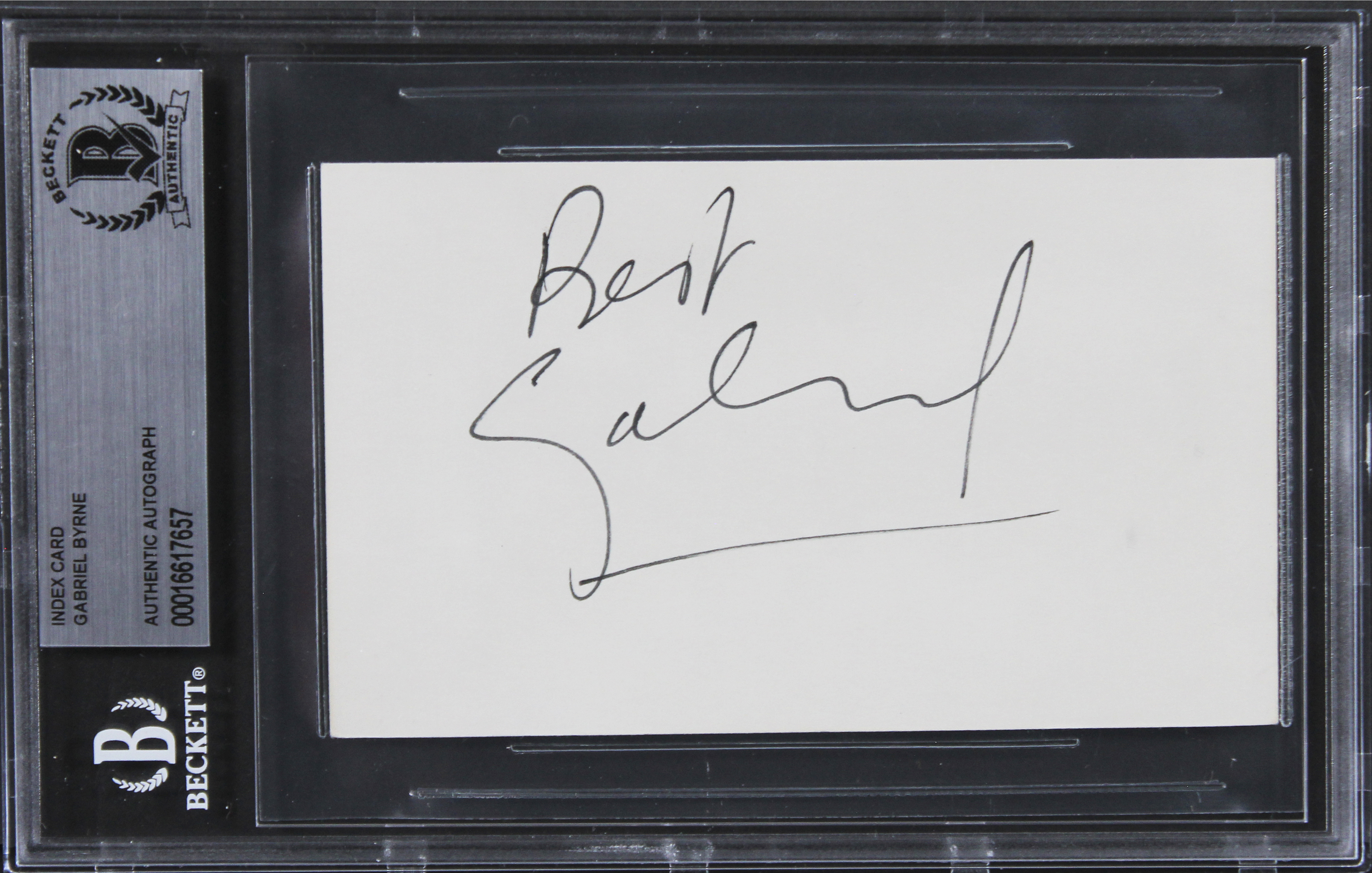 This Autographed 3x5 Index Card has been Personally Signed by Gabriel Byrne of The Usual Suspects. This item is 100% Authentic, it comes slabbed and authenticated by Beckett Authentication Services. The authenticity can be verified on Beckett Authentication Services website.