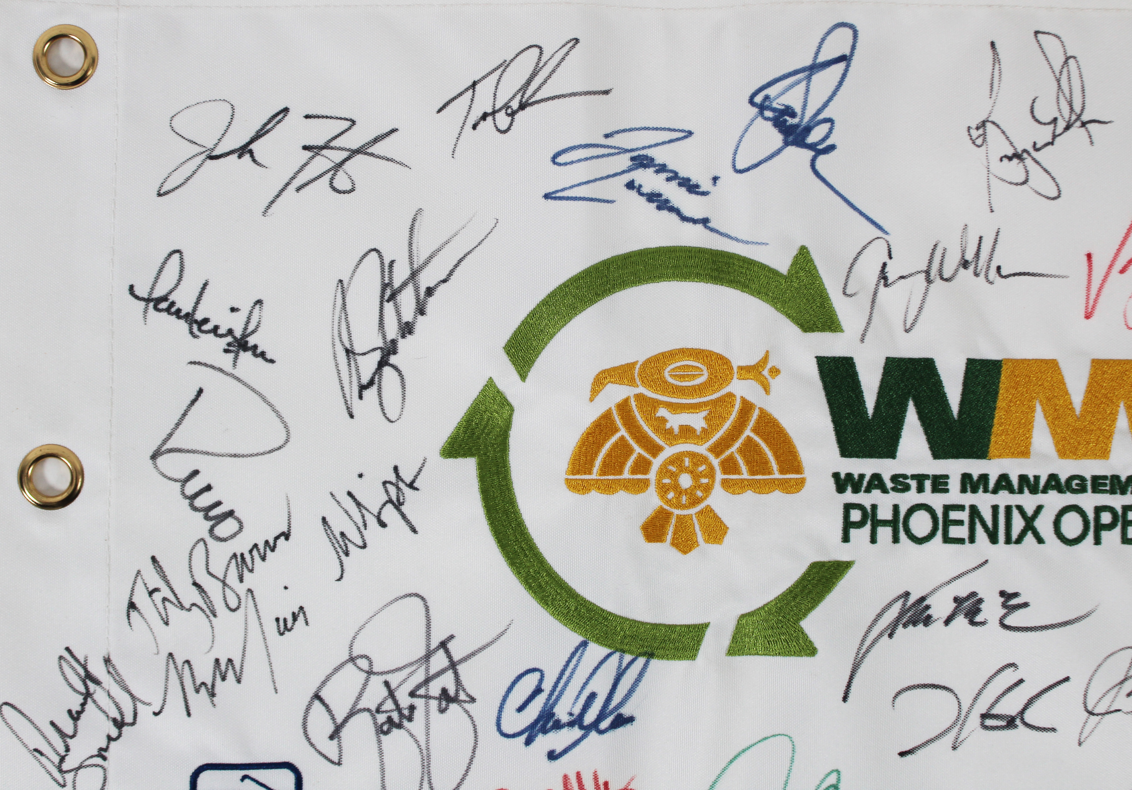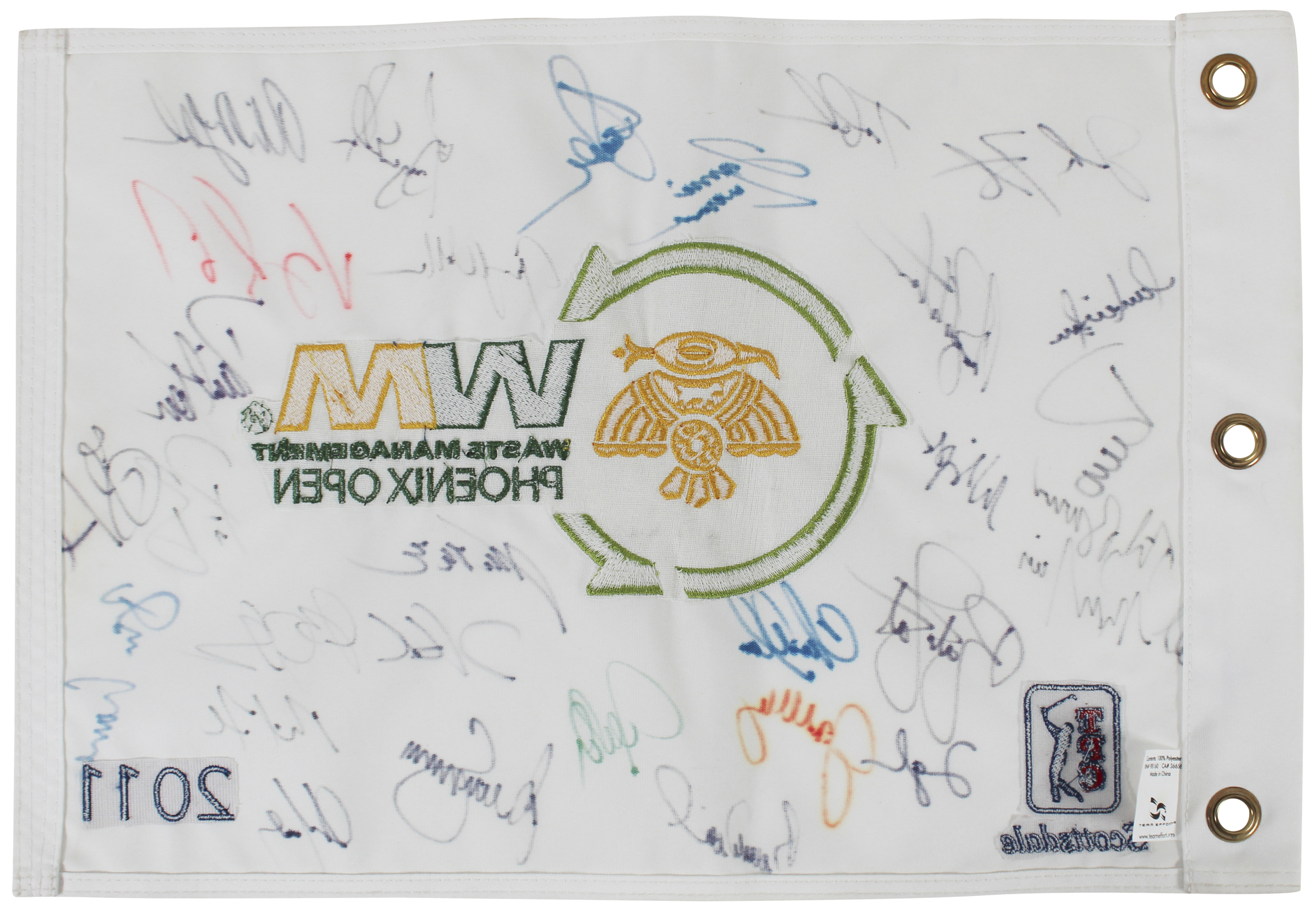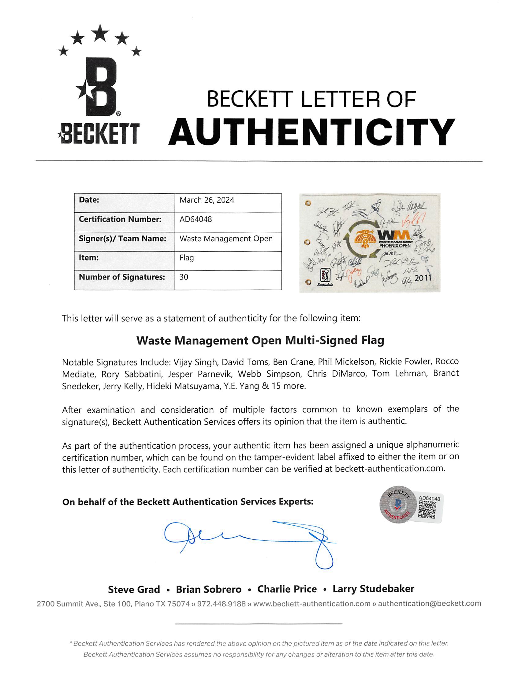This Autographed 2011 Waste Management Open Logo Pin Flag has been Personally Signed by Notable Signatures Include: Vijay Singh, David Toms, Ben Crane, Phil Mickelson, Rickie Fowler, Rocco Mediate, Rory Sabbatini, Jesper Parnevik, Webb Simpson, Chris DiMarco, Tom Lehman, Brandt Snedeker, Jerry Kelly, Hideki Matsuyama, Y.E. Yang & 15 more.. This item is 100% Authentic to include a Certificate of Authenticity (COA) / hologram by Beckett Authentication Services. The authenticity can be verified on Beckett Authentication Services website.