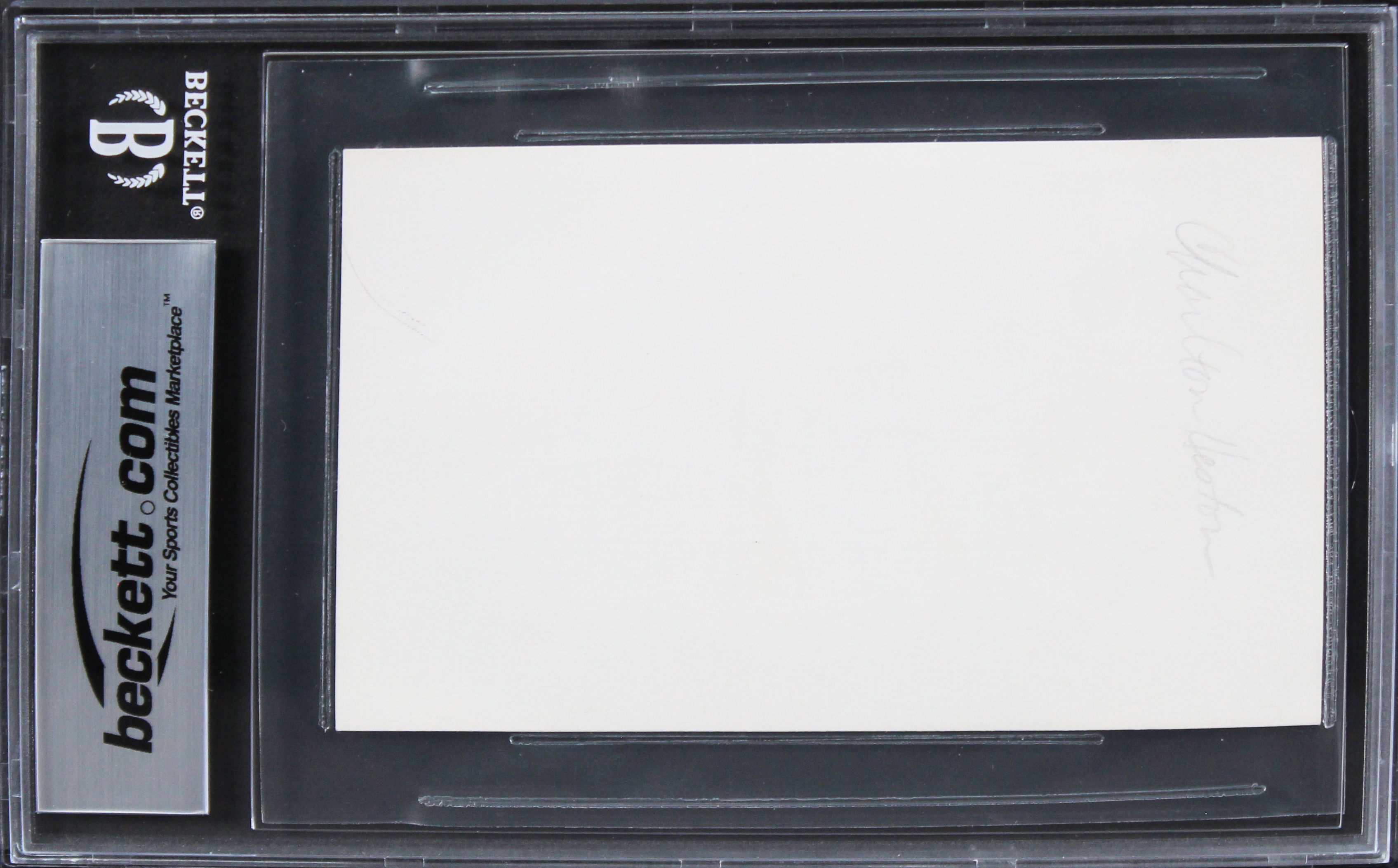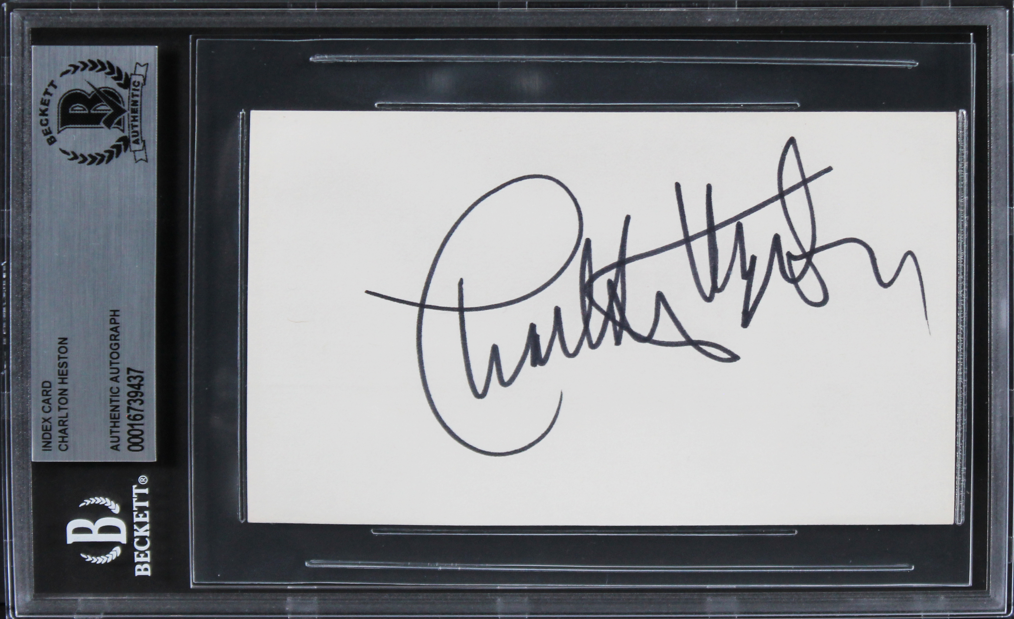 This Autographed 3x5 Index Card has been Personally Signed by Charlton Heston of Ben-Hur. This item is 100% Authentic, it comes slabbed and authenticated by Beckett Authentication Services. The authenticity can be verified on Beckett Authentication Services website.