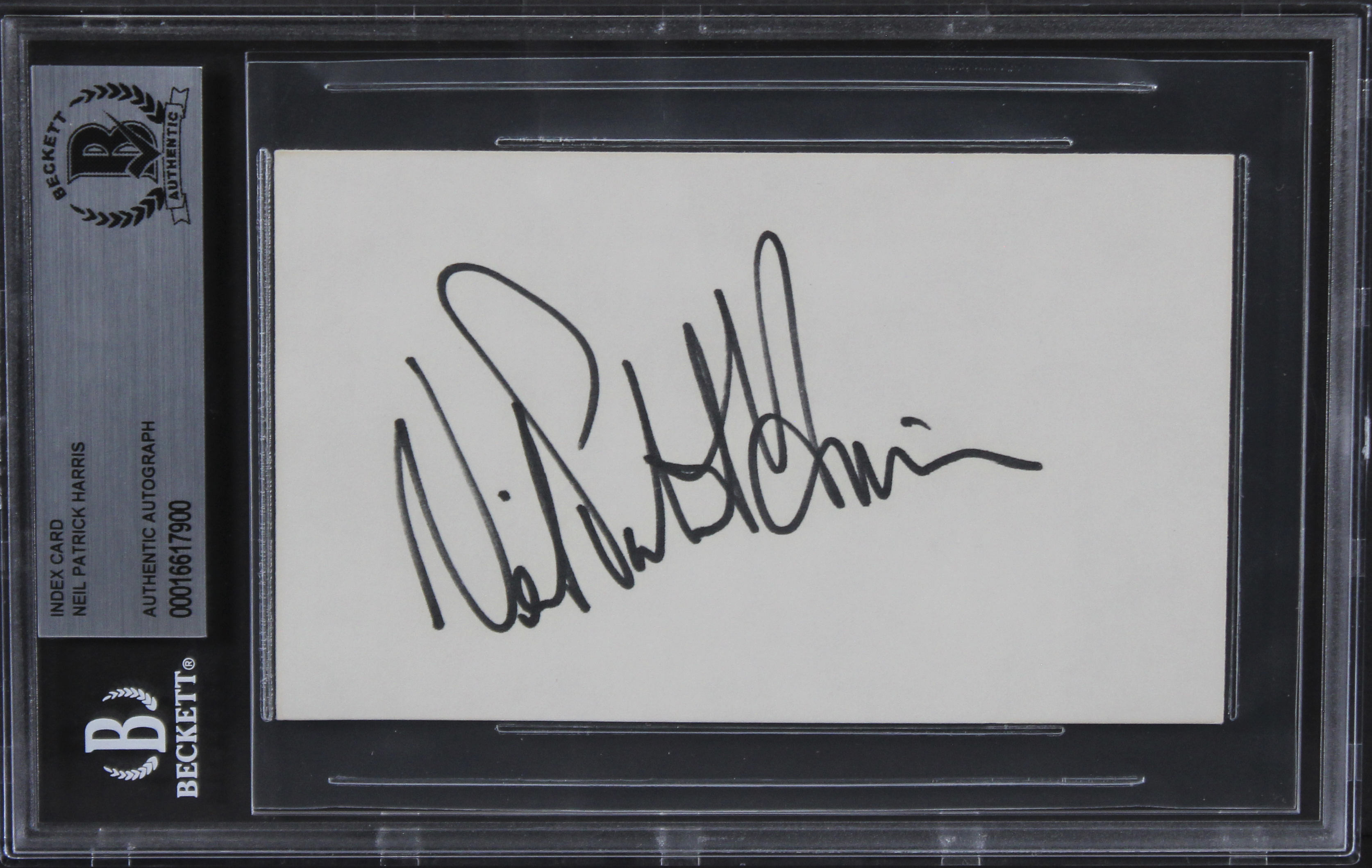 This Autographed 3x5 Index Card has been Personally Signed by Neil Patrick Harris of How I Met Your Mother. This item is 100% Authentic, it comes slabbed and authenticated by Beckett Authentication Services. We have multiples of this same item. While the photographs are representative of this item, the size, placement and strength of the signature may vary. Each item is hand signed, therefore, each autograph is unique.