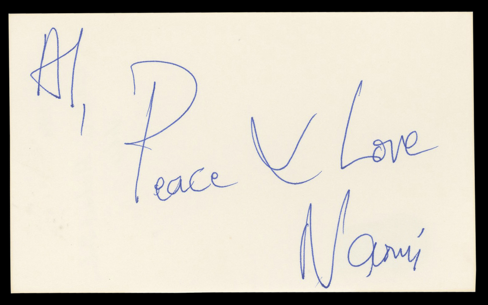 This Autographed 3x5 Index Card with the inscription of "Al, Peace x Love" has been Personally Signed by Naomi Campbell of Vogue Magazine. This item is 100% Authentic to include a hologram by Beckett Authentication Services. This item will come with an affixed Beckett Authentication Services (BAS) authentication sticker, which includes a scannable QR code to verify authenticity. Please note that Beckett no longer provides serial-numbered COA cards, and the attached BAS sticker will serve as the complete authentication for this item. The authenticity can be verified on Beckett Authentication Services website.