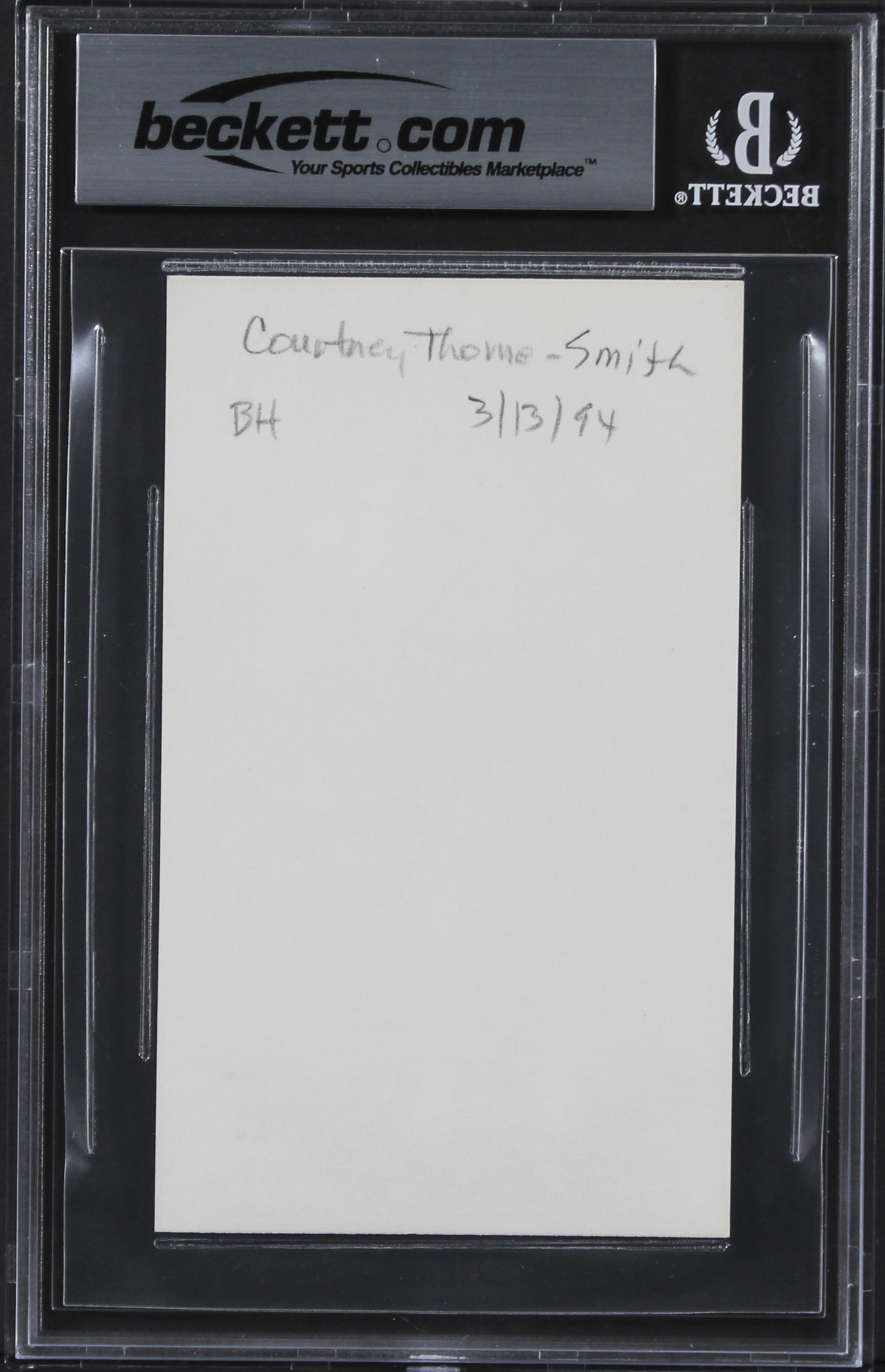 This Autographed 3x5 Index Card has been Personally Signed by Courtney Thorne-Smith of Melrose Place. This item is 100% Authentic, it comes slabbed and authenticated by Beckett Authentication Services. We have multiples of this same item. While the photographs are representative of this item, the size, placement and strength of the signature may vary. Each item is hand signed, therefore, each autograph is unique.