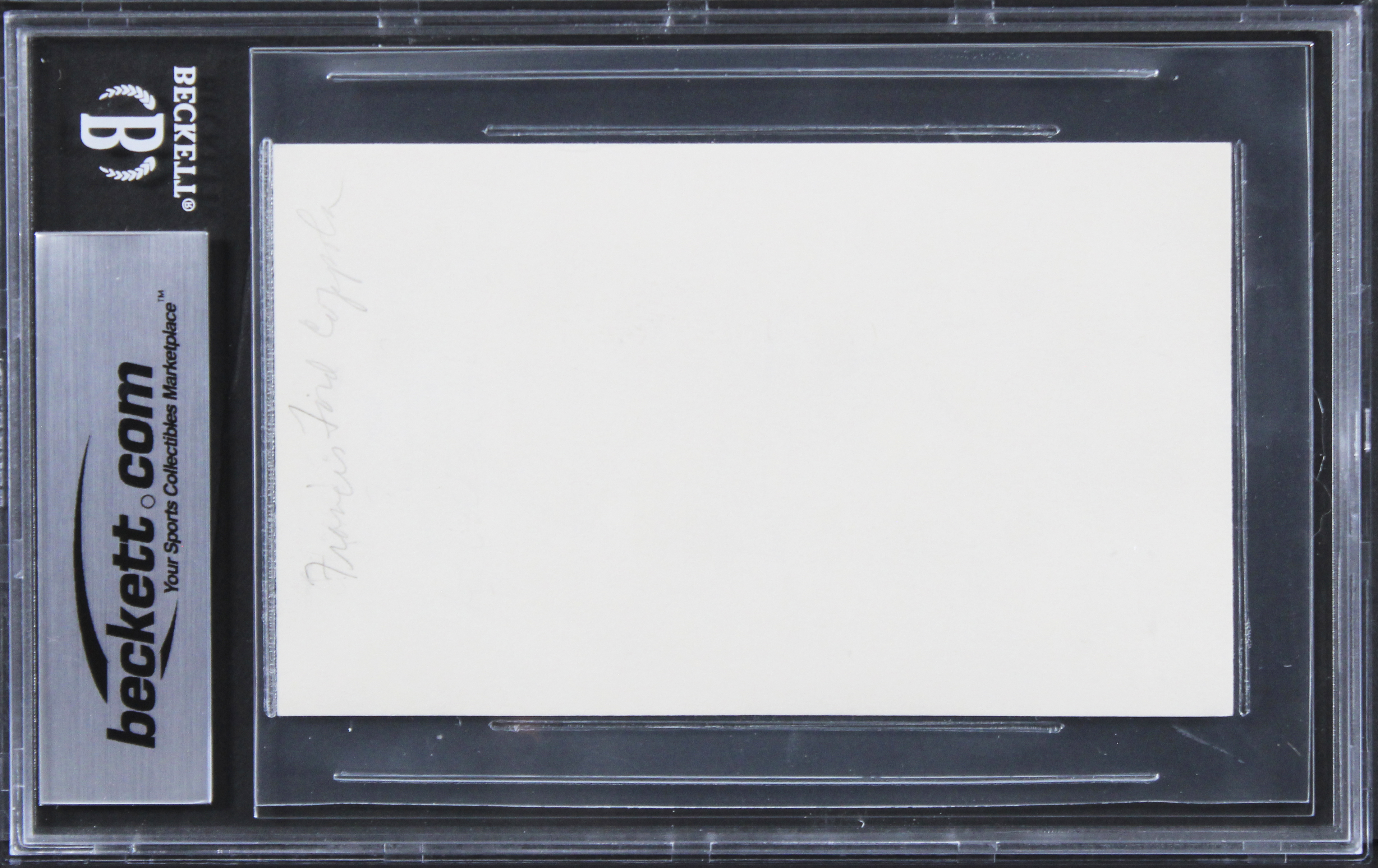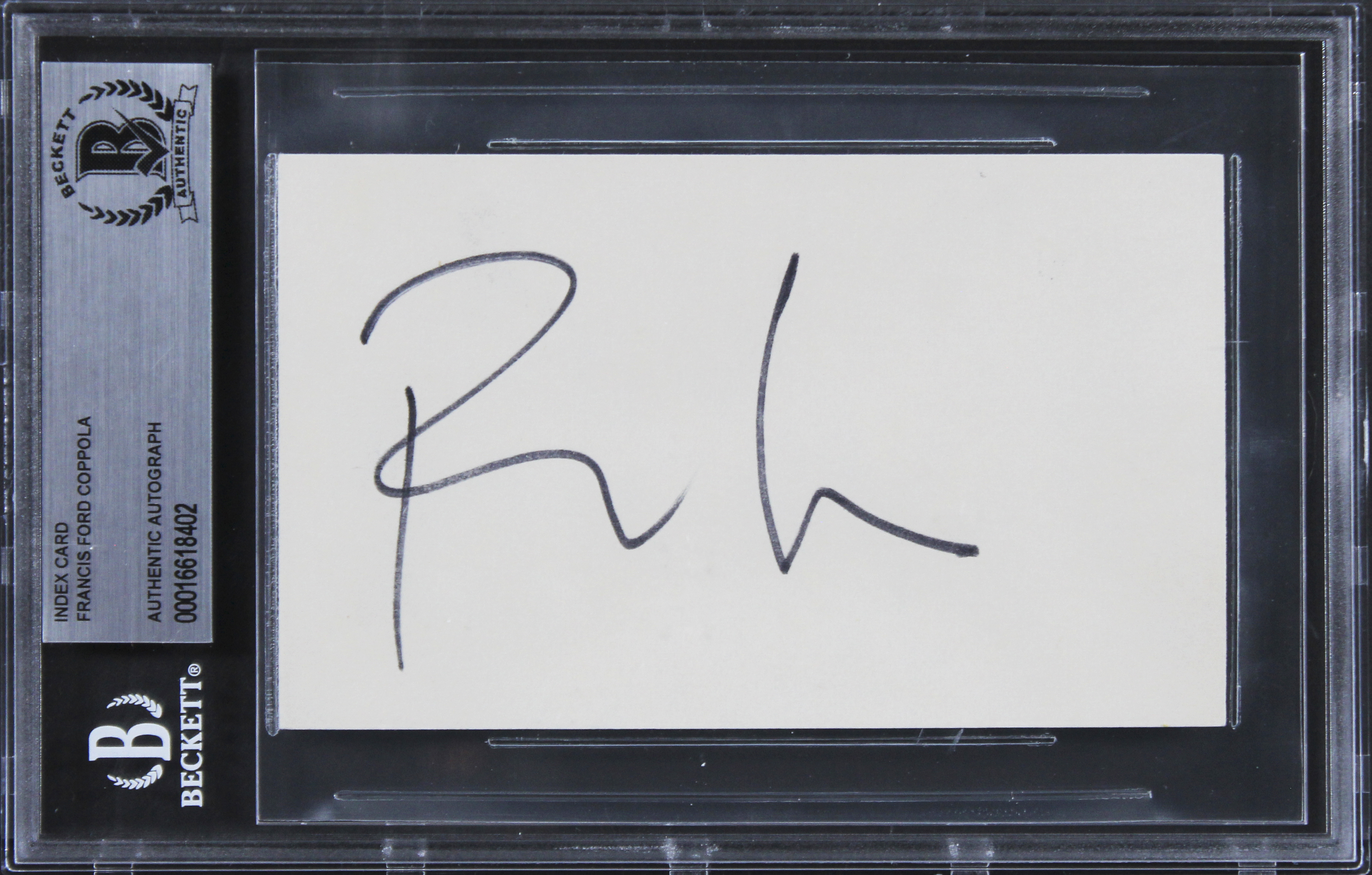 This Autographed 3x5 Index Card has been Personally Signed by Francis Ford Coppola of The Godfather. This item is 100% Authentic, it comes slabbed and authenticated by Beckett Authentication Services. The authenticity can be verified on Beckett Authentication Services website.