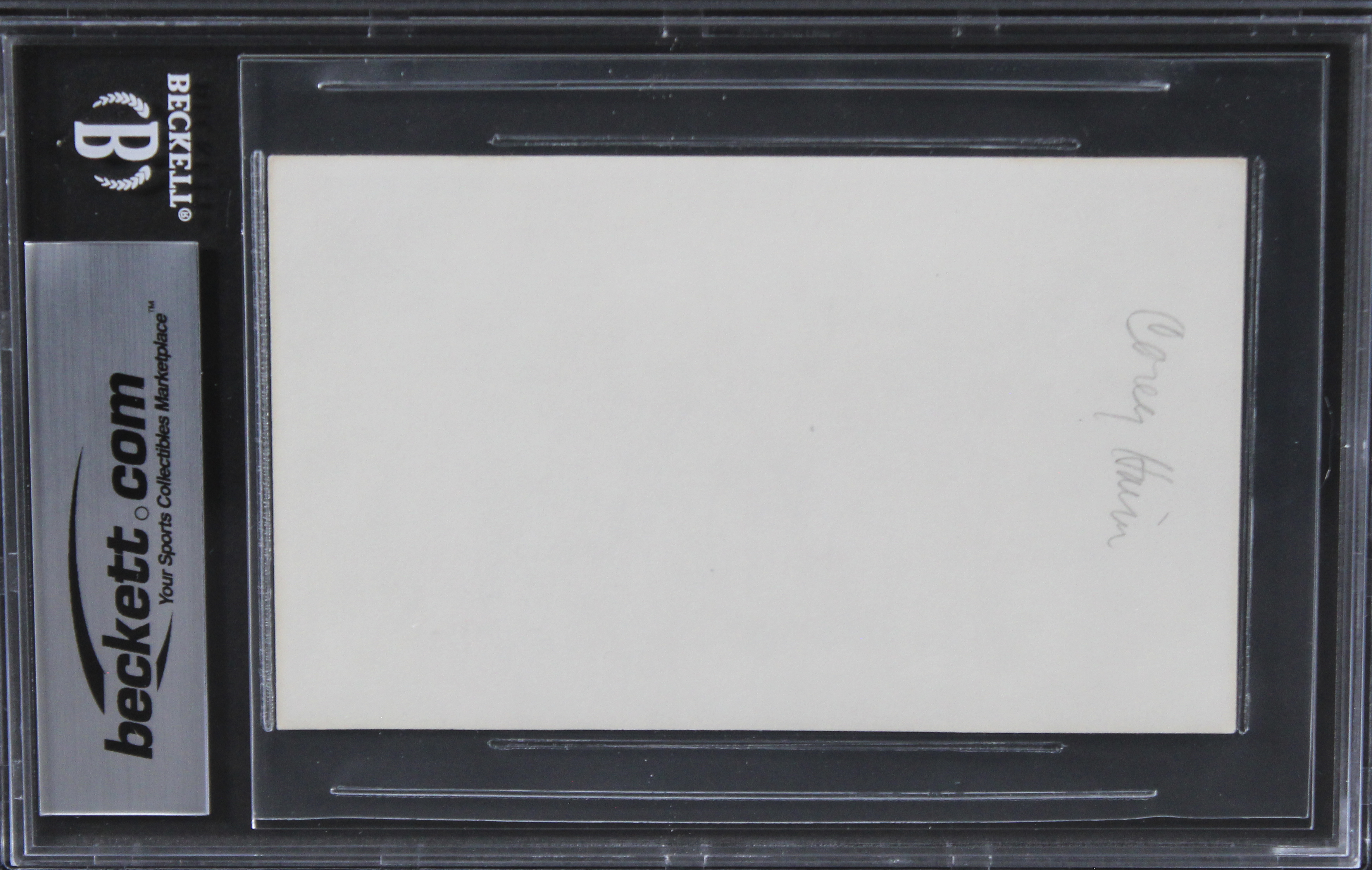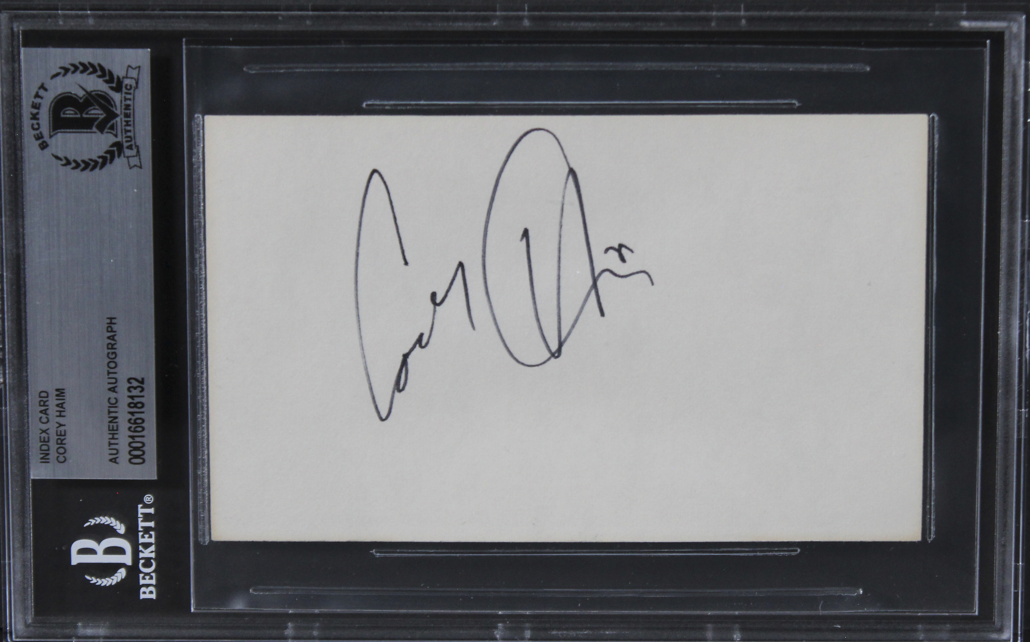 This Autographed 3x5 Index Card has been Personally Signed by Corey Haim of The Lost Boys. This item is 100% Authentic, it comes slabbed and authenticated by Beckett Authentication Services. The authenticity can be verified on Beckett Authentication Services website.