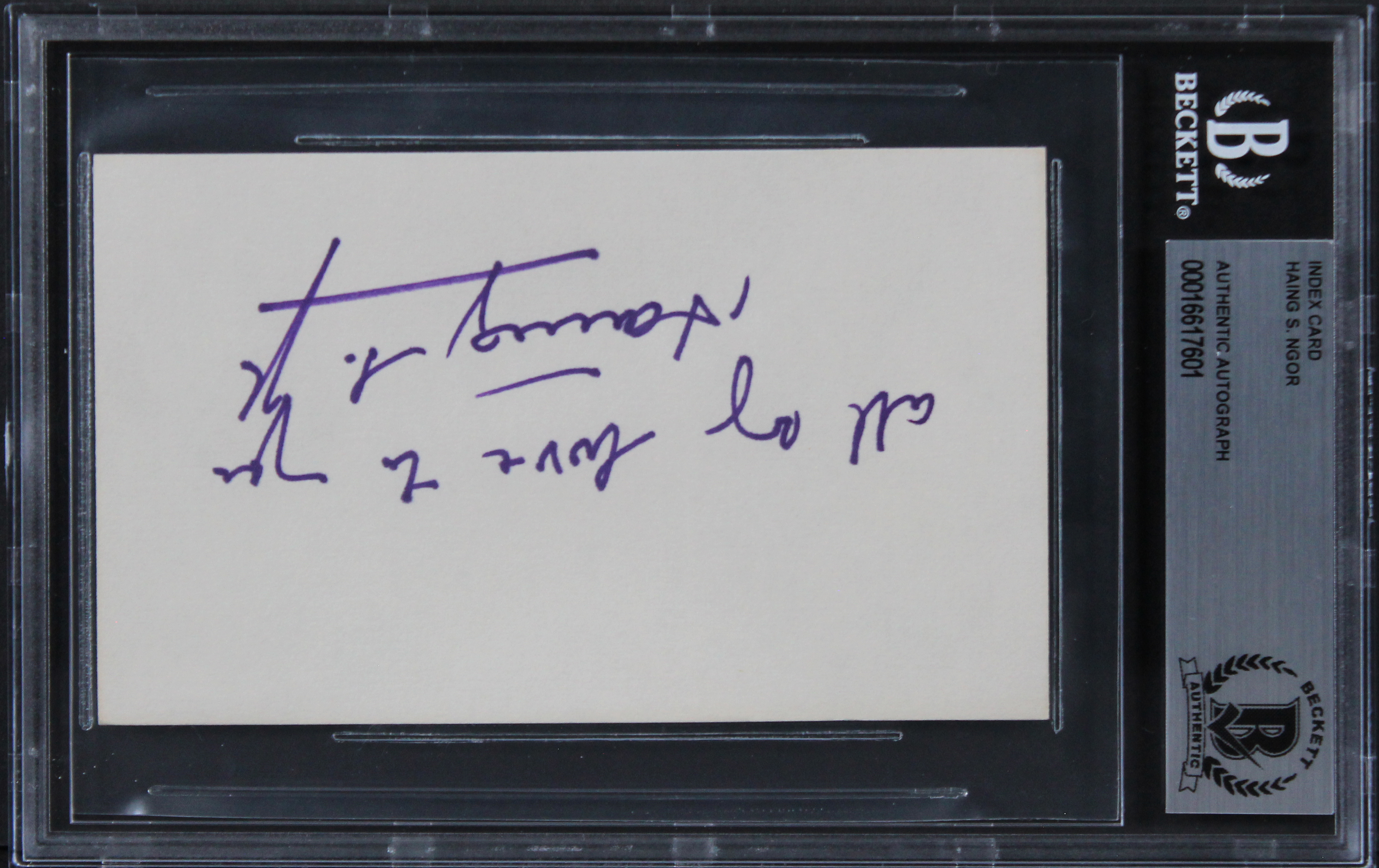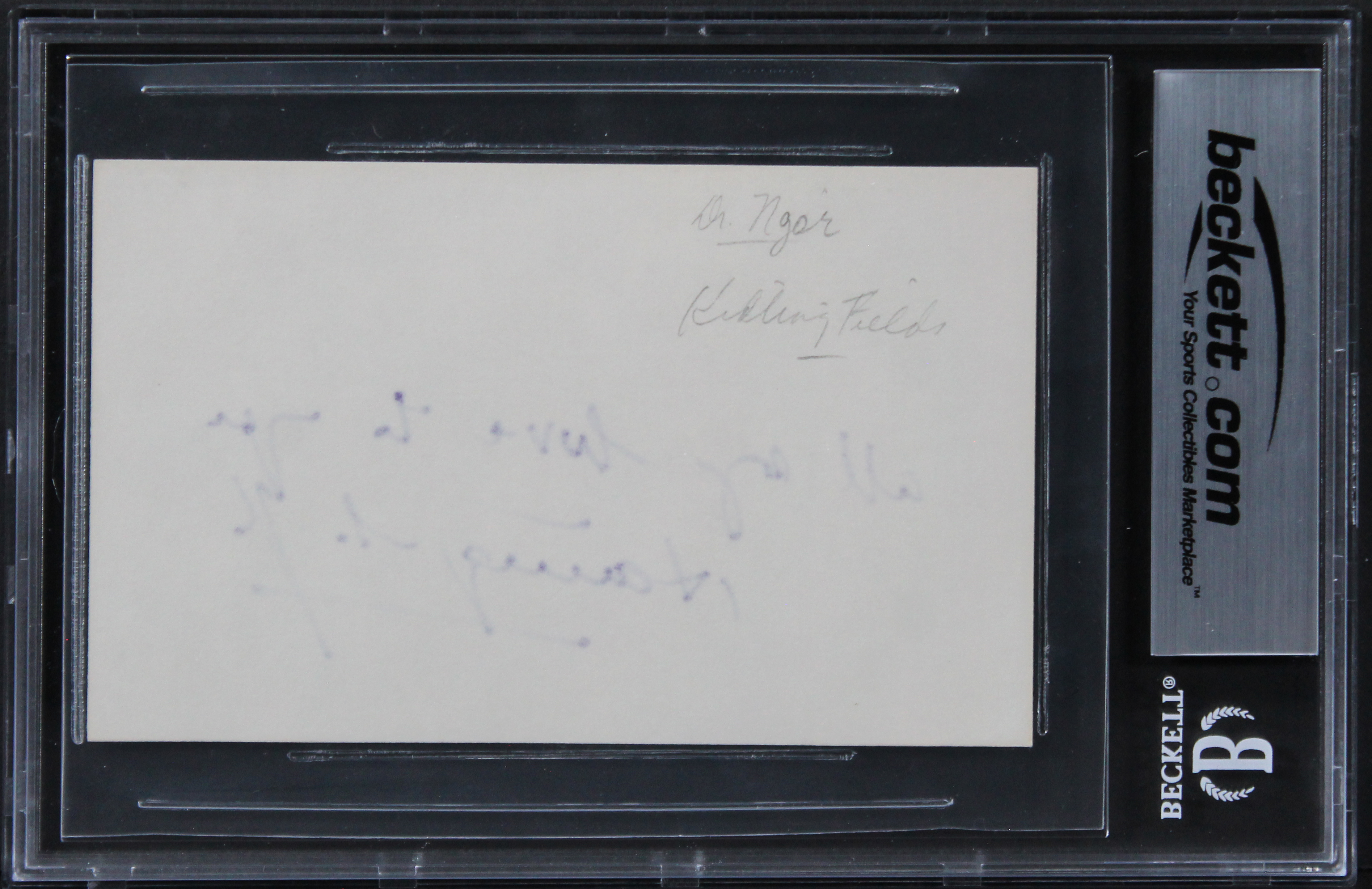 This Autographed 3x5 Index Card with the inscription of ""All My Love To You"" has been Personally Signed by Haing S. Ngor of My Life. This item is 100% Authentic, it comes slabbed and authenticated by Beckett Authentication Services. The authenticity can be verified on Beckett Authentication Services website.