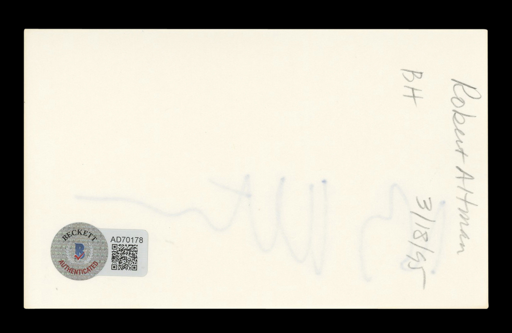 This Autographed 3x5 Index Card has been Personally Signed by Robert Altman of M*A*S*H. This item is 100% Authentic to include a hologram by Beckett Authentication Services. This item will come with an affixed Beckett Authentication Services (BAS) authentication sticker, which includes a scannable QR code to verify authenticity. Please note that Beckett no longer provides serial-numbered COA cards, and the attached BAS sticker will serve as the complete authentication for this item. The authenticity can be verified on Beckett Authentication Services website.