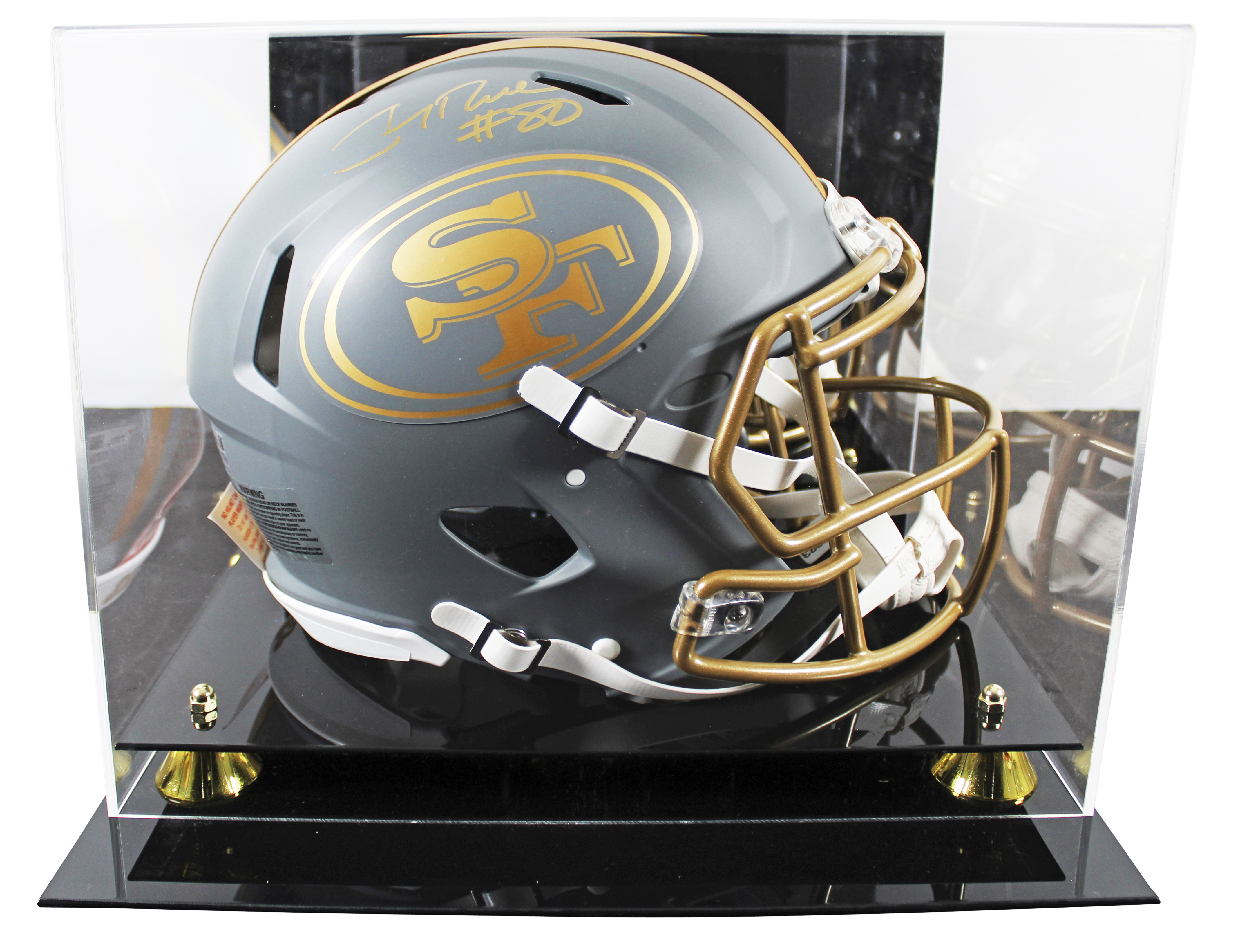 This Autographed Alternate Slate Riddell Full Size Speed Proline Helmet W/ Uv Mirrored Back Acrylic Display Case has been Personally Signed by Jerry Rice of the San Francisco 49ers. This item is 100% Authentic to includes a numbered hologram by Fanatics. We conducted an autograph signing with Jerry Rice where multiples of the same item were signed. While the photographs are representative of this item, the size, placement and strength of the signature may vary. Each item is hand signed, therefore, each autograph is unique. This item can be verified through Fanatics.