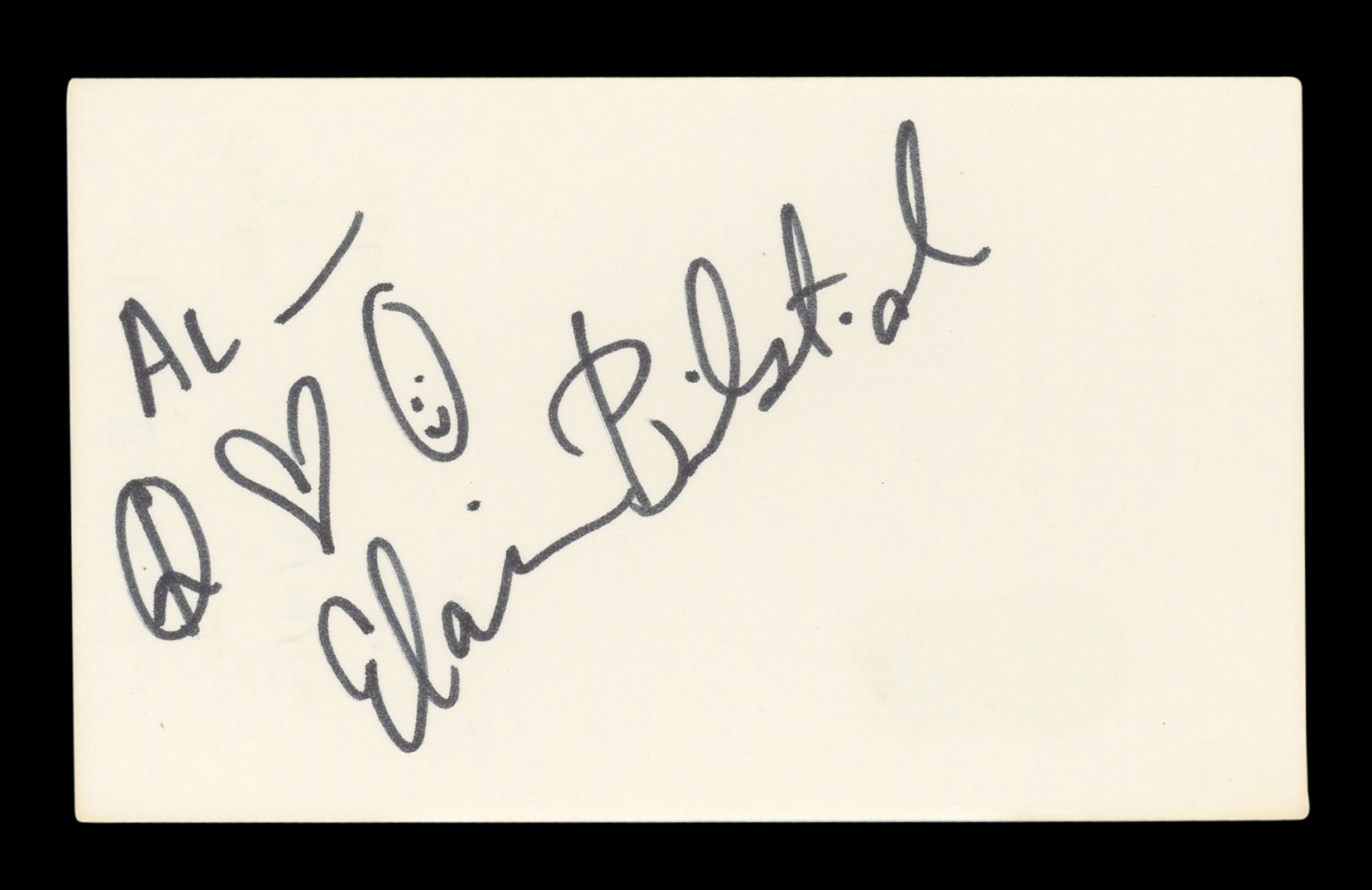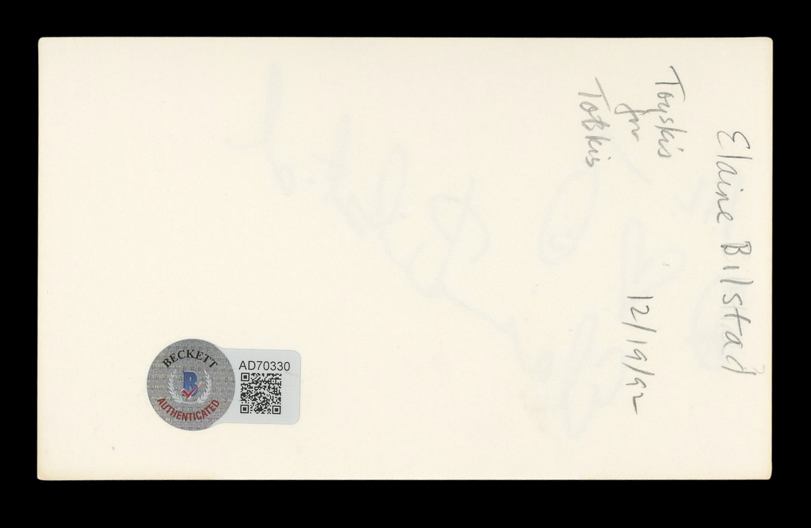 This Autographed 3x5 Index Card with the inscription of "Al-" has been Personally Signed by Elaine Bilstad of The Vampire. This item is 100% Authentic to include a hologram by Beckett Authentication Services. This item will come with an affixed Beckett Authentication Services (BAS) authentication sticker, which includes a scannable QR code to verify authenticity. Please note that Beckett no longer provides serial-numbered COA cards, and the attached BAS sticker will serve as the complete authentication for this item. The authenticity can be verified on Beckett Authentication Services website.