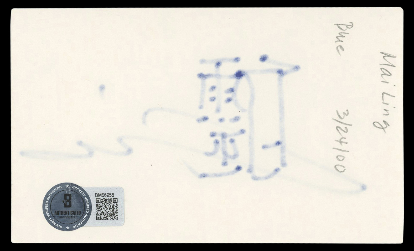 This Autographed 3x5 Index Card has been Personally Signed by Mai Ling of Goldfinger. This item is 100% Authentic to include a hologram by Beckett Authentication Services. This item will come with an affixed Beckett Authentication Services (BAS) authentication sticker, which includes a scannable QR code to verify authenticity. Please note that Beckett no longer provides serial-numbered COA cards, and the attached BAS sticker will serve as the complete authentication for this item. The authenticity can be verified on Beckett Authentication Services website.