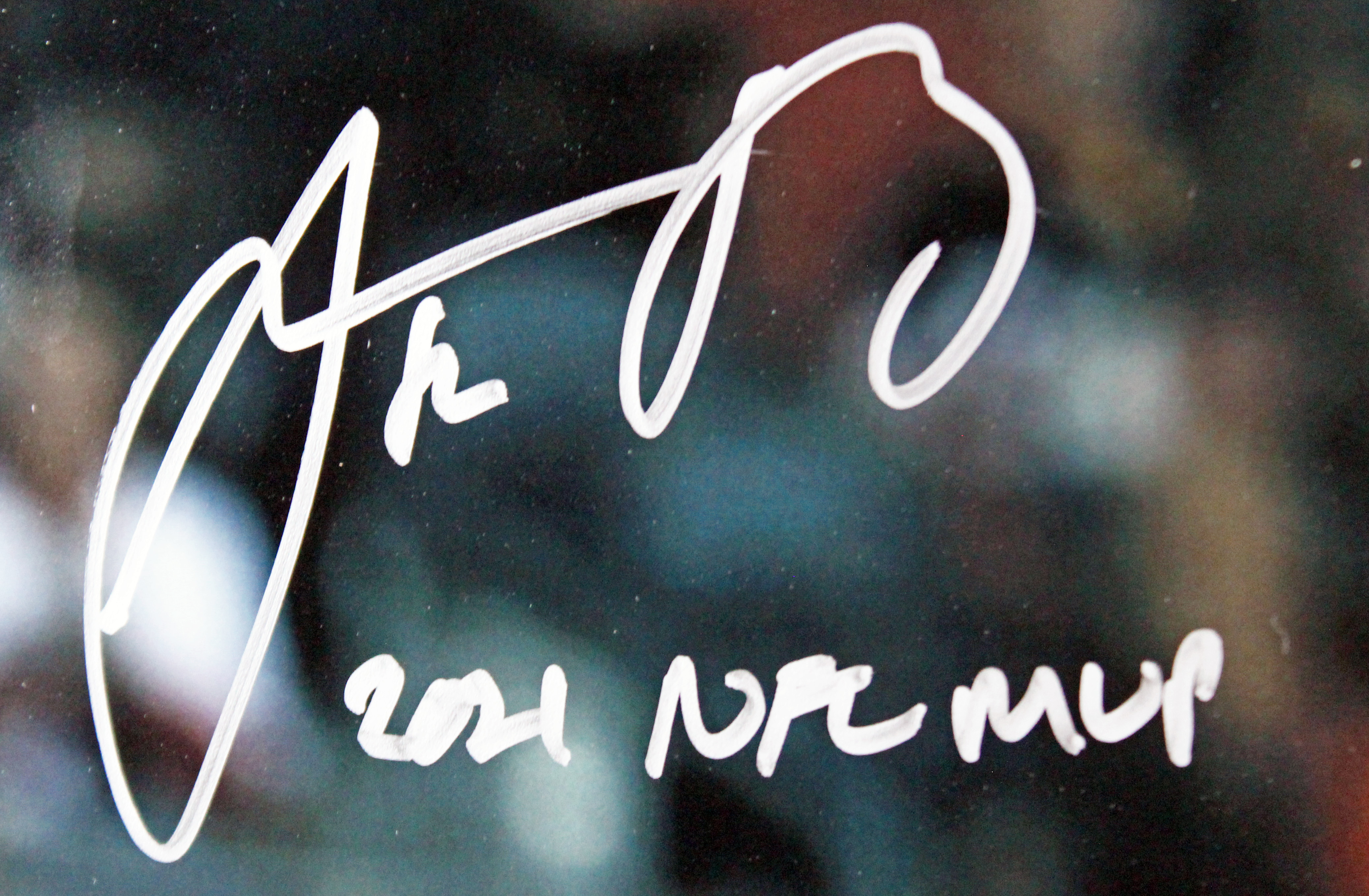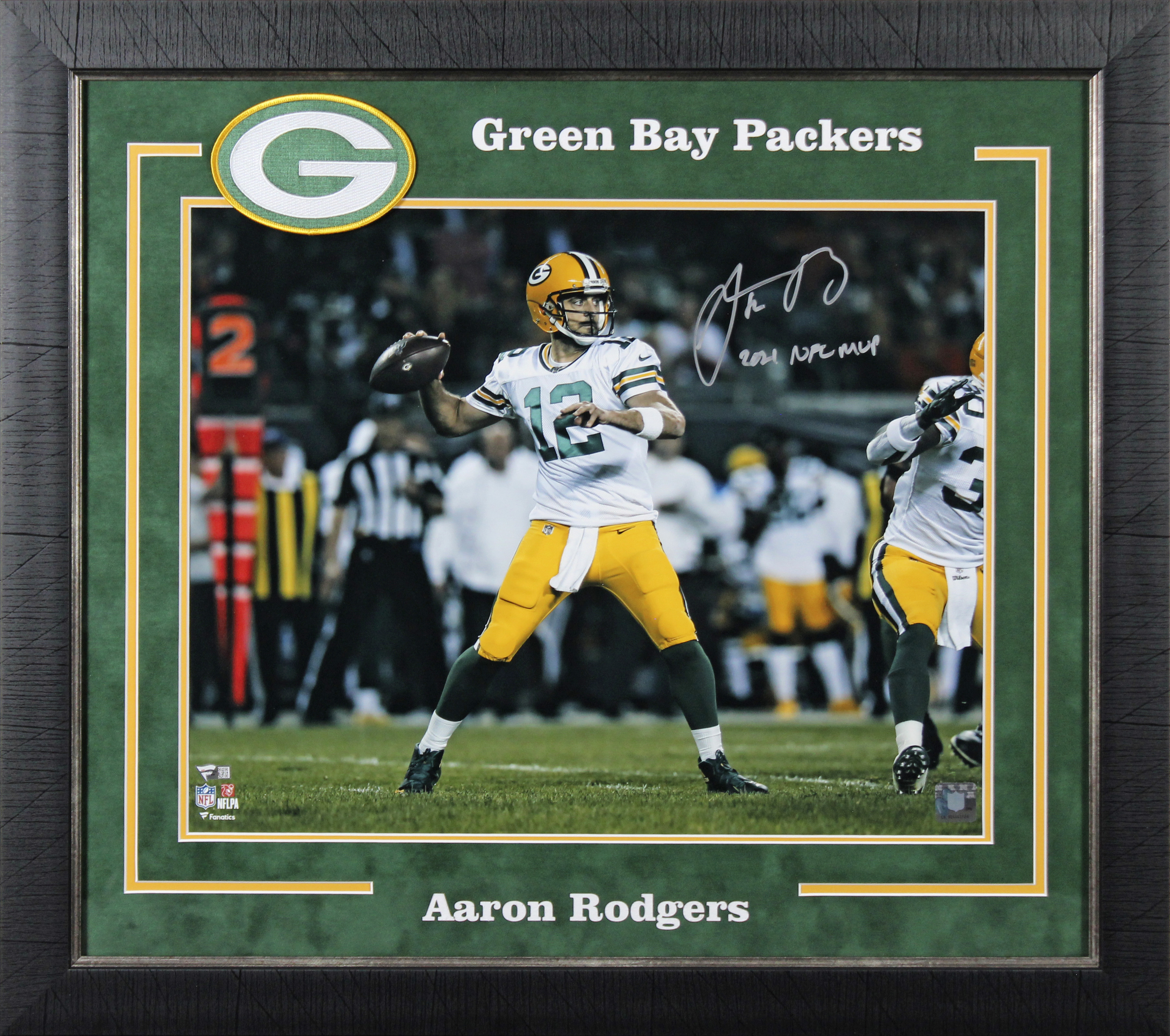 This Autographed 16x20 Framed Photo with the inscription of "2021 NFL MVP" has been Personally Signed by Aaron Rodgers of the Green Bay Packers. This item is 100% Authentic to includes a numbered hologram by Fanatics. The authenticity can be verified on Fanatics website.