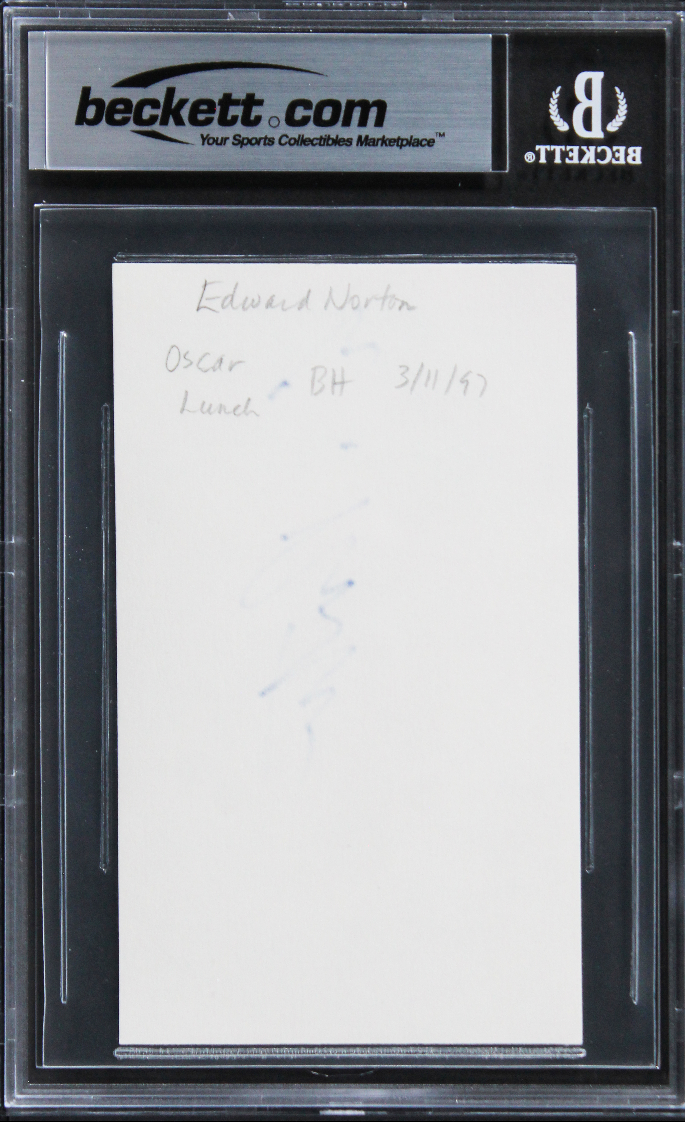 This Autographed 3x5 Index Card has been Personally Signed by Edward Norton of Fight Club. This item is 100% Authentic, it comes slabbed and authenticated by Beckett Authentication Services. The authenticity can be verified on Beckett Authentication Services website.