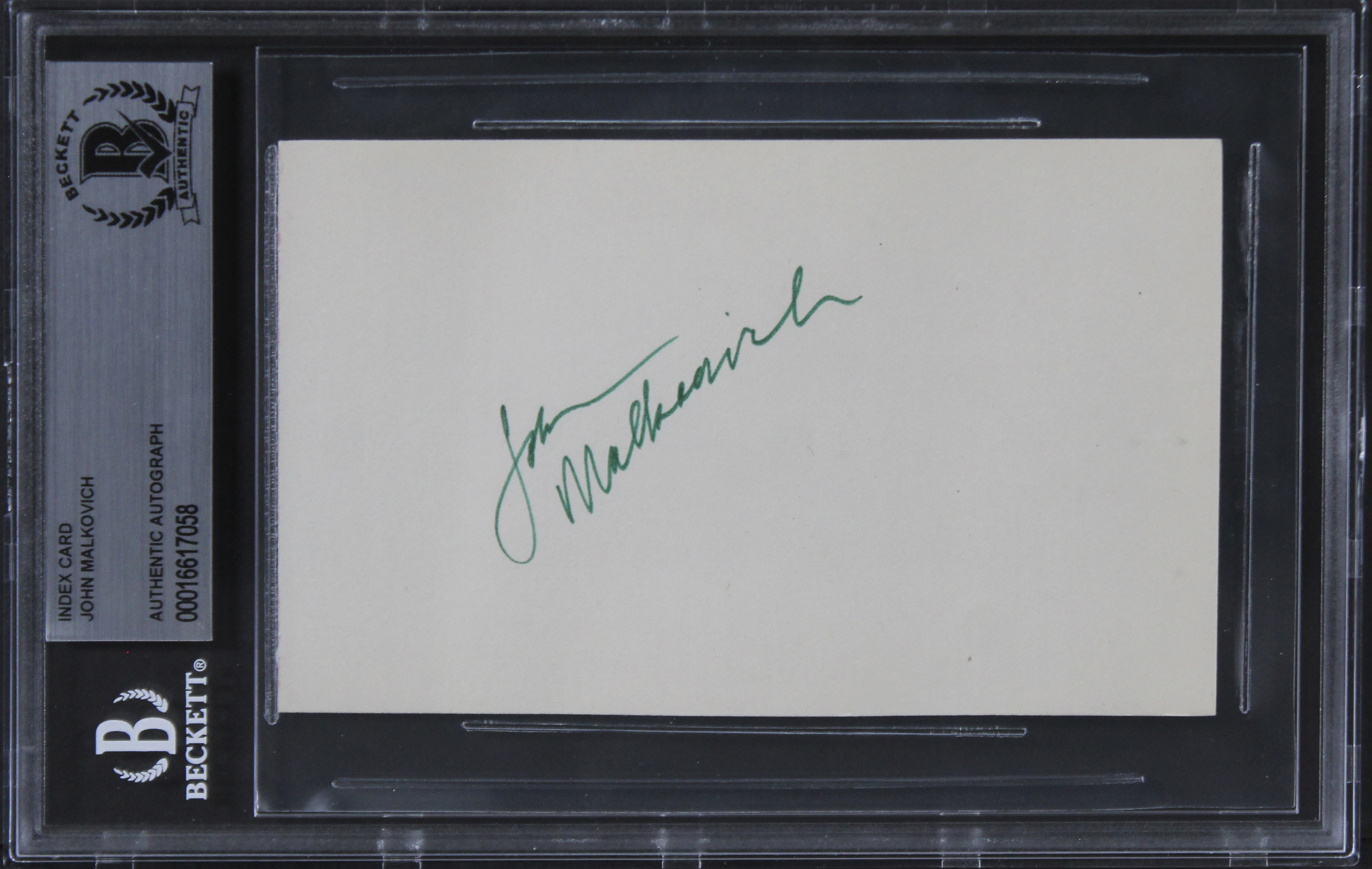This Autographed 3x5 Index Card has been Personally Signed by John Malkovich of Con Air. This item is 100% Authentic, it comes slabbed and authenticated by Beckett Authentication Services. The authenticity can be verified on Beckett Authentication Services website.