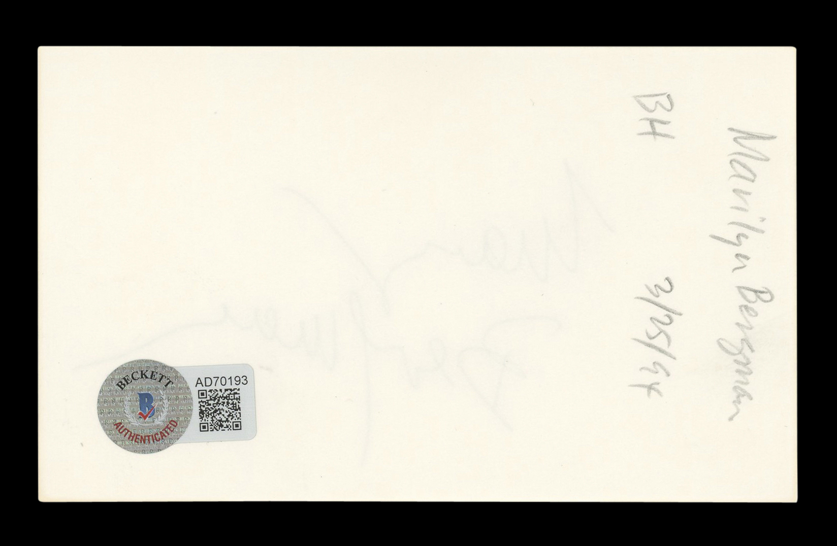 This Autographed 3x5 Index Card has been Personally Signed by Marilyn Bergman of Musician. This item is 100% Authentic to include a hologram by Beckett Authentication Services. This item will come with an affixed Beckett Authentication Services (BAS) authentication sticker, which includes a scannable QR code to verify authenticity. Please note that Beckett no longer provides serial-numbered COA cards, and the attached BAS sticker will serve as the complete authentication for this item. The authenticity can be verified on Beckett Authentication Services website.