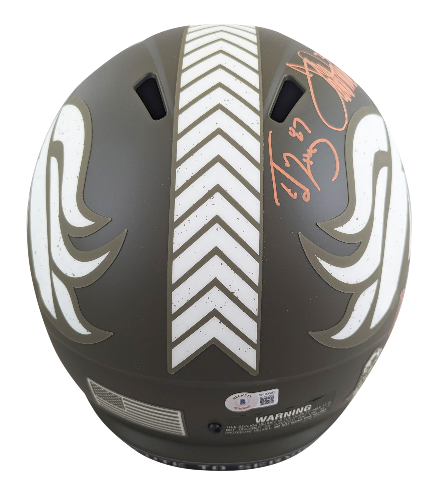 This Autographed Alternate Salute To Service Riddell Full Size Speed Rep Helmet W/ Uv Mirrored Back Acrylic Display Case with the inscription of "Back 2 Back Champs (Smith), Mile High Salute (McCaffrey)" has been Personally Signed by John Elway, Shannon Sharpe, Terrell Davis, Rod Smith & Ed McCaffrey of the Denver Broncos. This item is 100% Authentic to include a hologram by Beckett Authentication Services. This item will come with the new Beckett Authentication hologram that has a scannable QR code rather than the traditional COA. If you would like to have a COA, you are welcome to reach out to Beckett for a printed certification once you receive your item. This is a BAS Witnessed Protection Program item which means a Beckett Authentication Service representative was present when this item was being signed. We conducted an autograph signing with John Elway, Shannon Sharpe, Terrell Davis, Rod Smith & Ed McCaffrey where multiples of the same item were signed. While the photographs are representative of this item, the size, placement and strength of the signature may vary. Each item is hand signed, therefore, each autograph is unique. This item can be verified through BAS Witnessed.