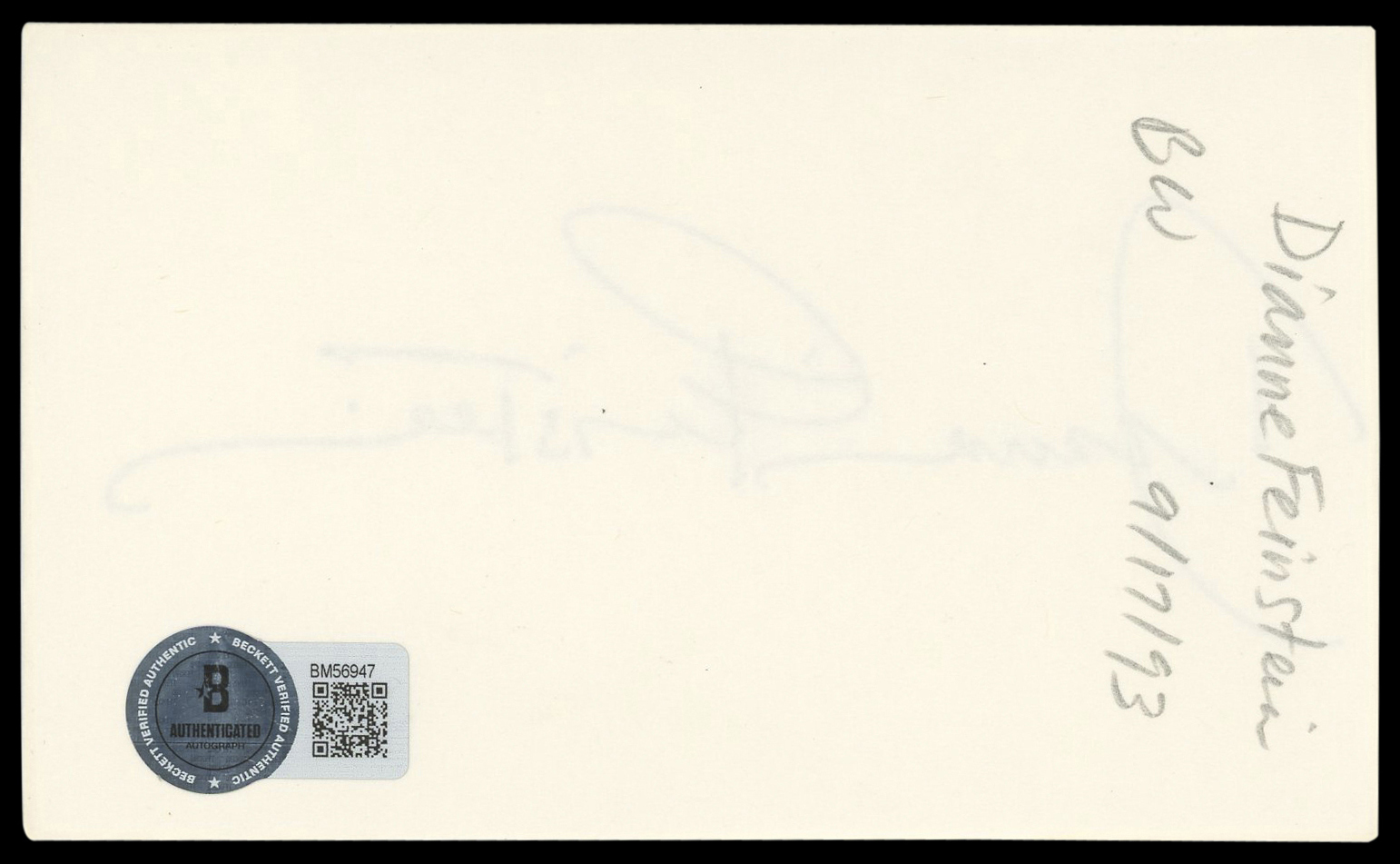 This Autographed 3x5 Index Card has been Personally Signed by Dianne Feinstein. This item is 100% Authentic to include a hologram by Beckett Authentication Services. This item will come with an affixed Beckett Authentication Services (BAS) authentication sticker, which includes a scannable QR code to verify authenticity. Please note that Beckett no longer provides serial-numbered COA cards, and the attached BAS sticker will serve as the complete authentication for this item. The authenticity can be verified on Beckett Authentication Services website.