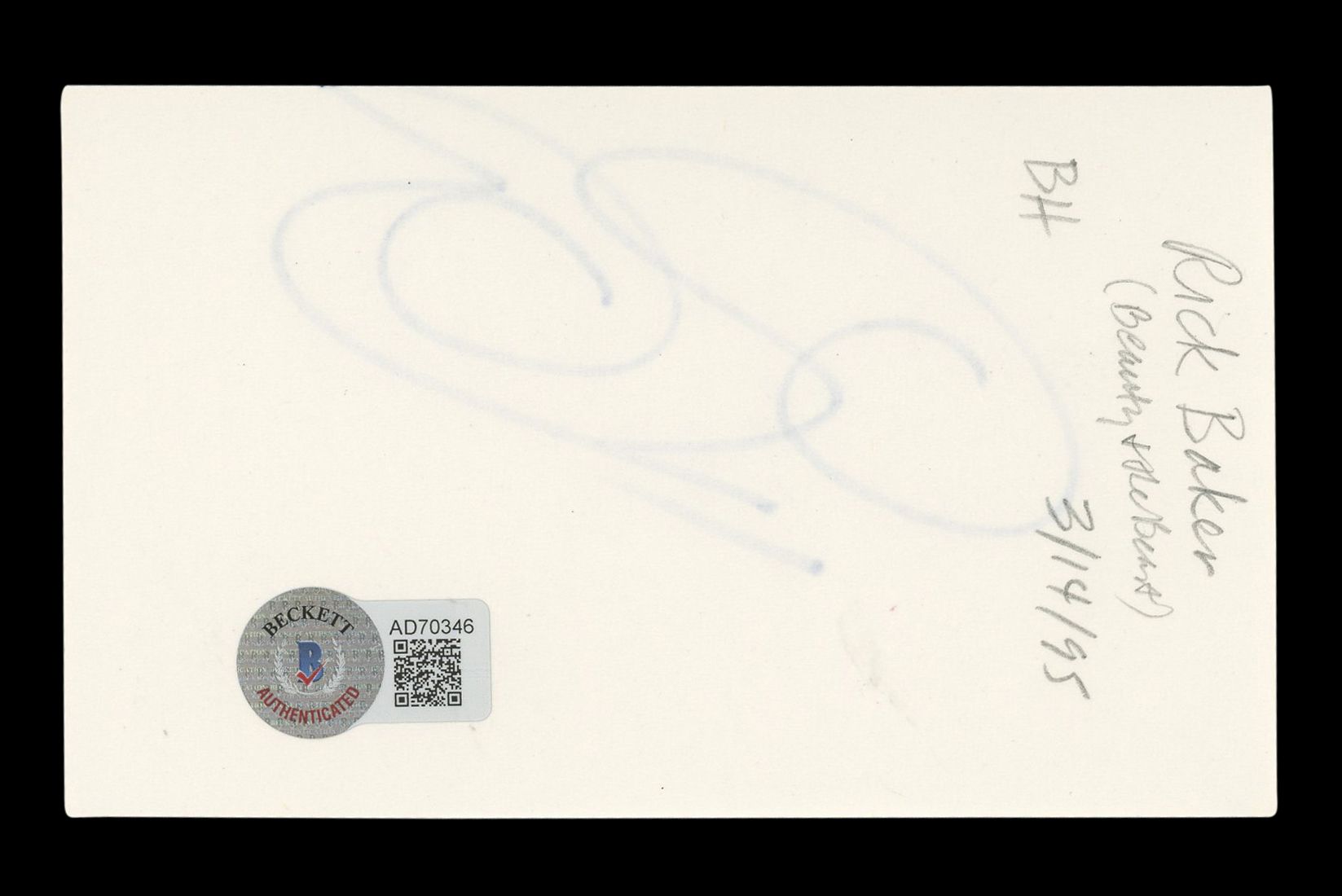 This Autographed 3x5 Index Card has been Personally Signed by Rick Baker of Planet of the Apes. This item is 100% Authentic to include a hologram by Beckett Authentication Services. This item will come with an affixed Beckett Authentication Services (BAS) authentication sticker, which includes a scannable QR code to verify authenticity. Please note that Beckett no longer provides serial-numbered COA cards, and the attached BAS sticker will serve as the complete authentication for this item. The authenticity can be verified on Beckett Authentication Services website.