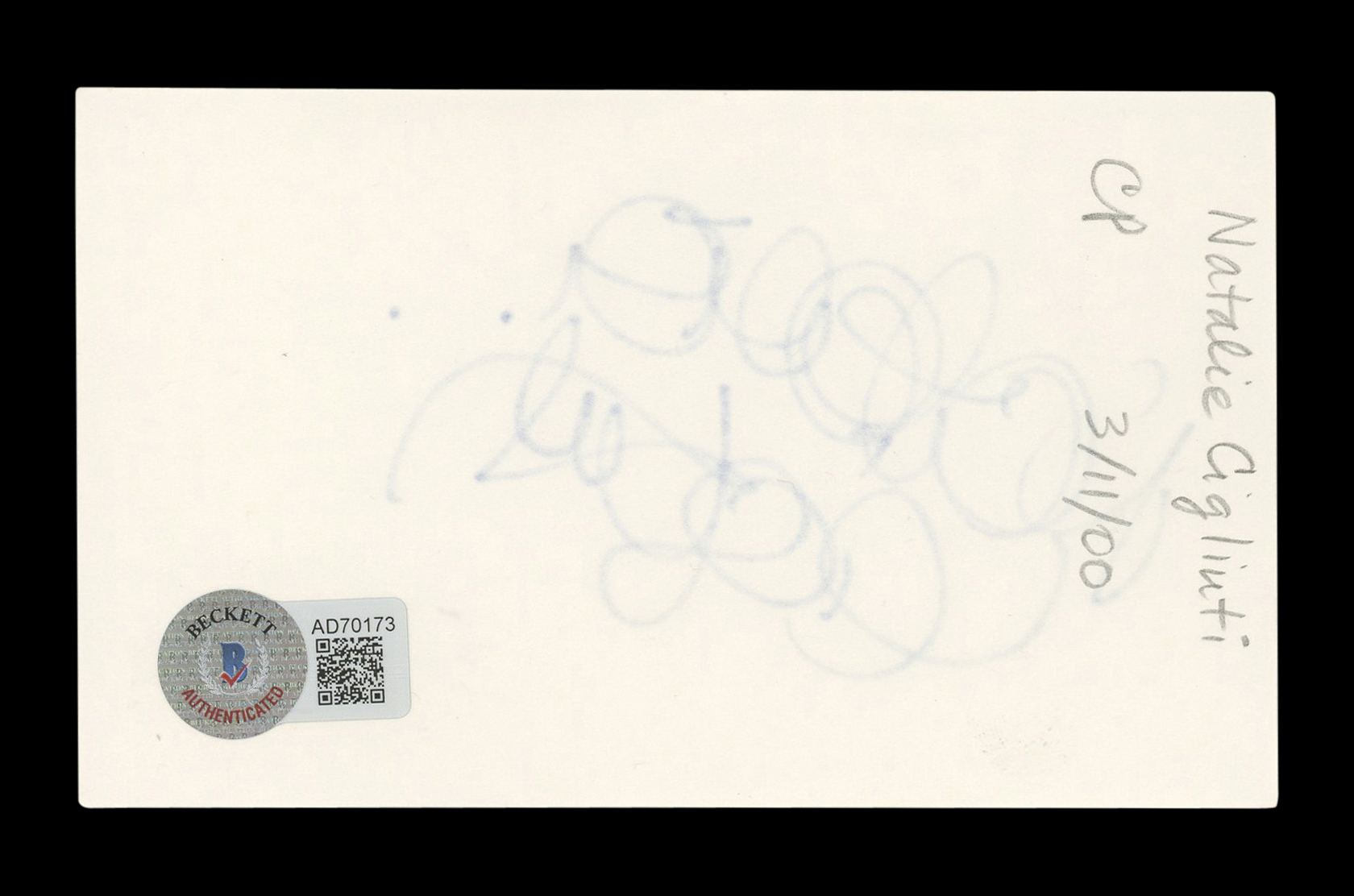 This Autographed 3x5 Index Card has been Personally Signed by Natalia Cigliuti of Saved By The Bell. This item is 100% Authentic to include a hologram by Beckett Authentication Services. This item will come with an affixed Beckett Authentication Services (BAS) authentication sticker, which includes a scannable QR code to verify authenticity. Please note that Beckett no longer provides serial-numbered COA cards, and the attached BAS sticker will serve as the complete authentication for this item. The authenticity can be verified on Beckett Authentication Services website.