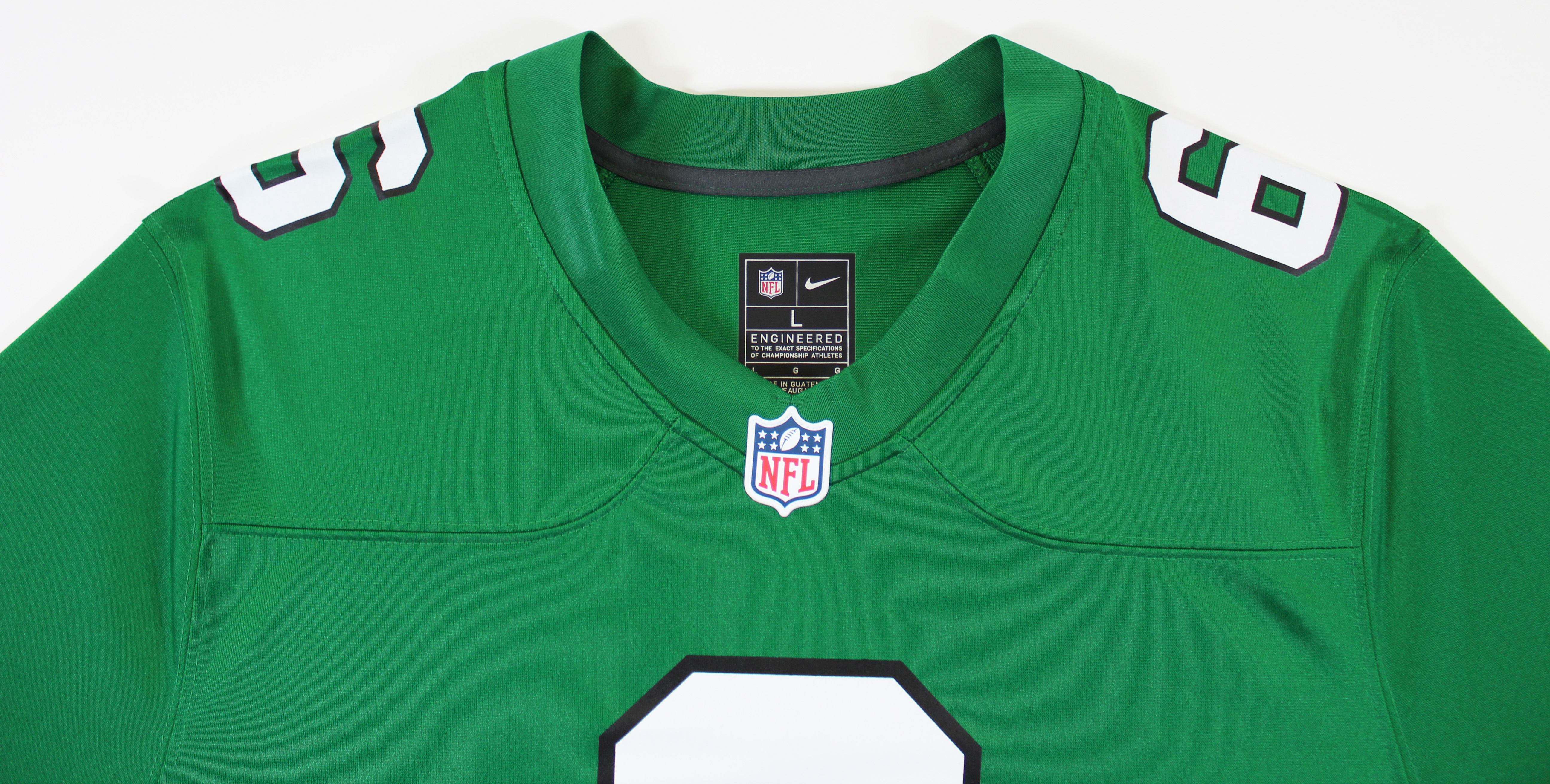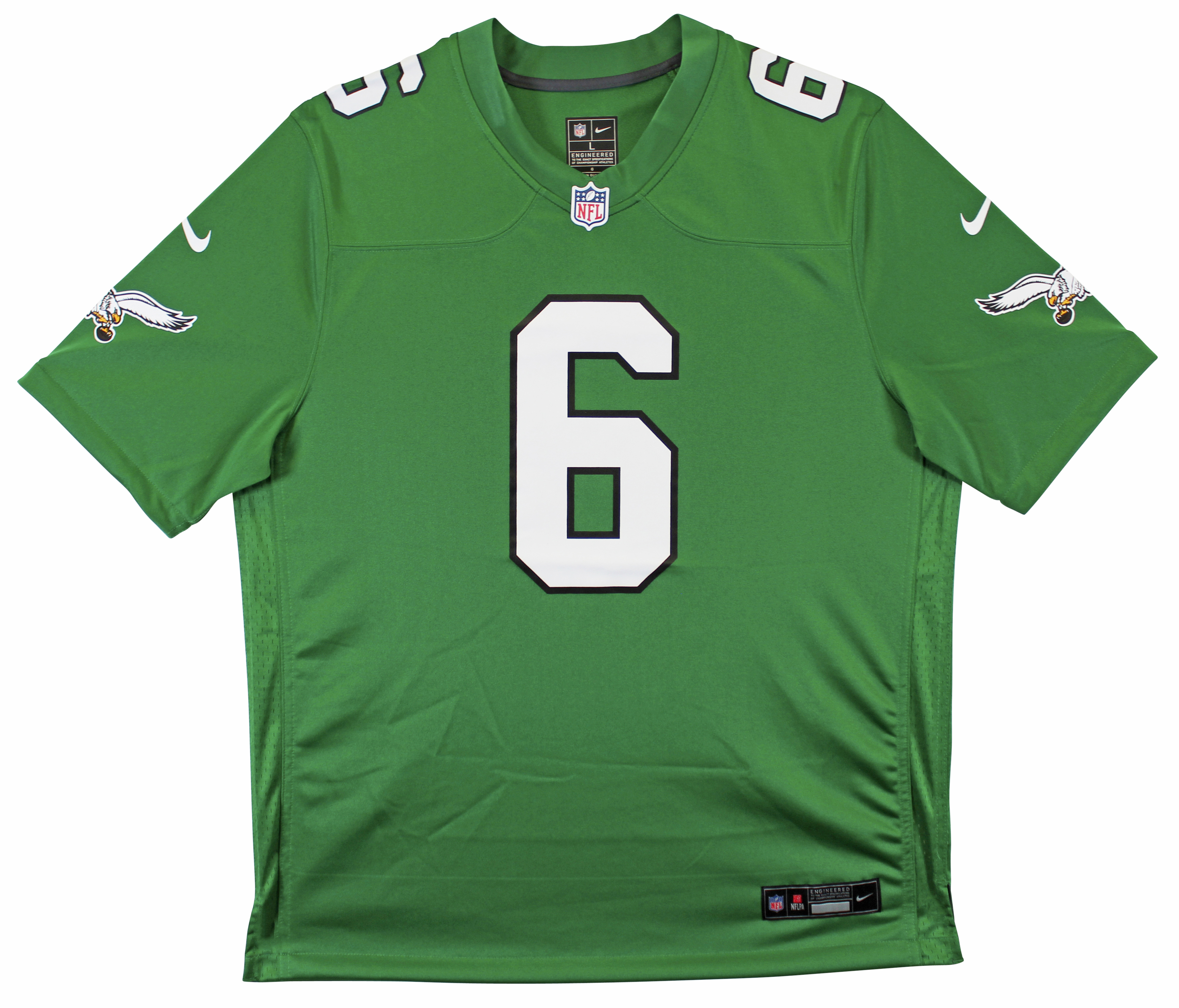 This Autographed Kelly Green Nike Game Jersey has been Personally Signed by DeVonta Smith of the Philadelphia Eagles. This item is 100% Authentic to includes a numbered hologram by Fanatics. We conducted an autograph signing with DeVonta Smith where multiples of the same item were signed. While the photographs are representative of this item, the size, placement and strength of the signature may vary. Each item is hand signed, therefore, each autograph is unique. This item can be verified through Fanatics. This is a X-Large sized Jersey.