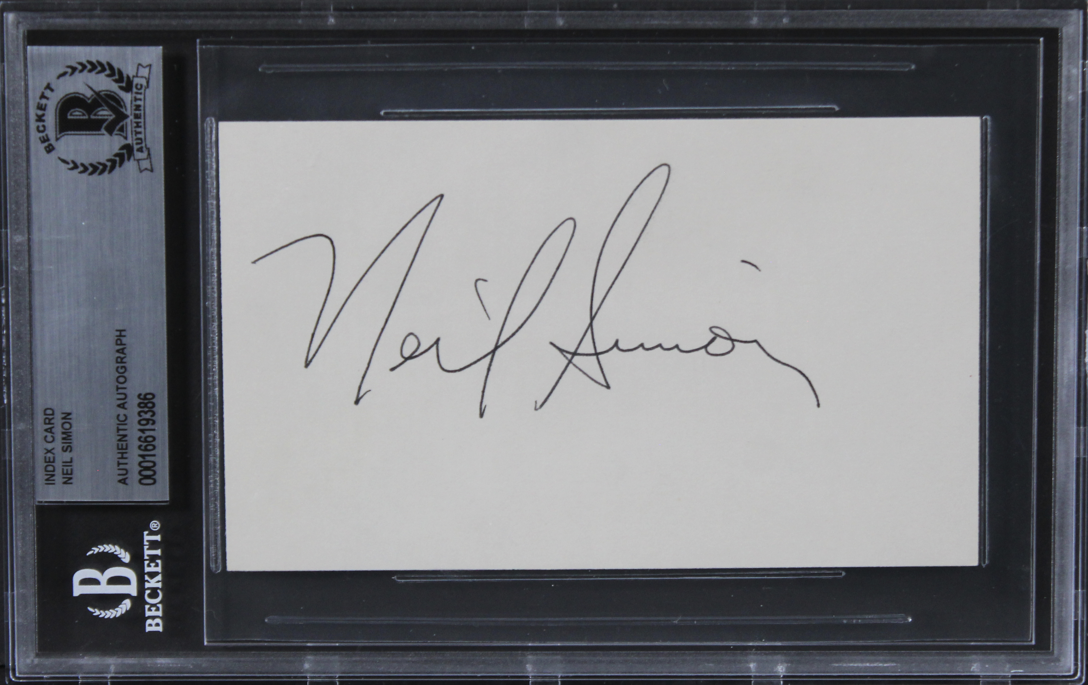 This Autographed 3x5 Index Card has been Personally Signed by Neil Simon of The Odd Couple. This item is 100% Authentic, it comes slabbed and authenticated by Beckett Authentication Services. The authenticity can be verified on Beckett Authentication Services website.