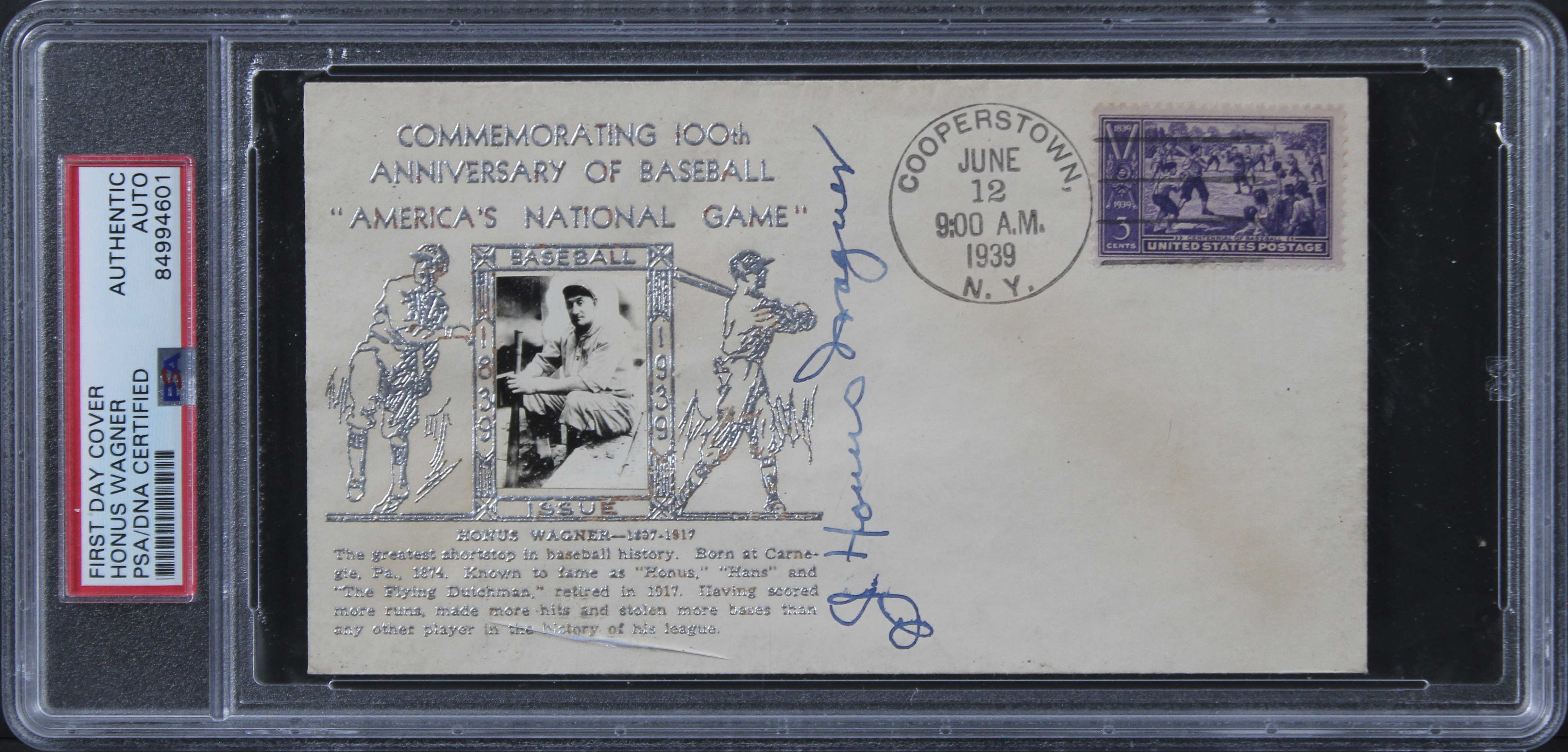 This Autographed Postmarked June 12 1939 Baseball's 100th Anniversary Commemorative First Day Cover Envelope has been Personally Signed by Honus Wagner of the Pittsburg Pirates. This item is 100% Authentic, it comes slabbed and authenticated by PSA. This item is not autographed. The authenticity can be verified on Professional Sports Authenticator website.