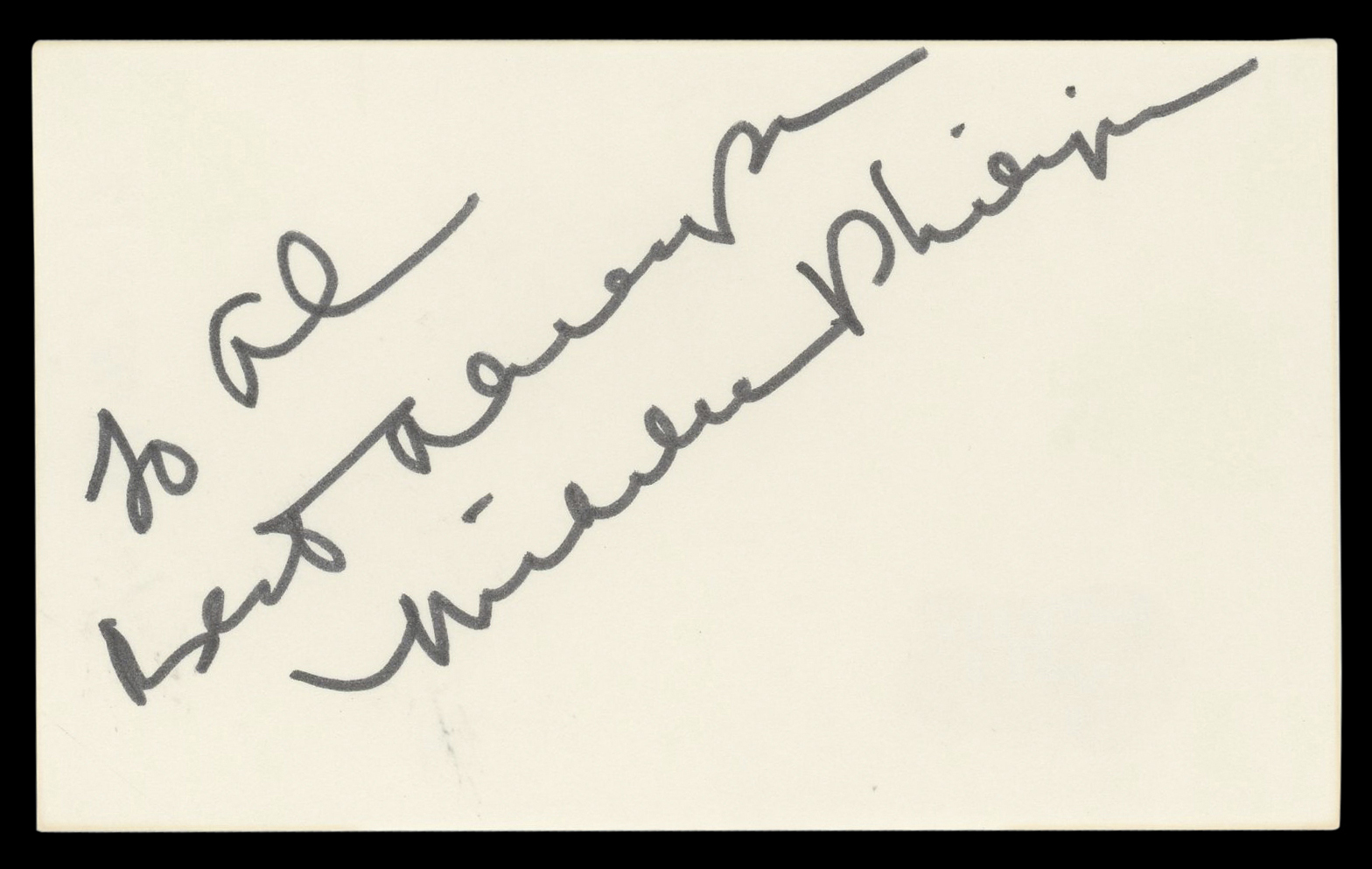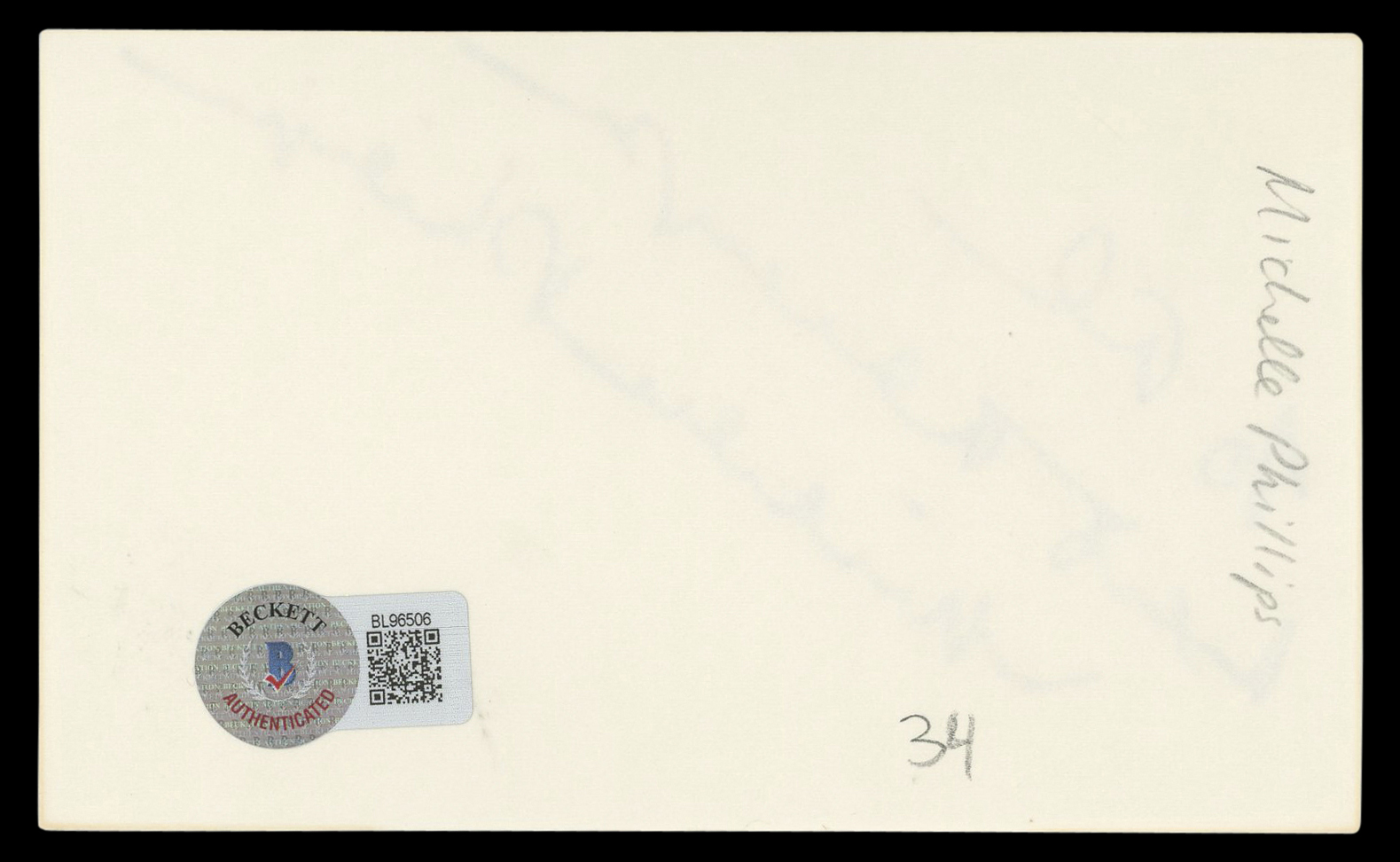 This Autographed 3x5 Index Card with the inscription of "To Al Best Wishes" has been Personally Signed by Michelle Phillips of Knots Landing. This item is 100% Authentic to include a hologram by Beckett Authentication Services. This item will come with an affixed Beckett Authentication Services (BAS) authentication sticker, which includes a scannable QR code to verify authenticity. Please note that Beckett no longer provides serial-numbered COA cards, and the attached BAS sticker will serve as the complete authentication for this item. The authenticity can be verified on Beckett Authentication Services website.