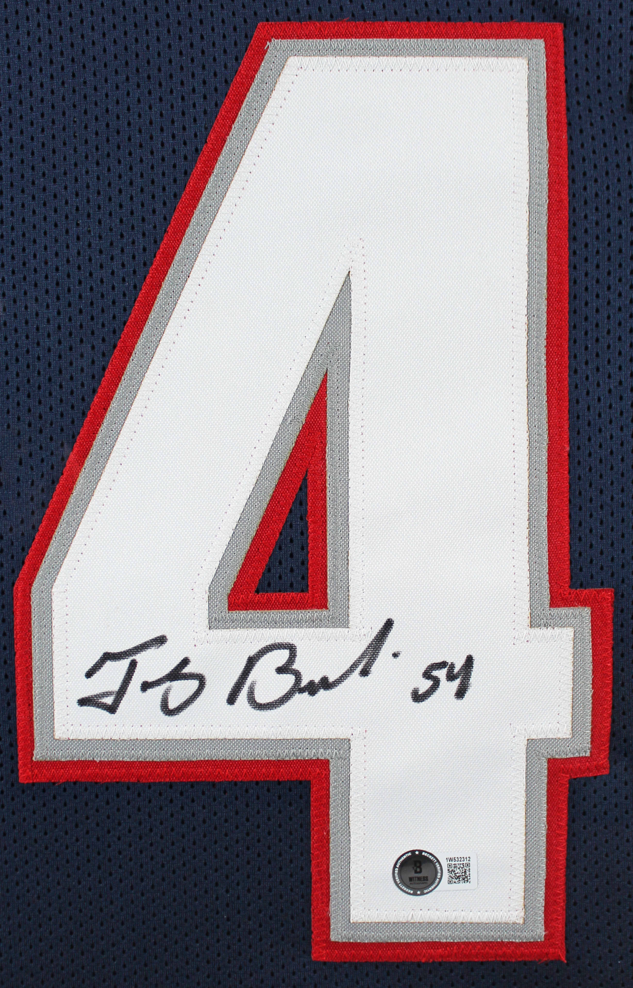 This Autographed Navy Blue Pro Style Framed Jersey has been Personally Signed by Tedy Bruschi of the New England Patriots. This item is 100% Authentic to include a hologram by Beckett Authentication Services. This item will come with an affixed Beckett Authentication Services (BAS) authentication sticker, which includes a scannable QR code to verify authenticity. Please note that Beckett no longer provides serial-numbered COA cards, and the attached BAS sticker will serve as the complete authentication for this item. This is a BAS Witnessed Protection Program item which means a Beckett Authentication Service representative was present when this item was being signed. We conducted an autograph signing with Tedy Bruschi where multiples of the same item were signed. While the photographs are representative of this item, the size, placement and strength of the signature may vary. Each item is hand signed, therefore, each autograph is unique. This item can be verified through BAS Witnessed. This item has been professionally framed to overall dimensions of approximately 32 x 37 inches. This is a X-Large sized, non-branded, custom-stitched Framed Jersey. These jerseys are framed to order, it takes approximately 3-4 business days for framing to be completed.