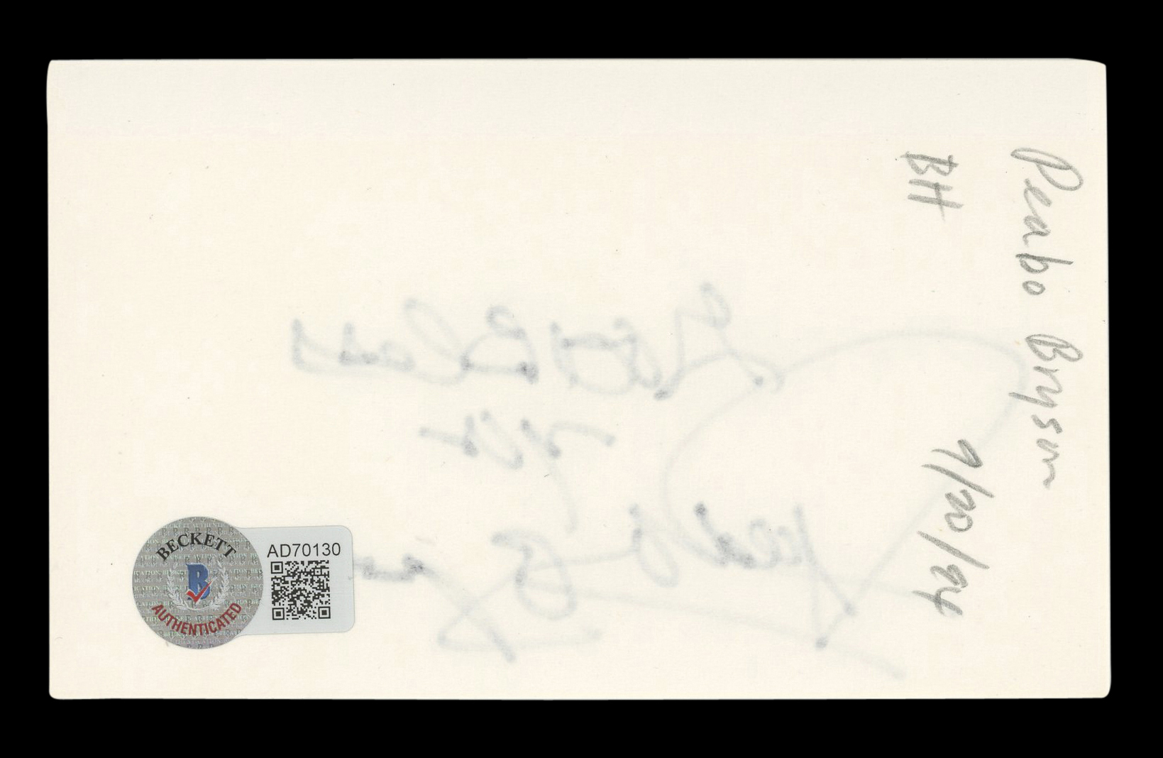 This Autographed 3x5 Index Card has been Personally Signed by Peabo Bryson of Singer. This item is 100% Authentic to include a hologram by Beckett Authentication Services. This item will come with an affixed Beckett Authentication Services (BAS) authentication sticker, which includes a scannable QR code to verify authenticity. Please note that Beckett no longer provides serial-numbered COA cards, and the attached BAS sticker will serve as the complete authentication for this item. The authenticity can be verified on Beckett Authentication Services website.