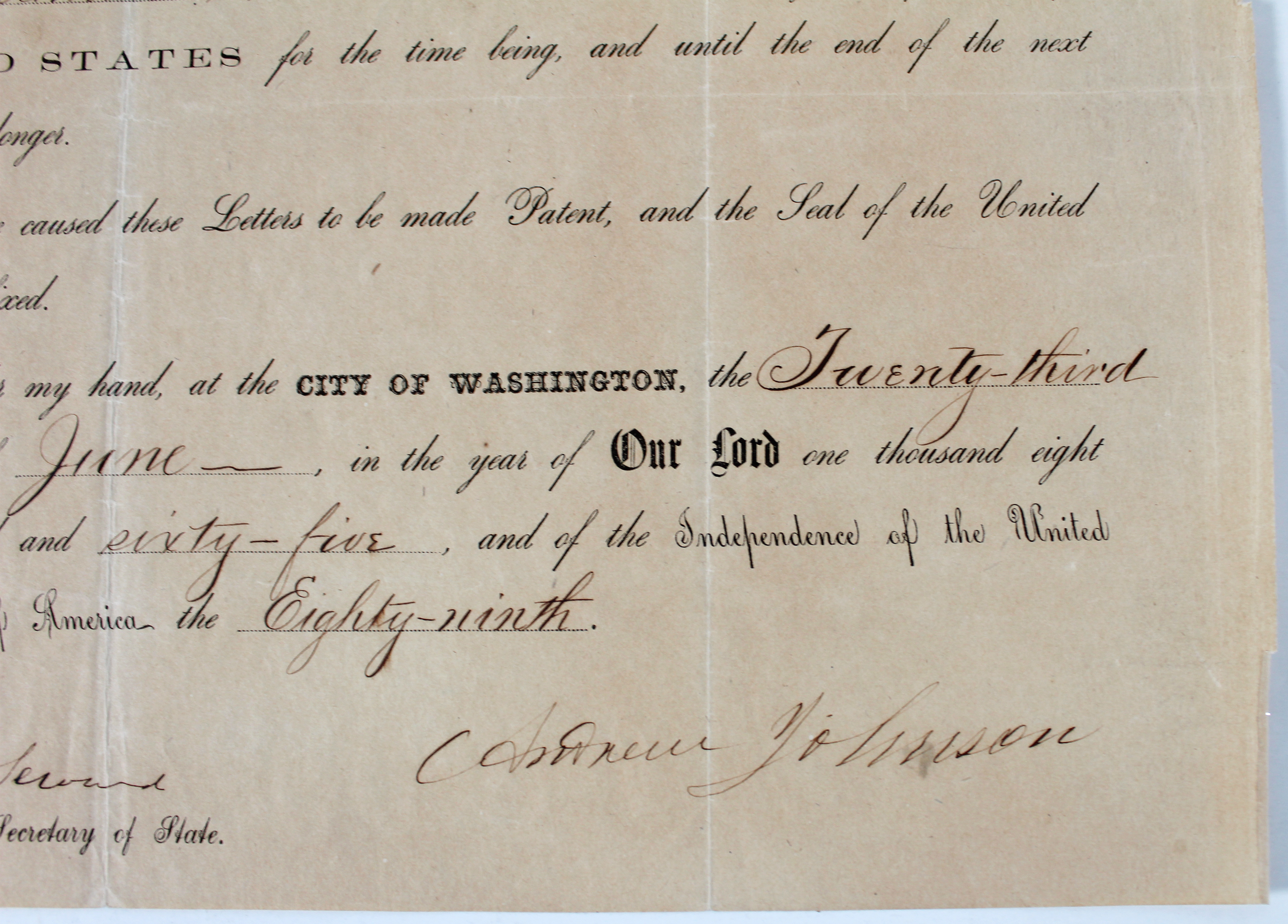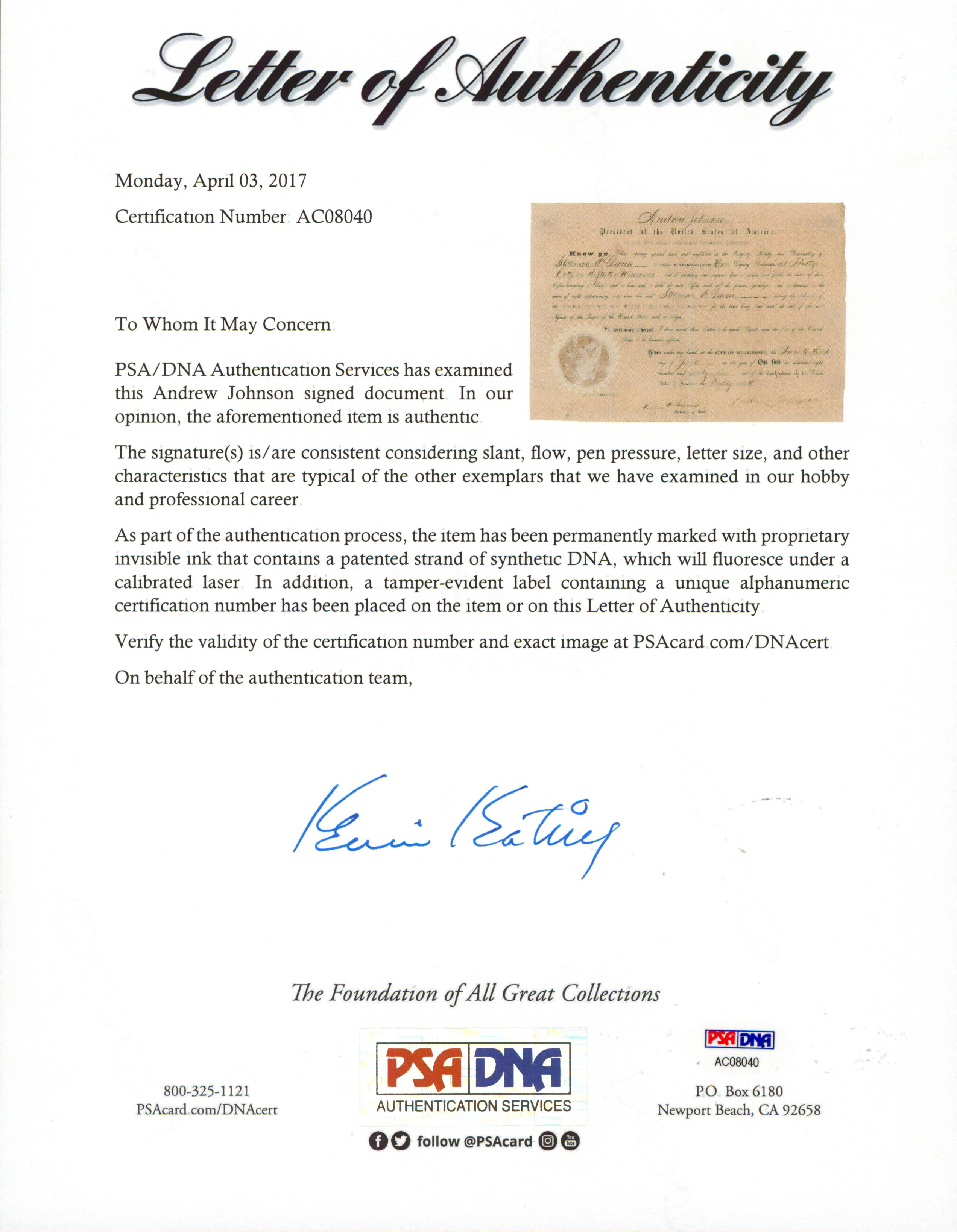 This Autographed 9.65x13.85 Appointment Dated June 23, 1865 Document has been Personally Signed by Andrew Johnson. This item is 100% Authentic and comes with a PSA/DNA Certification Card and a matching numbered Hologram. The authenticity can be verified on Professional Sports Authenticator website.