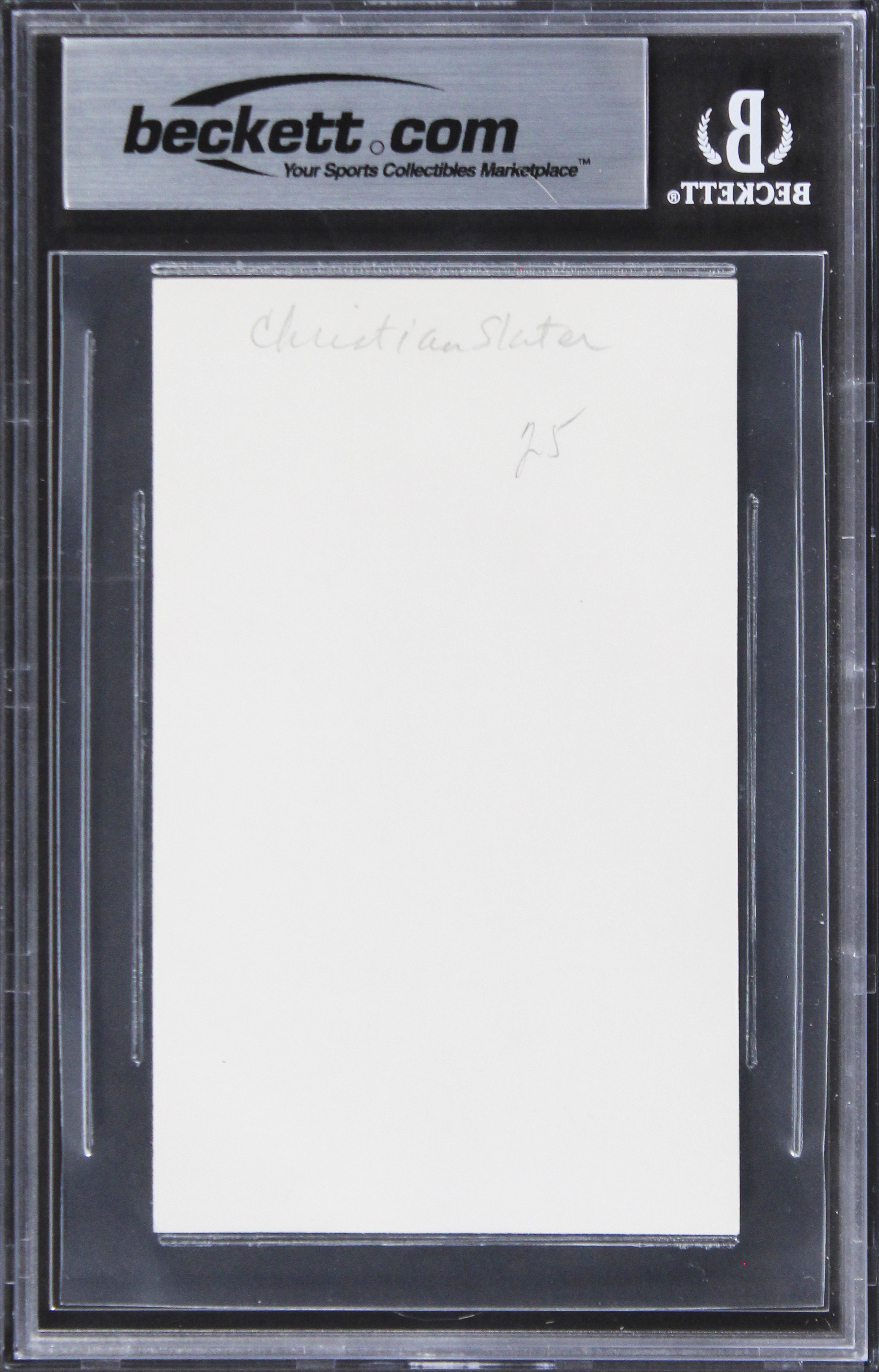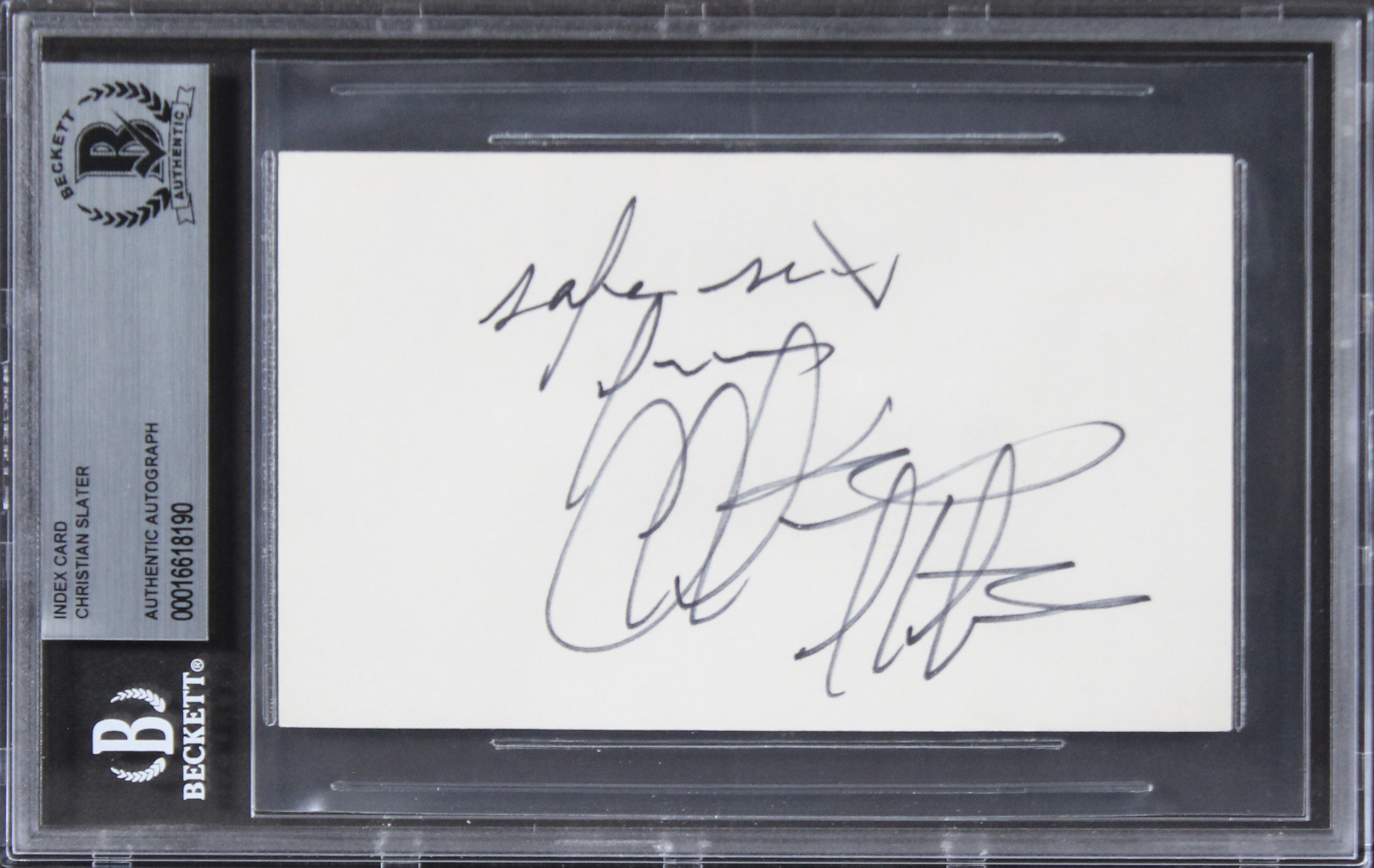 This Autographed 3x5 Index Card has been Personally Signed by Christian Slater of Heathers. This item is 100% Authentic, it comes slabbed and authenticated by Beckett Authentication Services. The authenticity can be verified on Beckett Authentication Services website.
