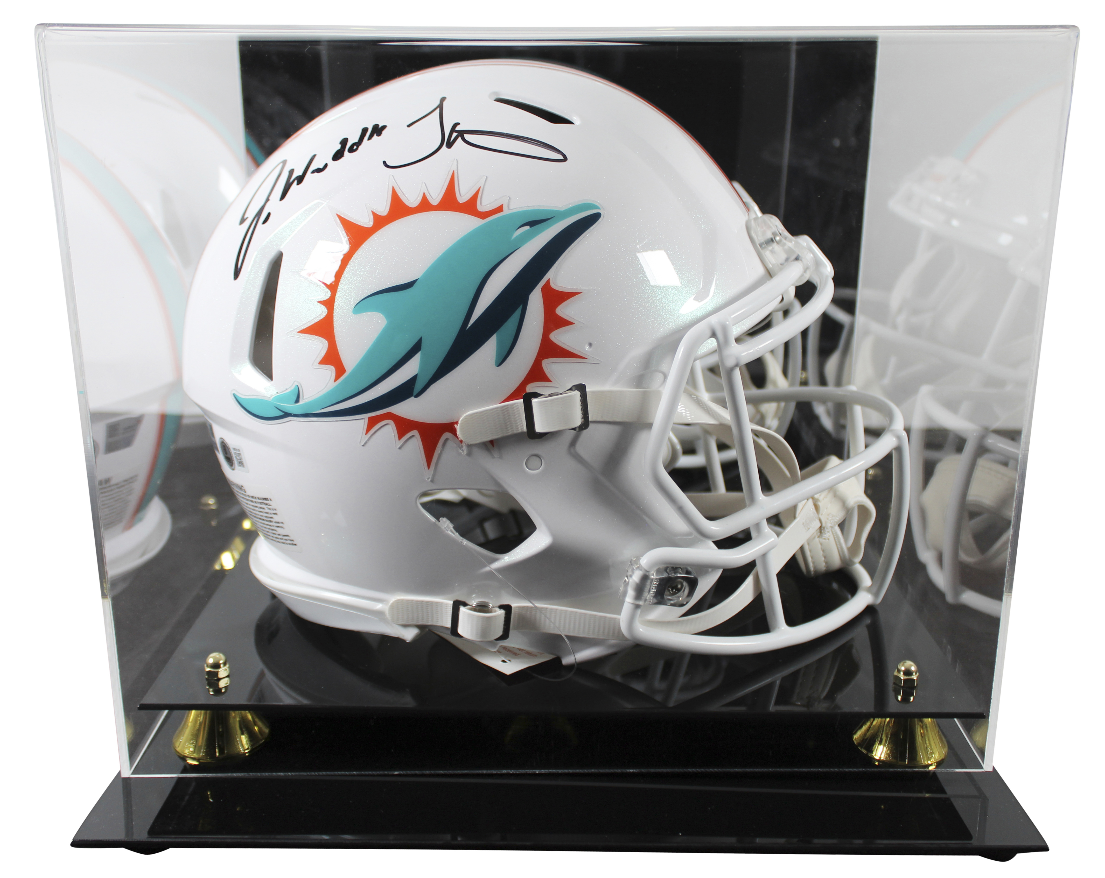 This Autographed Riddell Full Size Speed Proline Helmet W/ Uv Mirrored Back Acrylic Display Case has been Personally Signed by Jaylen Waddle & Tyreek Hill of the Miami Dolphins. This item is 100% Authentic to include a hologram by Beckett Authentication Services. This item will come with an affixed Beckett Authentication Services (BAS) authentication sticker, which includes a scannable QR code to verify authenticity. Please note that Beckett no longer provides serial-numbered COA cards, and the attached BAS sticker will serve as the complete authentication for this item. This is a BAS Witnessed Protection Program item which means a Beckett Authentication Service representative was present when this item was being signed. We conducted an autograph signing with Jaylen Waddle & Tyreek Hill where multiples of the same item were signed. While the photographs are representative of this item, the size, placement and strength of the signature may vary. Each item is hand signed, therefore, each autograph is unique. This item can be verified through BAS Witnessed.