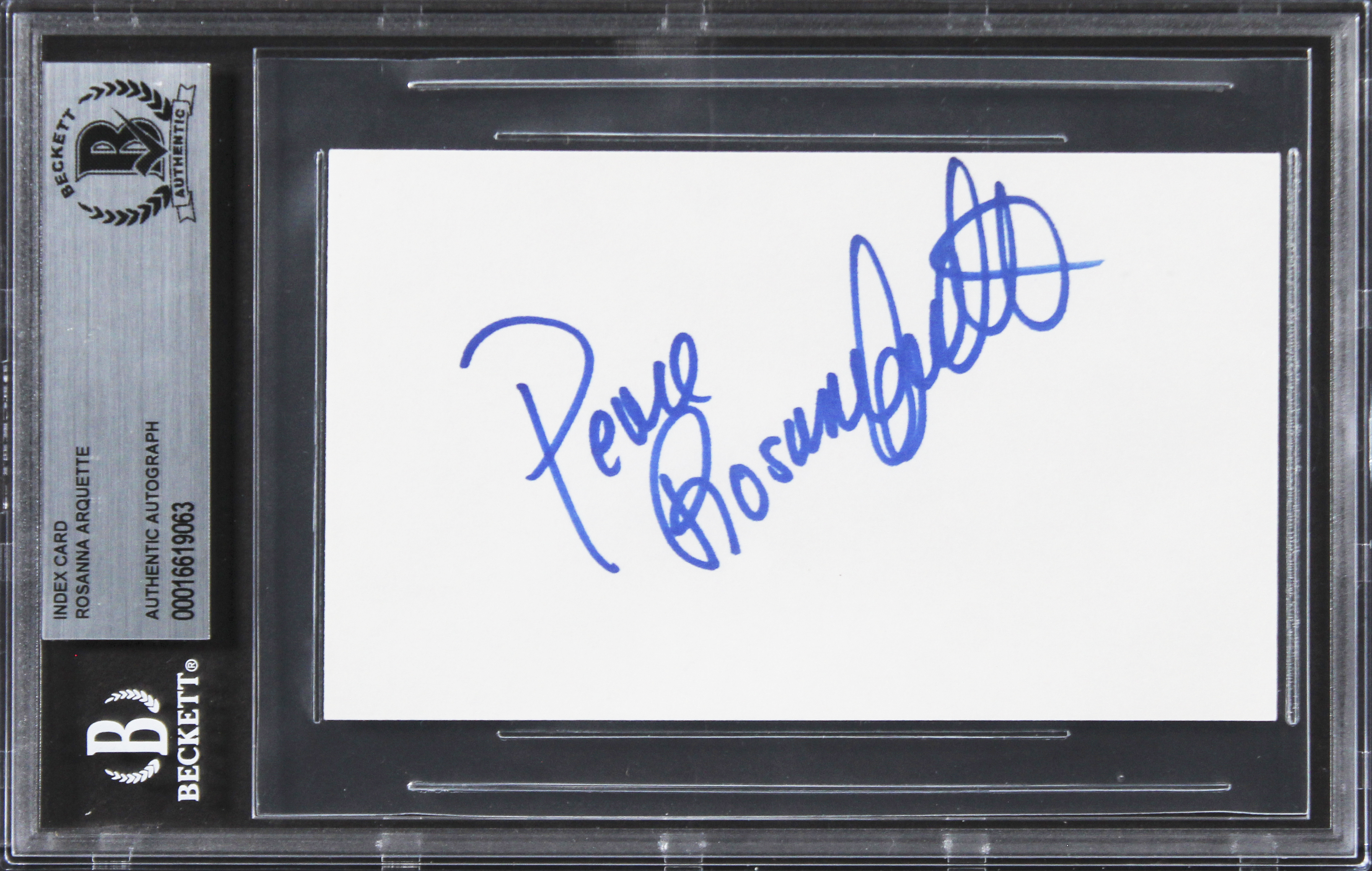 This Autographed 3x5 Index Card has been Personally Signed by Rosanna Arquette of Pulp Fiction. This item is 100% Authentic, it comes slabbed and authenticated by Beckett Authentication Services. The authenticity can be verified on Beckett Authentication Services website.