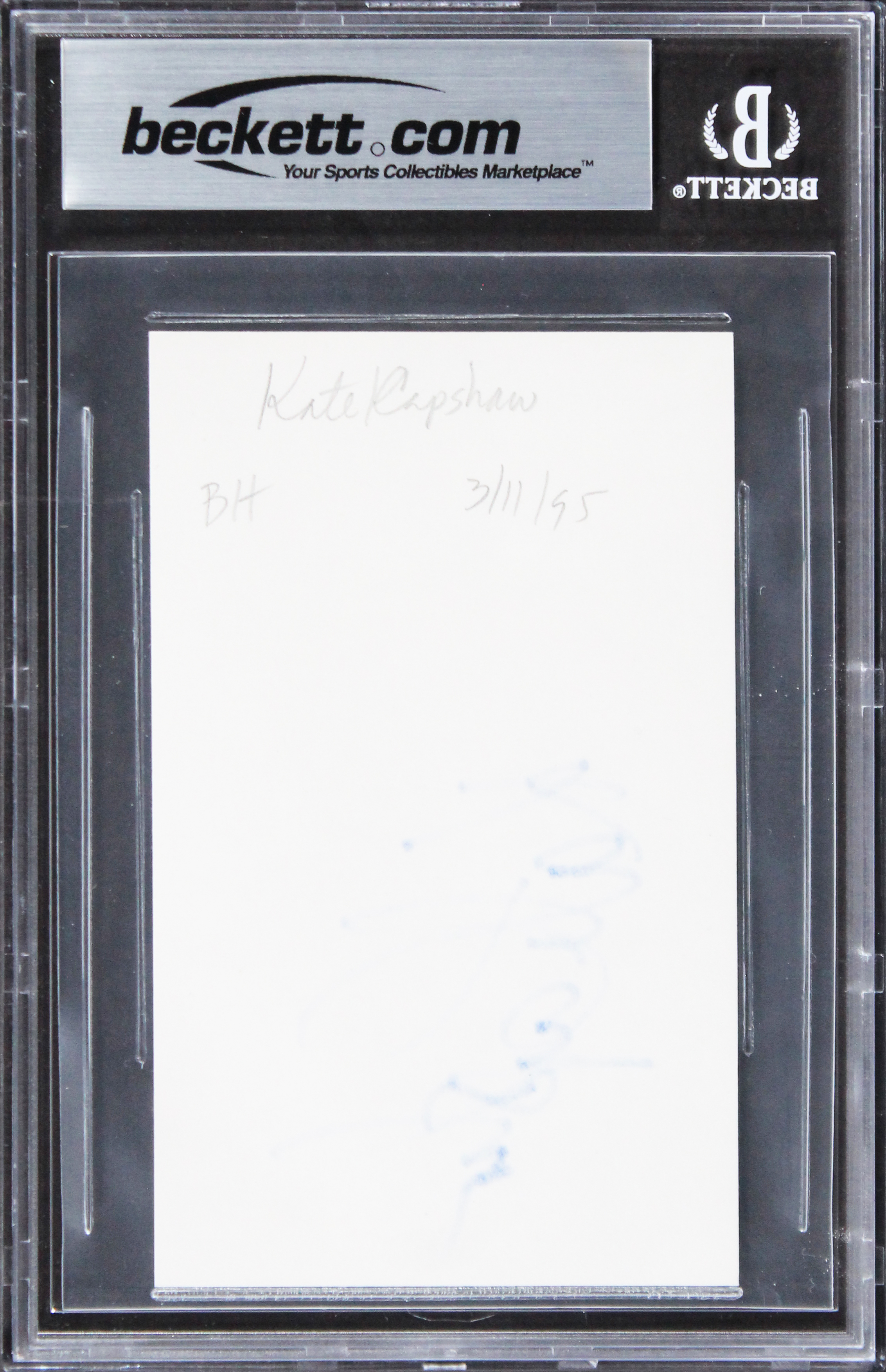 This Autographed 3x5 Index Card has been Personally Signed by Kate Capshaw of Indiana Jones. This item is 100% Authentic, it comes slabbed and authenticated by Beckett Authentication Services. The authenticity can be verified on Beckett Authentication Services website.