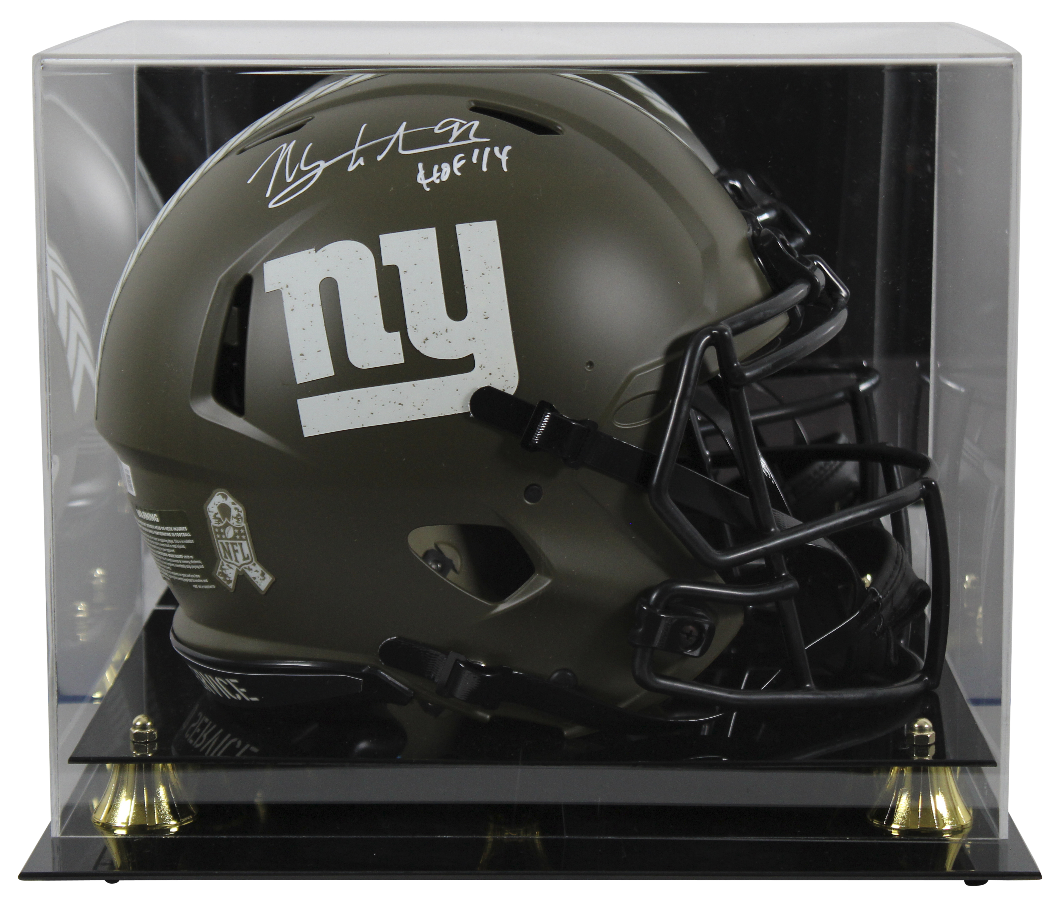 This Autographed Alternate Salute To Service Riddell Full Size Speed Proline Helmet W/ Uv Mirrored Back Acrylic Display Case with the inscription of "HOF 14" has been Personally Signed by Michael Strahan of the New York Giants. This item is 100% Authentic to include a hologram by Beckett Authentication Services. This item will come with an affixed Beckett Authentication Services (BAS) authentication sticker, which includes a scannable QR code to verify authenticity. Please note that Beckett no longer provides serial-numbered COA cards, and the attached BAS sticker will serve as the complete authentication for this item. This is a BAS Witnessed Protection Program item which means a Beckett Authentication Service representative was present when this item was being signed. We conducted an autograph signing with Michael Strahan where multiples of the same item were signed. While the photographs are representative of this item, the size, placement and strength of the signature may vary. Each item is hand signed, therefore, each autograph is unique. This item can be verified through BAS Witnessed.